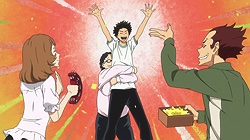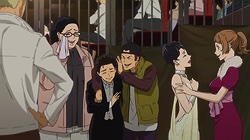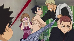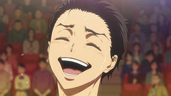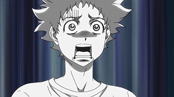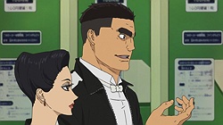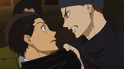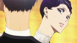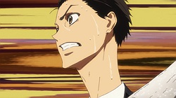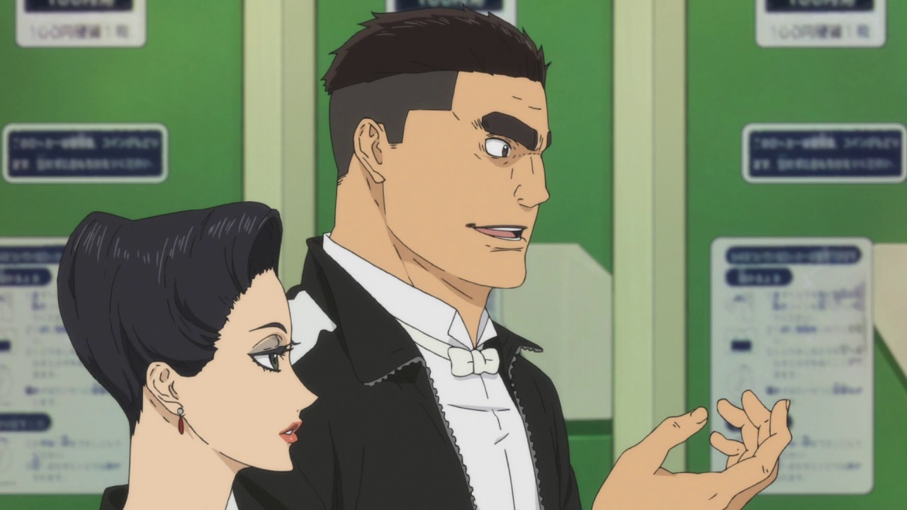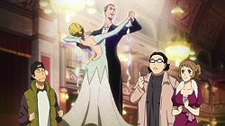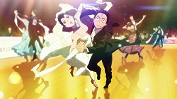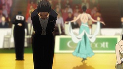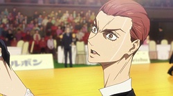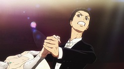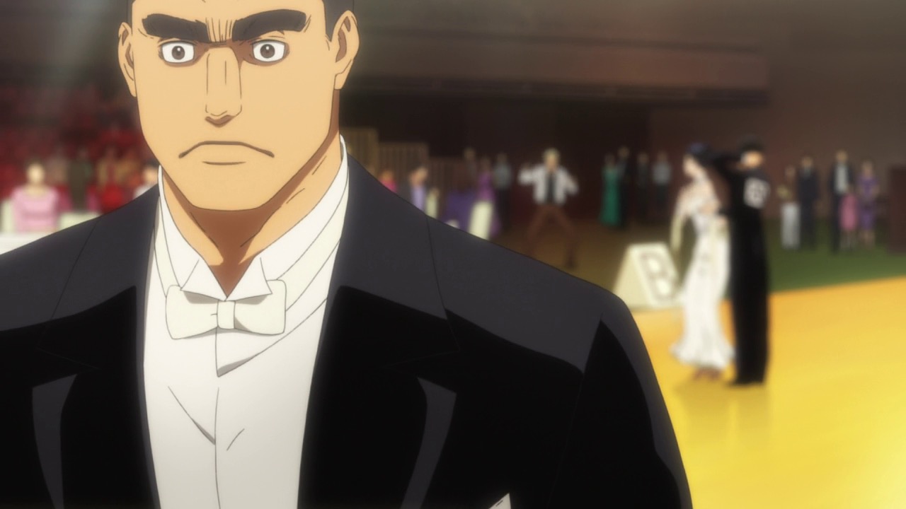 This might not be a bad time for younger anime fans to Google “Wally Pipp”.This was kind of a big episode of Ballroom e Youkoso for me, as it’s the first “new” one I’ve seen given the preview screening at Anime Expo. And while I get some of the concerns about this series – even share them to an extent – I can’t deny that I was pretty swept up by what was happening on screen. I think the show has improved each week, and that’s always a good sign.One issue some have raised is the rather stereotypical fanservice moments – most obviously the “accidental peeping” but also stuff like Sengoku yanking Shizuku’s dress down this week. Yeah, I can live without it too – but a little context is merited here, I think. In the world of shounen manga you’re dealing with an audience that’s accustomed to formula. You have a few chapters to try and win readers over – because if you don’t, your series is going to be axed. Shounen’s a cutthroat world for new manga, with many failed trial runs for every serialization, and you have to make an impression any way you can. Somebody like Arakawa or Togashi can take their time and do what they want – a new writer like Takeuchi-sensei cannot. Maybe that sounds like an excuse, but it’s also reality. And I don’t see anything egregious with Ballroom by any means.I won’t claim to be an expert, but I suspect that ballroom dance is one of those semi-mystical aspects of Western culture in Japan – it’s literally and substantively quite foreign and has more than a whiff of the exotic to it. That’s why the rather grand, storybook tone of Welcome to the Ballroom seems to fit – we’re seeing this world through Tatara’s eyes. And when he goes backstage at the Prince Mikasa Cup, those eyes are wide indeed (one almost wants to call his “That person has such long a long neck!” comment an inside joke, but it’s surely unintentional). These people (even Shizuku and Kiyoharu to an extent) are like Gods to Tatara-kun.One of those people we meet backstage is Iwakuma Yoshinori (Yuusen Isamu), a rival of Sengoku that he calls “The Gorilla”. He’s going to be important, because through an accidental encounter in the men’s room we see that Hyodo-kun is having knee problems – he’s using athletic tape – and later, after swamping the Latin competitors, he doesn’t show up for the waltz preliminaries. In fact we see him crumpled at the foot of the stairs (what is it with this kid and stairs?) with Iwakuma-san standing at the top – and the implication is that Iwakuma, frustrated at forever finishing second, pushed him. Personally I don’t believe that happened – I think Hyodo’s knee simply gave out and Iwakuma happened to be with him at the time.This is where things get a little wild. I don’t know the rules of these competitions and they aren’t explained in detail, but my presumption is that Shizuku simply has to survive the heats and reach the finals – but what happens if she has a different partner? For Sengoku to push Tatara into this – even if it is the waltz – is obviously an enormous risk. But the truth is, what we see of Sengoku tells us that he’s a great dancer and a terrible dance teacher. He doesn’t offer encouragement, only insults, and can’t be bothered to deliver any actual instruction himself. By pushing Tatara into dancing with Shizuku here he’s risking a trauma that could not just ruin the lad’s dancing career, but his life – destroying not just his confidence in dance but across the board (and he doesn’t have any to spare). But for Sengoku, it’s perfectly in character.However it’s set up, this last third of the episode is splendid drama. Tatara is obviously terrified, but what saves him is that he remembers watching Hyodo’s choreography – the problem is, he’s only seen the first part of it. That means he has to wing his own choreography after that – a huggermugger amalgam of practice moves like “The Whisk” and high-level flash like the “High Hover”. The point is, Tatara is a natural – watch, learn, adapt. All through this tense madness I was wondering how he’d managed to fit into the tuxedo, but then he tripped over his pants hem at the very end – which I suppose answered that question.I have no idea where this leaves Shizuku (or Tatara for that matter) in the competition – are they disqualified for switching partners? Would they make the grade even if not? But what’s most interesting is Kiyoharu’s reaction – he grabs Tatara by the scruff and screams “Give it back!”. Obviously we’re intended to muse over what he means, though my feeling is that he’s talking about his choreography (as opposed to Shizuku-san, which is the crucial point). We’ll see – and it remains interesting to speculate on just how this triangle is going to play out. Ballroom e Youkoso has definitely accomplished the hard part – I’m wrapped up in what happens now.