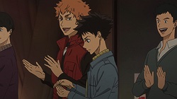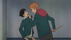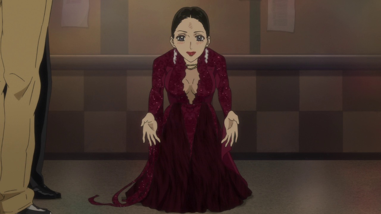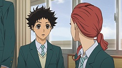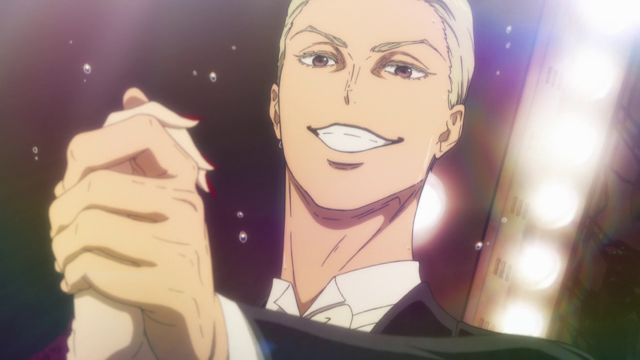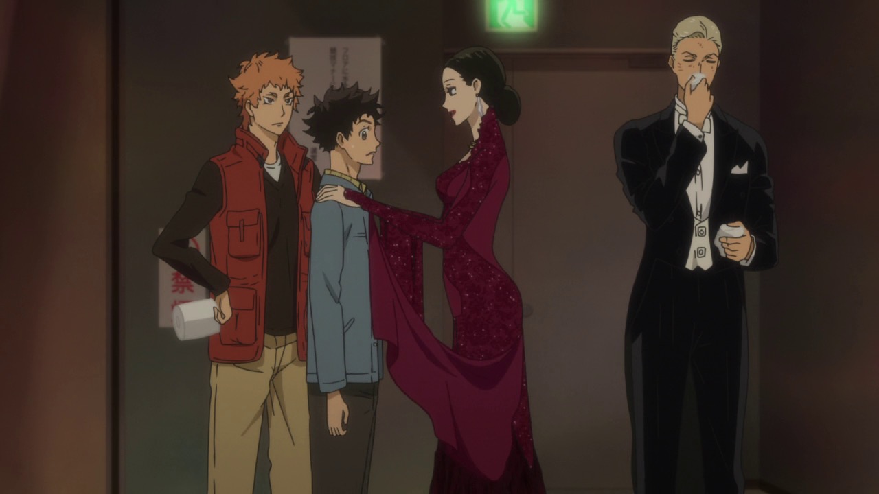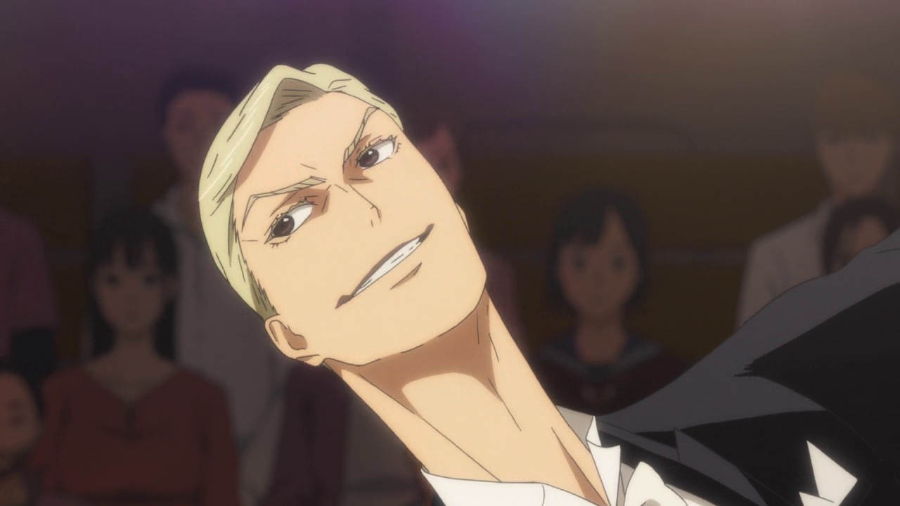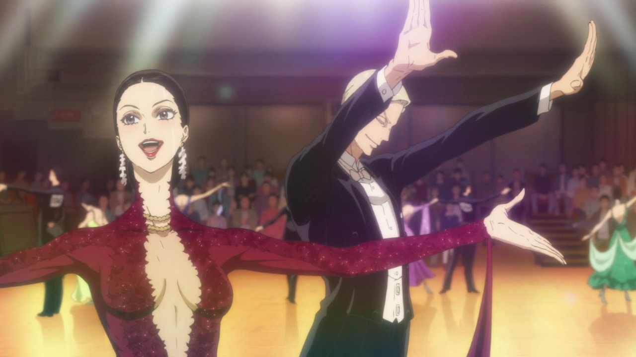 We may still technically be in the first cour of Ballroom e Youkoso, but the scene change unmistakably happened after last week’s episode. Without any question a major reset button has been pushed here – new school, new characters, new relationships between the old ones, and a sense that the nature of the journey for Tatara-kun has thoroughly changed. And along with that, the challenges facing him. As he advances in his craft and is capable of achieving more, the goals he strives for are going to get that much more difficult. But then – that’s shounen in a nutshell.As far as I’m concerned it would be hard to draw up an episode to kick off the second act better than “Encounters” did – it pretty much nailed everything it set out to do and was massively entertaining from start to finish. The first day of the rest of Tatara’s life starts with the first day of high school (I enjoyed his realistic goal of making “lots of friends – like 5”), which is always a scary one in any shy kid’s life. I liked that Ballroom opened right up with the introductions, because the issue of admitting to being a dancer is a serious one for a boy – old-fashioned and narrow-minded attitudes (which high school specializes in) make that a minefield to say the least.Tatara, to his credit, doesn’t shy away from the truth – he’s proud of it in spite of his anxiety. And it doesn’t seem too disastrous at first (though the teacher really should have kept his mouth shut), but that’s when Hiyama Chinatsu (Akasaki Chinatsu) enters the fray. She pronounces Tatara “lame”, but it’s an ill-kept secret even to non-manga readers that she’s a dancer too (or will be), and is in fact the answer to the math problem that’s been hanging over Welcome to the Ballroom since Gaju and Mako entered the picture (and even before, really).There’s more trouble at school, too, when Tatara (who does make an easy target) runs afoul of the resident bully gang. But fortunately for him, Gaju makes an unlikely return to the story and bails him out. Gaju is unsurprisingly seen as something of a banchou, even by the bullies. And while he blames Tatara for Mako’s inevitable development in the anatomical sense and berates him for shaming the brotherhood of athletes (which he clearly considers himself first), he does offer to exchange numbers with Tatara and it’s clear that these two have enough in common to become friends of a sort. We also get the most natural crossover in anime this year…Meanwhile, Shizuku has been patiently waiting for Kiyoharu’s leg to heal – which it has – and the two of them have decided to defer their trip to study abroad for a year. Partly it’s a concession to Kiyoharu’s condition, but Shizuku also declares that she wants to compete with Tatara again. That’s going to require that he couple up of course, and though we know what’s coming there neither of these two do yet. Obviously Chinatsu’s appearance means all of the major players are paired up, but I can’t shake the feeling that there’s still something simmering between Shizuku and Tatara – either on the dance floor or off (or both).Things really heat up when Tamaki invites Gaju and Tatara to see Sengoku – who’s been overseas himself – in is first major Japanese competition in a year. Sengoku isn’t much of a teacher but he is a great dancer, clearly, and it’s fascinating to see the way Tatara observes him. He sees details Gaju doesn’t (like the way Sengoku’s movements connect up from a muscular perspective) and while Sengoku has encouraged him to watch and learn, one thing Tatara sees is that there are things a man of Sengoku’ stature can do that a boy of Tatara’s stature cannot. Even moving at “half speed” (Gaju’s observation) in the prelims, Sengoku seems to present an ideal that will be forever unachievable for Tatara. But then, a lot of things seem that way when you’re 15, and time is still very much your ally.I think my favorite part of the episode, though, was the introduction of Sengoku’s partner Hongou Chizuru (Kotobuki Minako, in what seems a very against-type – and charismatic – performance). She sweeps through Ballroom like a typhoon, starting with she and Sengoku getting into a bare-knuckle brawl which leaves him bloodied (a regular occurrence, apparently). Her interaction with “the” Tatara-kun is utterly hilarious (especially the “kochi, kochi” bit), but she’s got game – and she and Sengoku sweep through the competition easily. In the aftermath the Sengoku groupies stampede, sweeping Tatara and Gaju up with them – and among them is a familiar face who might, perhaps, look upon Tatara differently once she learns that he’s Sengoku’s student…