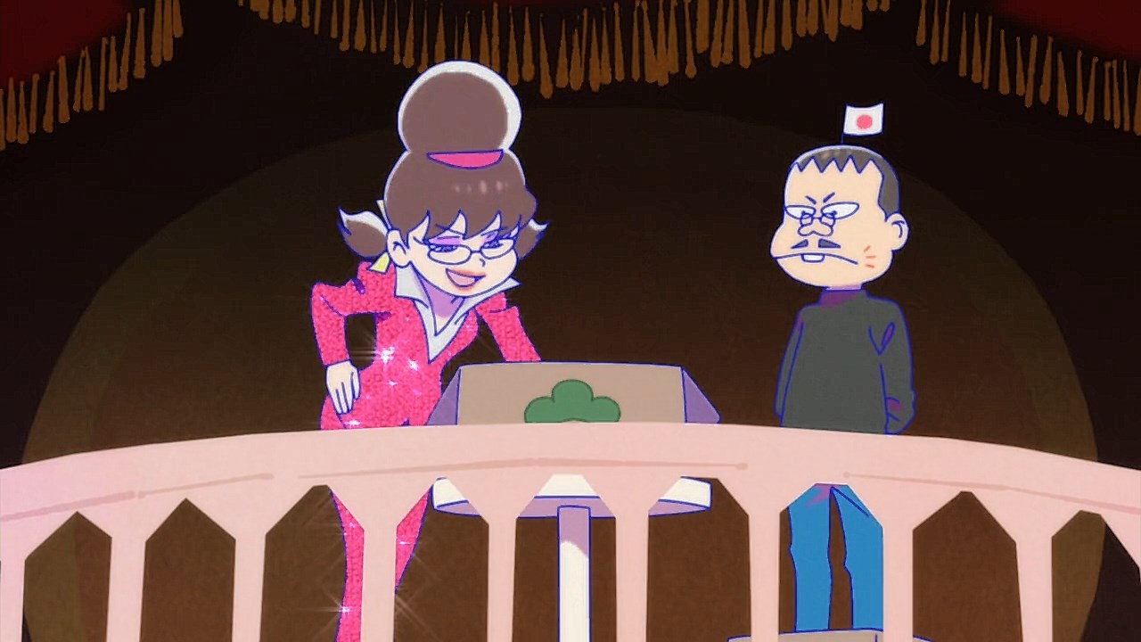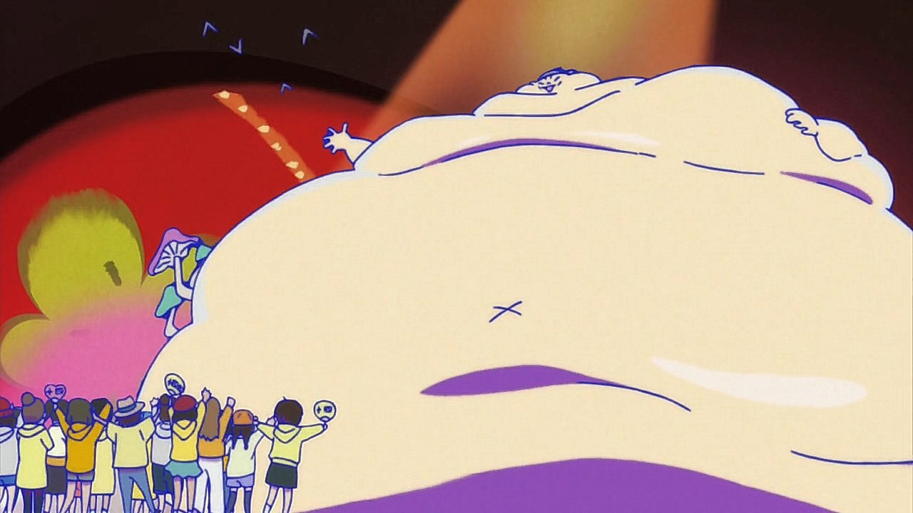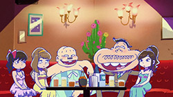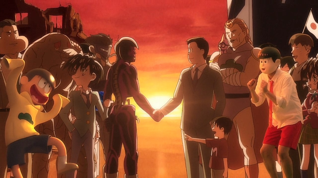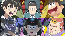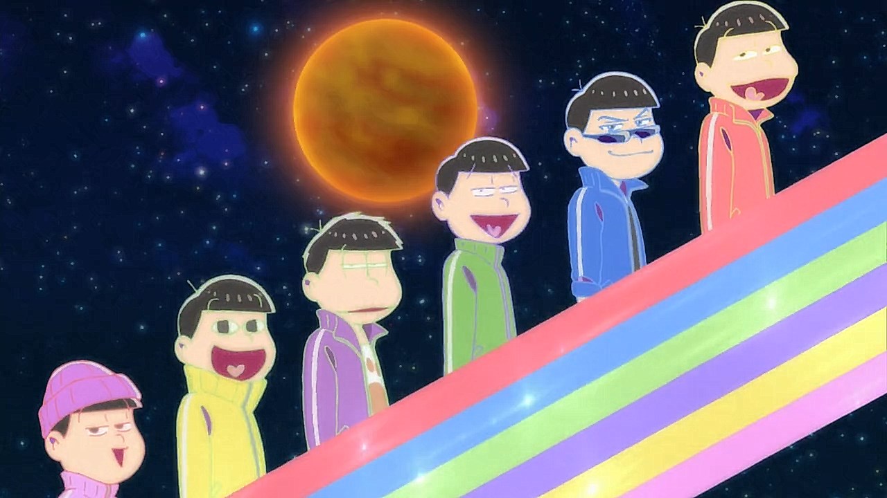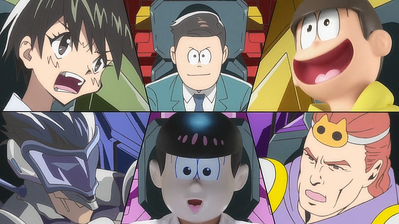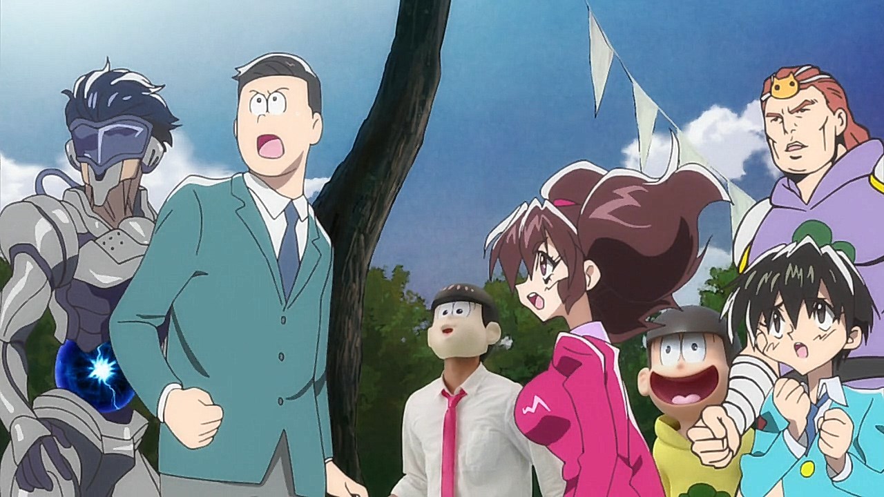 When we first saw the return of Osomatsu (Sakurai Takahiro) in 2015, it was met with legal trouble as the first episode of Osomatsu-san was cut from streaming and DVD release due to copyright infringement. With the sextuplets trying to woo audiences by becoming characters from Shingeki no Kyojin, Naruto, Love Live, Pokemon, Sailor Moon, and just about every other anime under the planet, the first episode set such a high bar for what could follow. The resulting anime ended up being a hilarious re-emergence for the Osomatsu-kun franchise, torpedoing many of the characters into a series of merchandising opportunities, video game spin-offs, and stage shows. The US release for their iOS/Android game was last month, and it’s a relatively fun tower defense game. But with all of the success that has come their way, expectations were high for what exactly can come from another season of Osomatsu-san, especially since the first couple episode dropped many jaws when it first came out. I’m glad to say that they started off on a high note by tweaking the initial formula to make something equally twisted and entertaining.The first half is where the “twisted” part comes in. Much like any sophomore album, they wanted to come right out the gate to acknowledge how much of a hit the first season was, and they expressed this by having the money and fame warp the Matsuno brothers into horrifyingly hedonistic monsters. After Iyami (Suzumura Kenichi) takes a vacation to Trump Tower, him and Chibita (Kokuryu Sachi) are greeted to a new world where the Matsuno’s have a mansion and are steadily enabled in taking their depraved lifestyles to the highest heights to maintain the level of prosperity they’ve had since 2015. As a result, Osomatsu has become an obese kid in an adult body, Karamatsu (Nakamura Yuuichi) becomes an equally massive pop star, Choromatsu (Kamiya Hiroshi) and his otaku tendencies are amped up to include directing anime and flipping skirts, Ichimatsu (Fukuyama Jun) is transformed into an emaciated hermit, Juushimatsu (Ono Daisuke) is now a giant blob, and Todomatsu (Irino Miyu) ordained himself as a womanizing king. Along with this, the sextuplets’ parents, friends, and acquaintances are riding their fame for all its worth, profiting off of their relationship with the brothers and the exposure they received from the 2015 anime. It’s a clever way for the show to address how unexpected the success of the first season was, and what would happen if you made the sextuplets from this iteration of the franchise millionaires. The brothers belching, cannibalism, and comeuppance are also some of the grossest moments I’ve seen in anime this year, but it’s the outrageous direction they went with the Matsuno’s that pushes the envelope for what exactly they are willing to subject them to this season. The repulsiveness of the big money Matsuno brothers shows their willingness to abandon any sense of toning down their bad taste because of how much yen the series has made since the reboot/sequel. That dedication comes in play as offended viewers march to their mansion to blow it to pieces and attack the brothers in revolt.What this also does is show that perhaps letting the money get to their head isn’t the best route the show can go, especially if they get comfortable enough with the brothers’ popular traits that they manifest into a personification of their worst attributes. This comes into play as their 1960’s counterparts are so upset with their future hedonism that they swear to become the best they can be so that they can be better anime than whatever happened with that future. Instead, their long string of good deeds caused the brothers to transform into completely different, vastly better people. Osomatsu grows up to have the perfect future in a respectable seinen story where he has an office job, a wife and kids, a love life, and a new lease on life. I was looking forward to seeing if the other brothers also lead a similar life in a sophisticated anime like Osomatsu was, but what ended up happening was even crazier and funnier than what I expected.Karamatsu transforms into a cyborg ninja like Raiden, Choromatsu and Totoko (Endou Aya) arrive as a Kimi no Na Wa.-like pair who are animated like characters from hyper-deformed 90’s anime like Saber Marionette, Ichimatsu appears similar to the old He-Man or Aquaman cartoons, Juushimatsu is animated in CGI, and Todomatsu is just a live action guy with a mask. It was hilarious to see all of the brothers’ ideal versions of themselves when they’re at their very best, but it was even funnier to see them all interact with each other in the same screen. To see 90’s anime, 3D, and live action all come together into a sloppy mess as they fight in mecha made me laugh quite a bit. This particular segment seems to be the most direct response to their copyright mishaps since they managed to parody anime genres this time around more so than any particular series as to avoid issues like last time. It’s also a nice message on how dedicated they are to playing around with the animation style since the first season tinkered with stylistic changes like the Sanematsu-san skit, but they’ve gotten advanced enough to mash up so many styles in one frame, and it’s impressive that they took the time to animate Juushimatsu in 3D or had someone with a Todomatsu mask pose in ways for him to be inserted into the show as a character.They also showed off the OP/ED for the season at the end of the episode with varied results. I loved all two of the OP’s that the first season had, and the OP for S2 is no exception. It was cool to see how much flair they gave to the colorful animation as the Matsuno’s are thrust into a a world of rainbow colors and poppy music. Specifically, them firing drinks off into the sky to reveal the song name was impressive to see. To match the episode’s animation experiments, the ED implemented a neat stop-motion sequenc