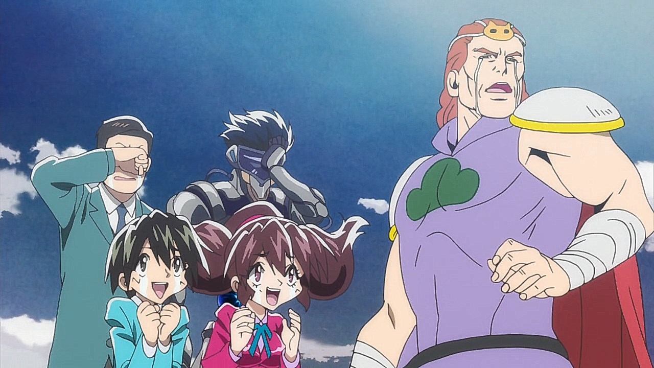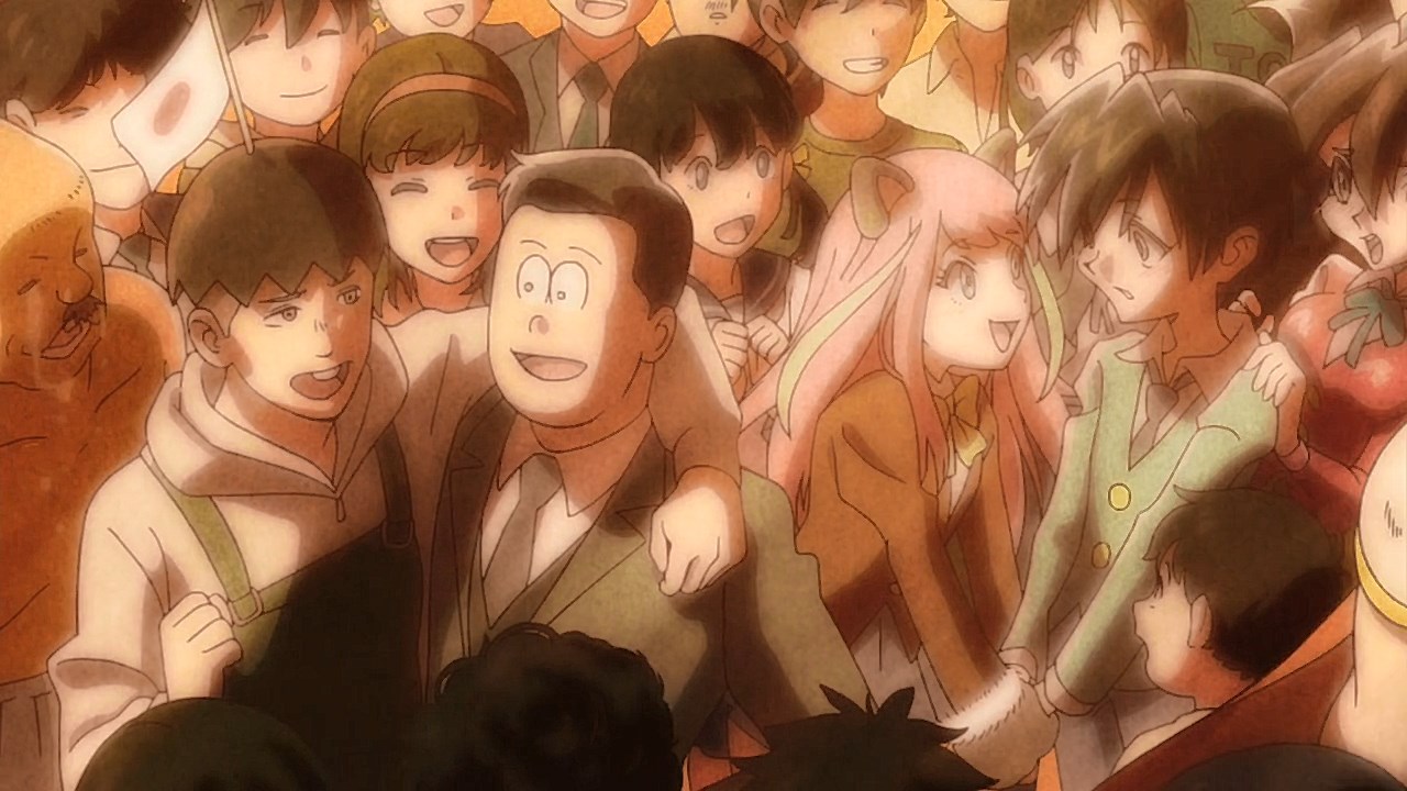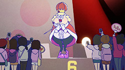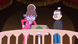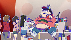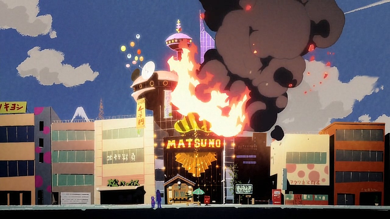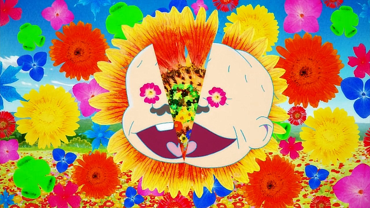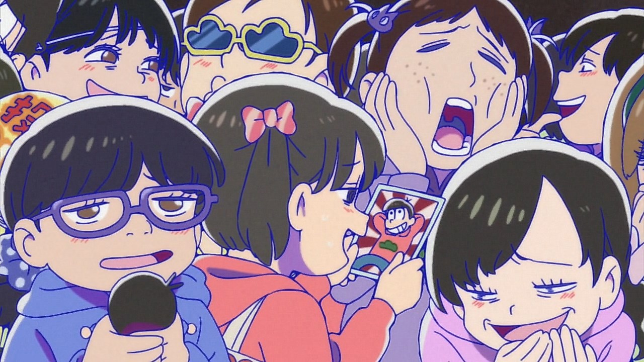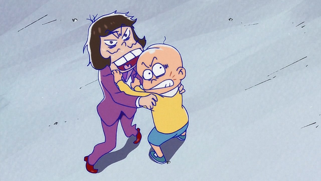 When we first saw the return of Osomatsu (Sakurai Takahiro) in 2015, it was met with legal trouble as the first episode of Osomatsu-san was cut from streaming and DVD release due to copyright infringement. With the sextuplets trying to woo audiences by becoming characters from Shingeki no Kyojin, Naruto, Love Live, Pokemon, Sailor Moon, and just about every other anime under the planet, the first episode set such a high bar for what could follow. The resulting anime ended up being a hilarious re-emergence for the Osomatsu-kun franchise, torpedoing many of the characters into a series of merchandising opportunities, video game spin-offs, and stage shows. The US release for their iOS/Android game was last month, and it’s a relatively fun tower defense game. But with all of the success that has come their way, expectations were high for what exactly can come from another season of Osomatsu-san, especially since the first couple episode dropped many jaws when it first came out. I’m glad to say that they started off on a high note by tweaking the initial formula to make something equally twisted and entertaining.The first half is where the “twisted” part comes in. Much like any sophomore album, they wanted to come right out the gate to acknowledge how much of a hit the first season was, and they expressed this by having the money and fame warp the Matsuno brothers into horrifyingly hedonistic monsters. After Iyami (Suzumura Kenichi) takes a vacation to Trump Tower, him and Chibita (Kokuryu Sachi) are greeted to a new world where the Matsuno’s have a mansion and are steadily enabled in taking their depraved lifestyles to the highest heights to maintain the level of prosperity they’ve had since 2015. As a result, Osomatsu has become an obese kid in an adult body, Karamatsu (Nakamura Yuuichi) becomes an equally massive pop star, Choromatsu (Kamiya Hiroshi) and his otaku tendencies are amped up to include directing anime and flipping skirts, Ichimatsu (Fukuyama Jun) is transformed into an emaciated hermit, Juushimatsu (Ono Daisuke) is now a giant blob, and Todomatsu (Irino Miyu) ordained himself as a womanizing king. Along with this, the sextuplets’ parents, friends, and acquaintances are riding their fame for all its worth, profiting off of their relationship with the brothers and the exposure they received from the 2015 anime. It’s a clever way for the show to address how unexpected the success of the first season was, and what would happen if you made the sextuplets from this iteration of the franchise millionaires. The brothers belching, cannibalism, and comeuppance are also some of the grossest moments I’ve seen in anime this year, but it’s the outrageous direction they went with the Matsuno’s that pushes the envelope for what exactly they are willing to subject them to this season. The repulsiveness of the big money Matsuno brothers shows their willingness to abandon any sense of toning down their bad taste because of how much yen the series has made since the reboot/sequel. That dedication comes in play as offended viewers march to their mansion to blow it to pieces and attack the brothers in revolt.What this also does is show that perhaps letting the money get to their head isn’t the best route the show can go, especially if they get comfortable enough with the brothers’ popular traits that they manifest into a personification of their worst attributes. This comes into play as their 1960’s counterparts are so upset with their future hedonism that they swear to become the best they can be so that they can be better anime than whatever happened with that future. Instead, their long string of good deeds caused the brothers to transform into completely different, vastly better people. Osomatsu grows up to have the perfect future in a respectable seinen story where he has an office job, a wife and kids, a love life, and a new lease on life. I was looking forward to seeing if the other brothers also lead a similar life in a sophisticated anime like Osomatsu was, but what ended up happening was even crazier and funnier than what I expected.Karamatsu transforms into a cyborg ninja like Raiden, Choromatsu and Totoko (Endou Aya) arrive as a Kimi no Na Wa.-like pair who are animated like characters from hyper-deformed 90’s anime like Saber Marionette, Ichimatsu appears similar to the old He-Man or Aquaman cartoons, Juushimatsu is animated in CGI, and Todomatsu is just a live action guy with a mask. It was hilarious to see all of the brothers’ ideal versions of themselves when they’re at their very best, but it was even funnier to see them all interact with each other in the same screen. To see 90’s anime, 3D, and live action all come together into a sloppy mess as they fight in mecha made me laugh quite a bit. This particular segment seems to be the most direct response to their copyright mishaps since they managed to parody anime genres this time around more so than any particular series as to avoid issues like last time. It’s also a nice message on how dedicated they are to playing around with the animation style since the first season tinkered with stylistic changes like the Sanematsu-san skit, but they’ve gotten advanced enough to mash up so many styles in one frame, and it’s impressive that they took the time to animate Juushimatsu in 3D or had someone with a Todomatsu mask pose in ways for him to be inserted into the show as a character.They also showed off the OP/ED for the season at the end of the episode with varied results. I loved all two of the OP’s that the first season had, and the OP for S2 is no exception. It was cool to see how much flair they gave to the colorful animation as the Matsuno’s are thrust into a a world of rainbow colors and poppy music. Specifically, them firing drinks off into the sky to reveal the song name was impressive to see. To match the episode’s animation experiments, the ED implemented a neat stop-motion sequenc