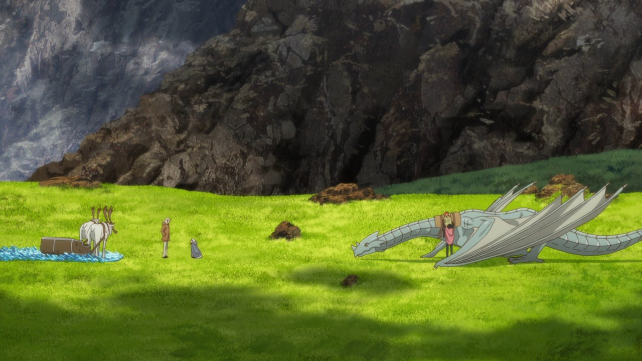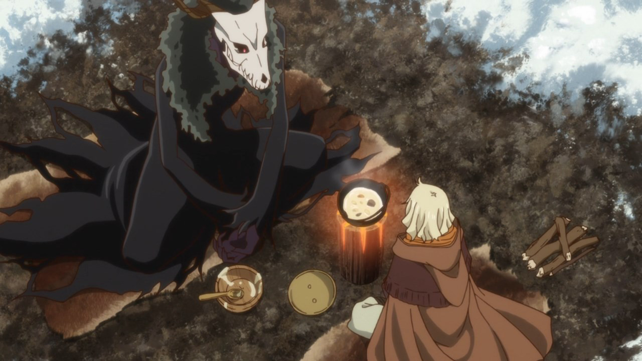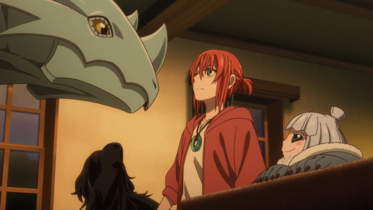 It’s always nice to see excellence rewarded commercially in anime – especially as it seems to happen so rarely. Mahoutsukai no Yome is excellent without a doubt, a stellar adaptation by Wit, and it garnered almost 6200 in Blu-ray volume sales in its first week. While those numbers don’t make it a monster hit, that’s a pretty healthy return for a series as thoughtful and relatively pander-free as this one. I’m not going to go so far as to say the production committee is being rewarded for risk-taking in this instance, as the Mahoutsukai manga is itself extremely popular, but they have at least had the good sense not to dumb it down to try and appeal to the anime audience.If it continues at its current pacing, the anime’s 24 episodes will likely use about 36 chapters from the manga – a manga which is currently only at about 42 chapters. So while The Ancient Magus’ Bride will almost surely get its anime sequel, it’s going to be a couple of years before we see it. These things can’t be rushed – and this is the sort of series that takes its time spinning its yarn. Exposition doesn’t happen in staccato bursts here, it’s slowly teased out over the course of multiple arcs – and that befits a story where the passage of long stretches of time is woven into the fabric of the narrative. The mysteries, large and small, sometimes feel as if they’re as old as time.Like Togashi, Yamazaki-sensei likes to lay the thematic groundwork for the coming arc in the one before. We’ve seen Chise grow more and more impatient to learn more about Elias’ true nature, just as those around them have grown increasingly concerned with Chise’s growing complacency at being Elias’… Apprentice? Bride? Pet? Now we see Lindel summoning Chise through the person of his selkie familiar, Merituuli (Han Megumi – probably best not to imagine Hisoka and Gon here) – ostensibly to help her make her wand, but in part because he too is concerned about Chise’s attachment to his former apprentice.Killing two thematic birds with one stone, Lindel decides to tell Chise something about Elias – he’s rather stunned that he’s told her so little already, in fact. Chise would of course rather hear it from Elias herself, because in addition to knowledge she would be getting an acknowledgement that he’s come to trust her – but beggars can’t be choosers. As they huddle around a fire in the land of dragons, Lindel begins to spin the tale of how he came to know the being Chise knows as Elias Ainsworth.Lindel is himself a cagy sort, probably a function of having lived as long as he has and seen as much as he has. How long he’s not telling Chise, but a long time – longer than Elias anyway, and we know him to be centuries old himself. Lindel begins by telling Chise something of the existence of mages, beings whose origins and purpose are so mysterious as to be unknown even to themselves – born to normal humans but possessed of strange powers and often freakishly long lifespans, mages have been a part of the world’s fabric since there were people to tell stories about them.As for Elias, he stumbled into Lindel’s camp at some point deep into the past, a frightening and huge creature, and collapsed from hunger. Lindel knows not what to make of it, and neither does the creature himself – his memories extend only as far as the beginning of the foot journey that brought him to Lindel. Bemused, Lindel decides to take the creature to meet his master, Rahab (Mitsuishi Kotono, about as iconic as they come), who’s likewise stumped – though she does name him Elias (she named Lindel too, naming things being one of her passions). Elias seems to these two mages to be a fairy, a creature of magic – but with a “hint of human” about him. At Rahab’s prompting Elias remembers one thing and one thing only – “Red”.Answers are not what Mahoutsukai no Yome is about, not when it comes to these sorts of questions, not as this point in the story anyway. The mystery is what matters. What does seem clear is that more than simply taking Elias (who after his transformation to child-size begins to talk like a young boy, peppering his speech with “boku” and “kimi”) on as an “acquaintance” at Rahab’s order, Lindel feels something for him – the implication of his calling Chise “Granddaughter” is that Elias is his spiritual son. What we still don’t know is how far in this case the apple has fallen from the tree…
