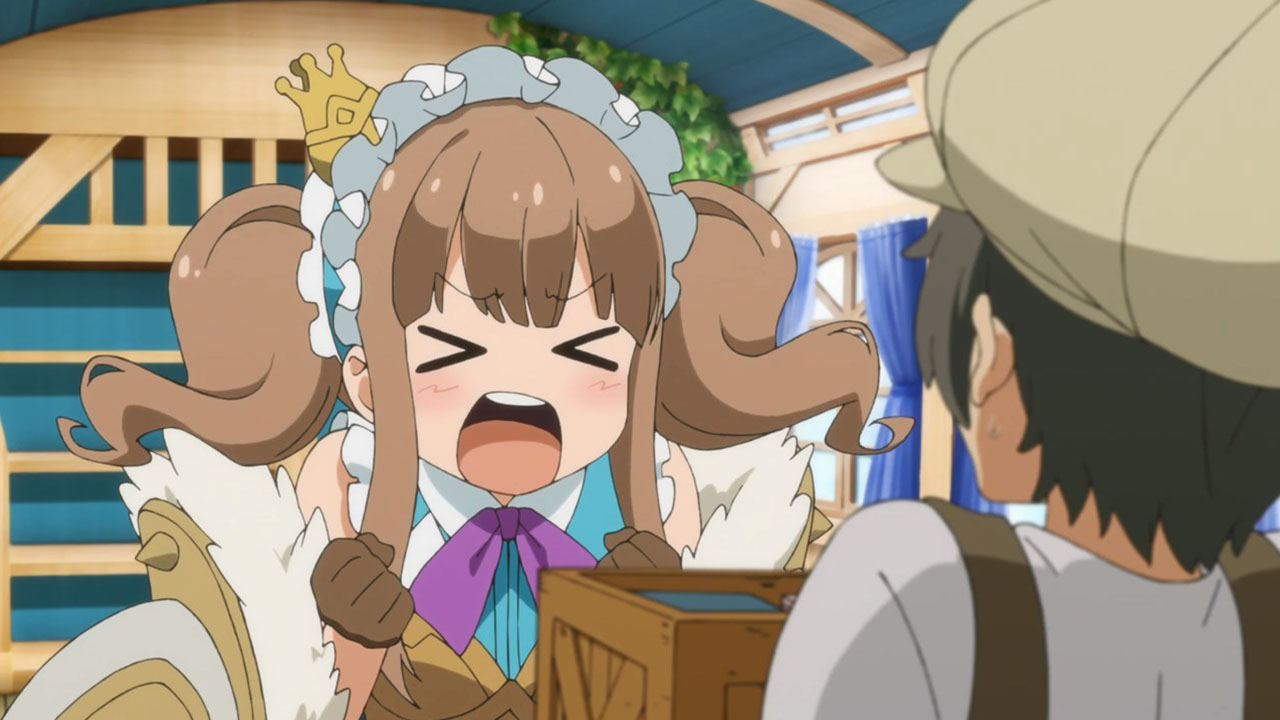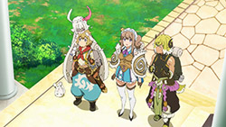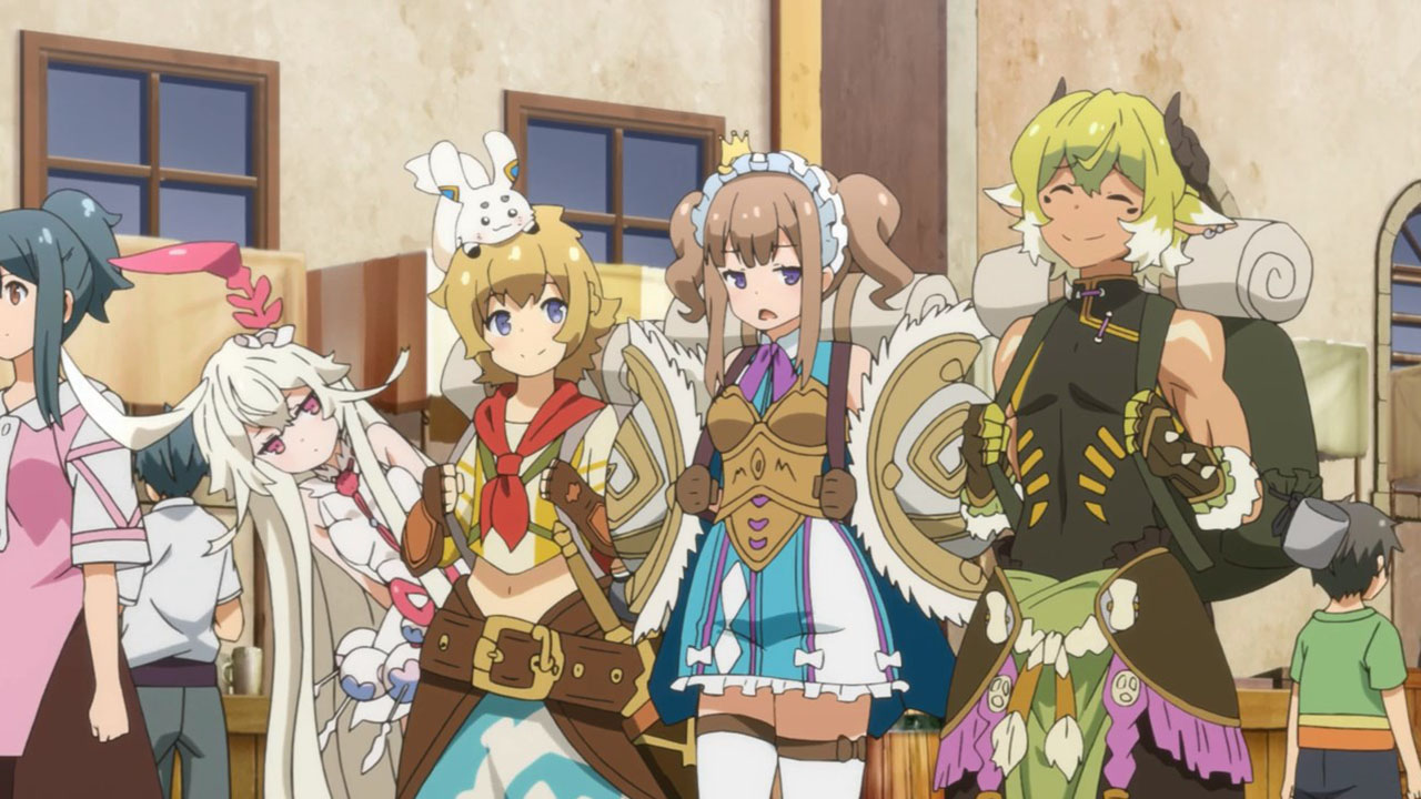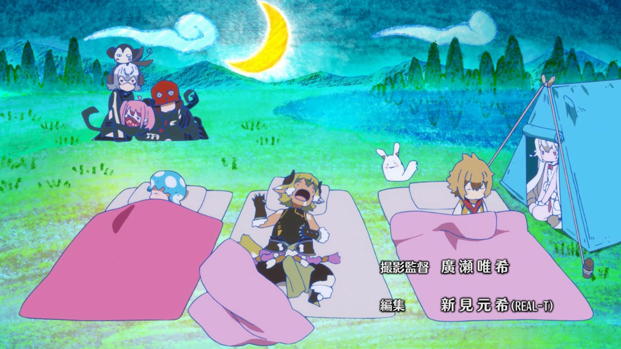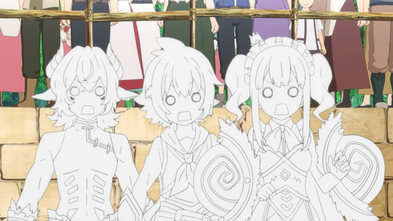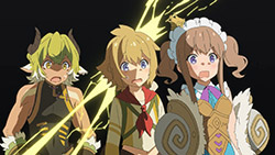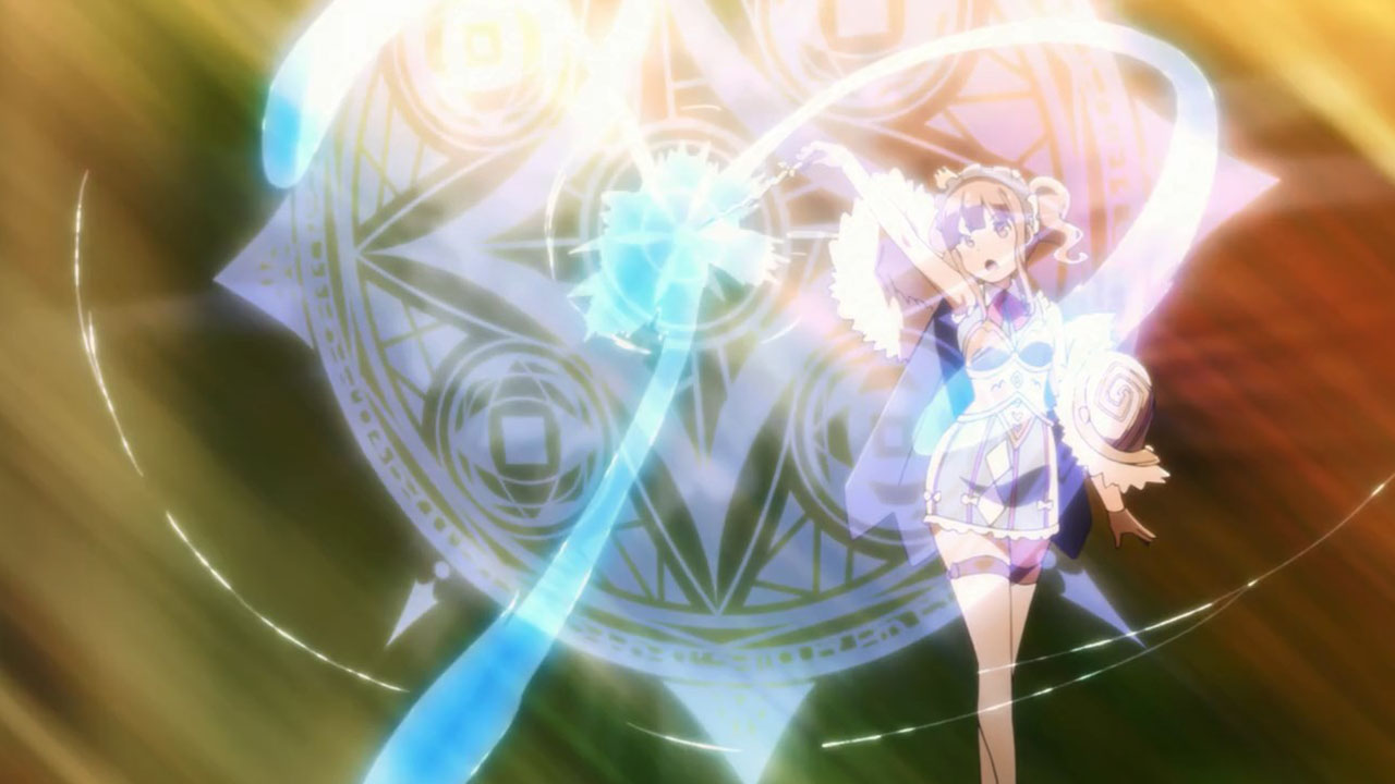 I wrote all that out because, even more than the preview, when you line everything up in this first episode it’s actually a pretty straight-forward setup. This despite the jargon (periods, spirals, etc) is quite pleasant, because it sets up a standard fantasy-adventure world and then quickly gets on with the silliness. Here, the main purpose of the show seems to be to jerk its main characters around and take the piss out of mobile games, which, since this is based on a mobile game, is a deliciously subversive look. All this talk about log-in bonuses and gachas got a chuckle or two from me. At least the writers seem to have a good sense of humor about this whole thing.