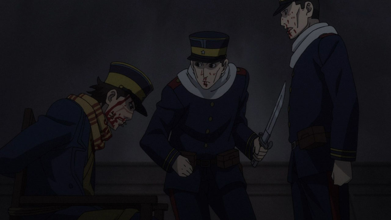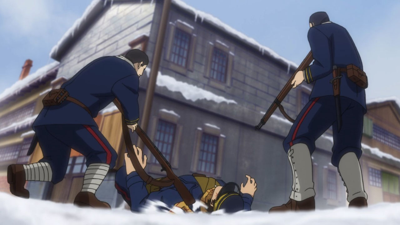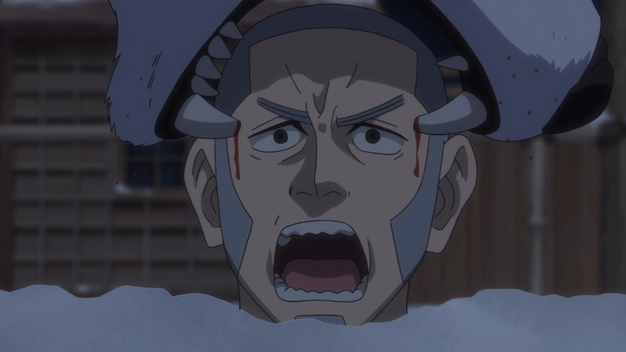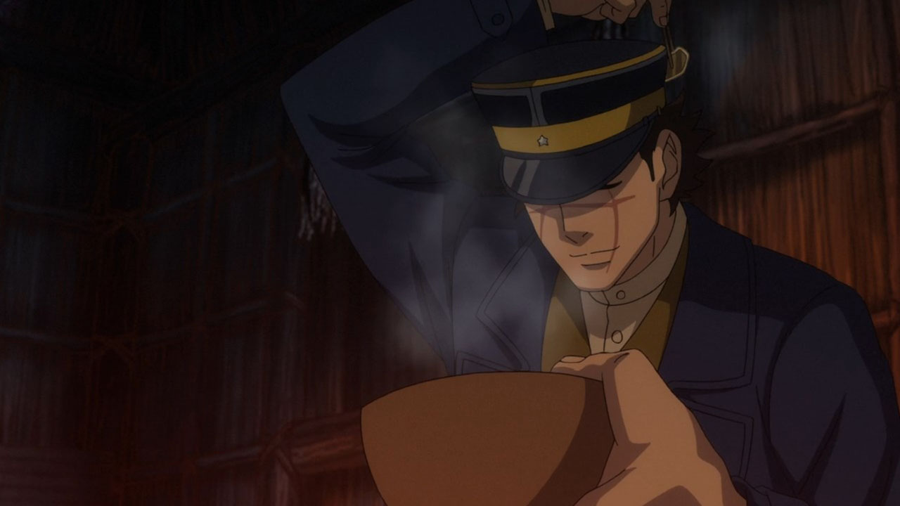 Contrast the Ainu village with the world outside of it. Asirpa’s kotan seems to have written off the gold already. Their desire for war likely died with Asirpa’s father. And they seem to be doing rather well. Sure, this is something of an idealised version of the hunter-gatherer lifestyle, but it’s peaceful and carefree. But in Otaru, where the fight for the gold rages on? It’s brutal. Compare the soldiers to the Ainu hunters. The hunters have spirituality, purpose and fulfilment. The soldiers feel bored and abandoned, and if history has taught us anything it’s the danger of leaving a bunch of bored soldiers loitering about. Their lust for both wealth and blood turns their world into something nasty. Yet another juxtaposition this episode: the two meals Sugimoto enjoy. At the Ainu village, good food is just good food. It is a thoroughly positive experience. But in Otaru, his soba while also tasty, was a trap. When entangled with this cursed gold, one can’t even enjoy a meal in peace.