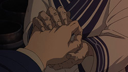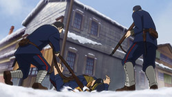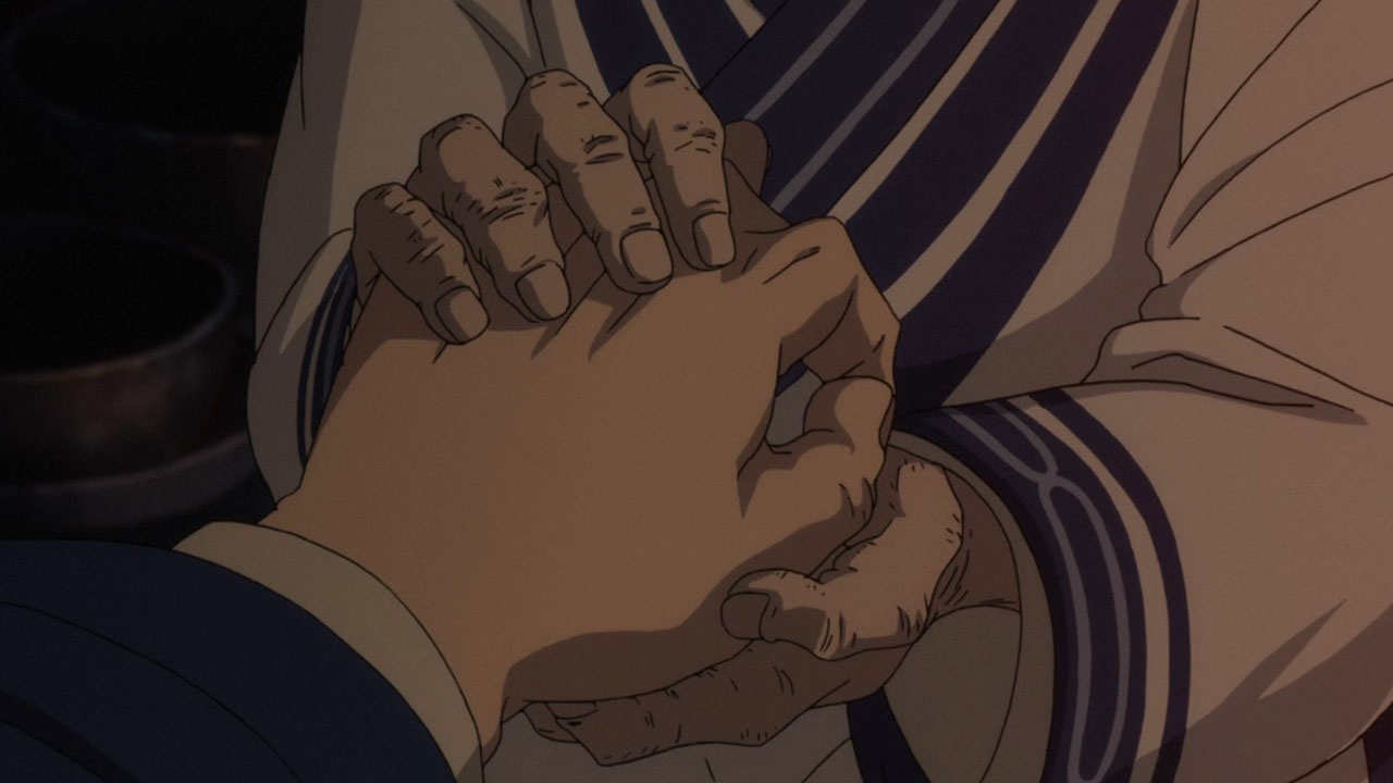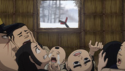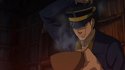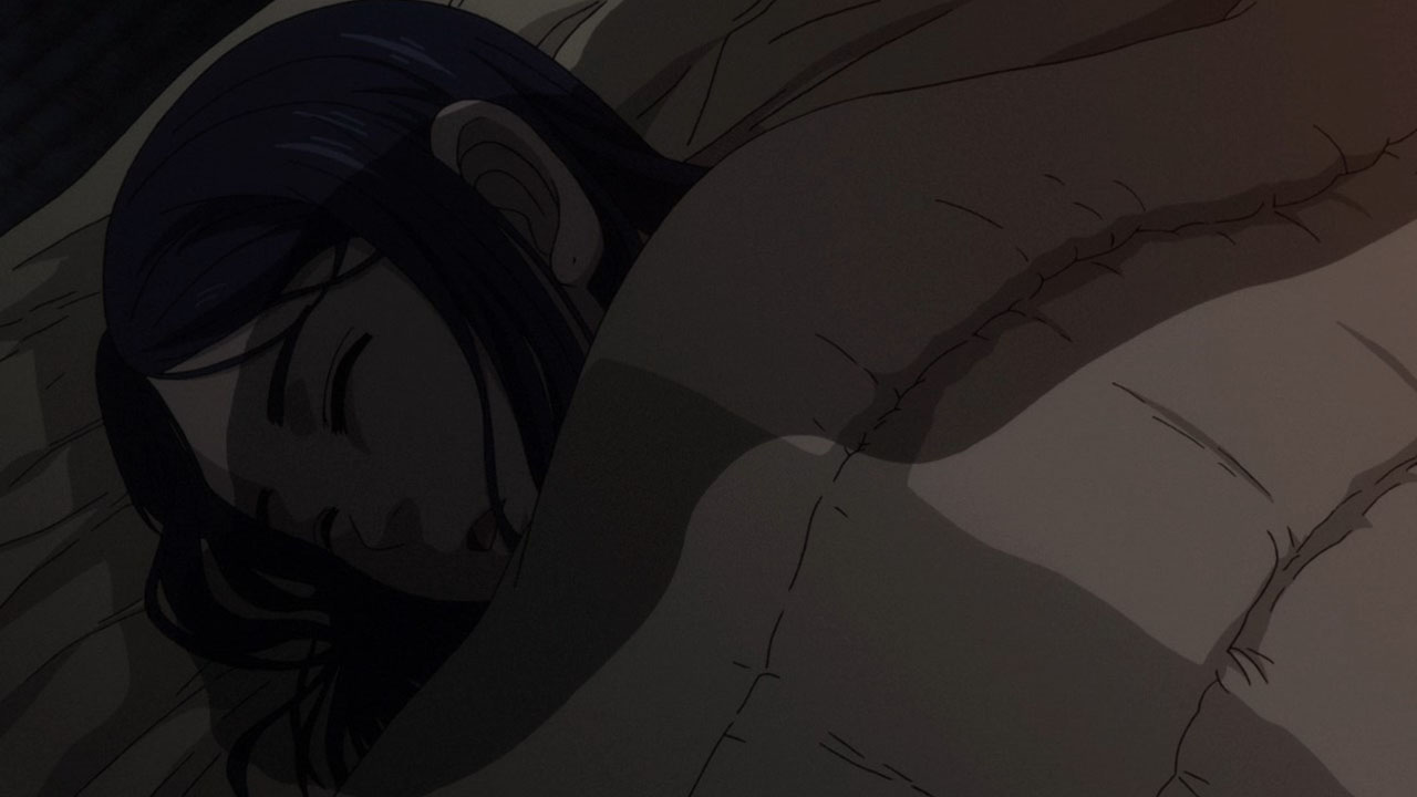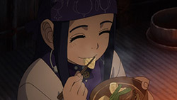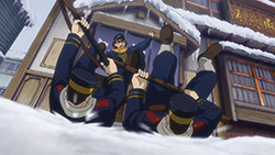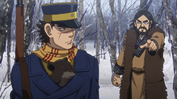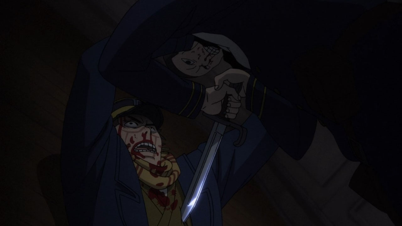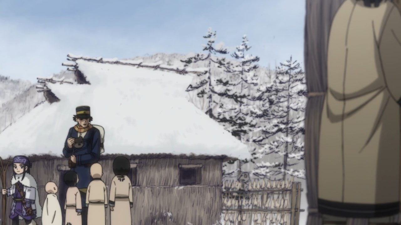 Contrast the Ainu village with the world outside of it. Asirpa’s kotan seems to have written off the gold already. Their desire for war likely died with Asirpa’s father. And they seem to be doing rather well. Sure, this is something of an idealised version of the hunter-gatherer lifestyle, but it’s peaceful and carefree. But in Otaru, where the fight for the gold rages on? It’s brutal. Compare the soldiers to the Ainu hunters. The hunters have spirituality, purpose and fulfilment. The soldiers feel bored and abandoned, and if history has taught us anything it’s the danger of leaving a bunch of bored soldiers loitering about. Their lust for both wealth and blood turns their world into something nasty. Yet another juxtaposition this episode: the two meals Sugimoto enjoy. At the Ainu village, good food is just good food. It is a thoroughly positive experience. But in Otaru, his soba while also tasty, was a trap. When entangled with this cursed gold, one can’t even enjoy a meal in peace.