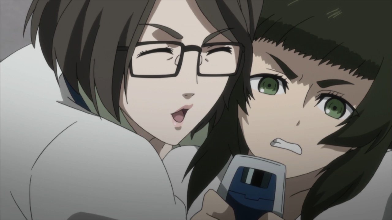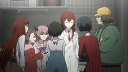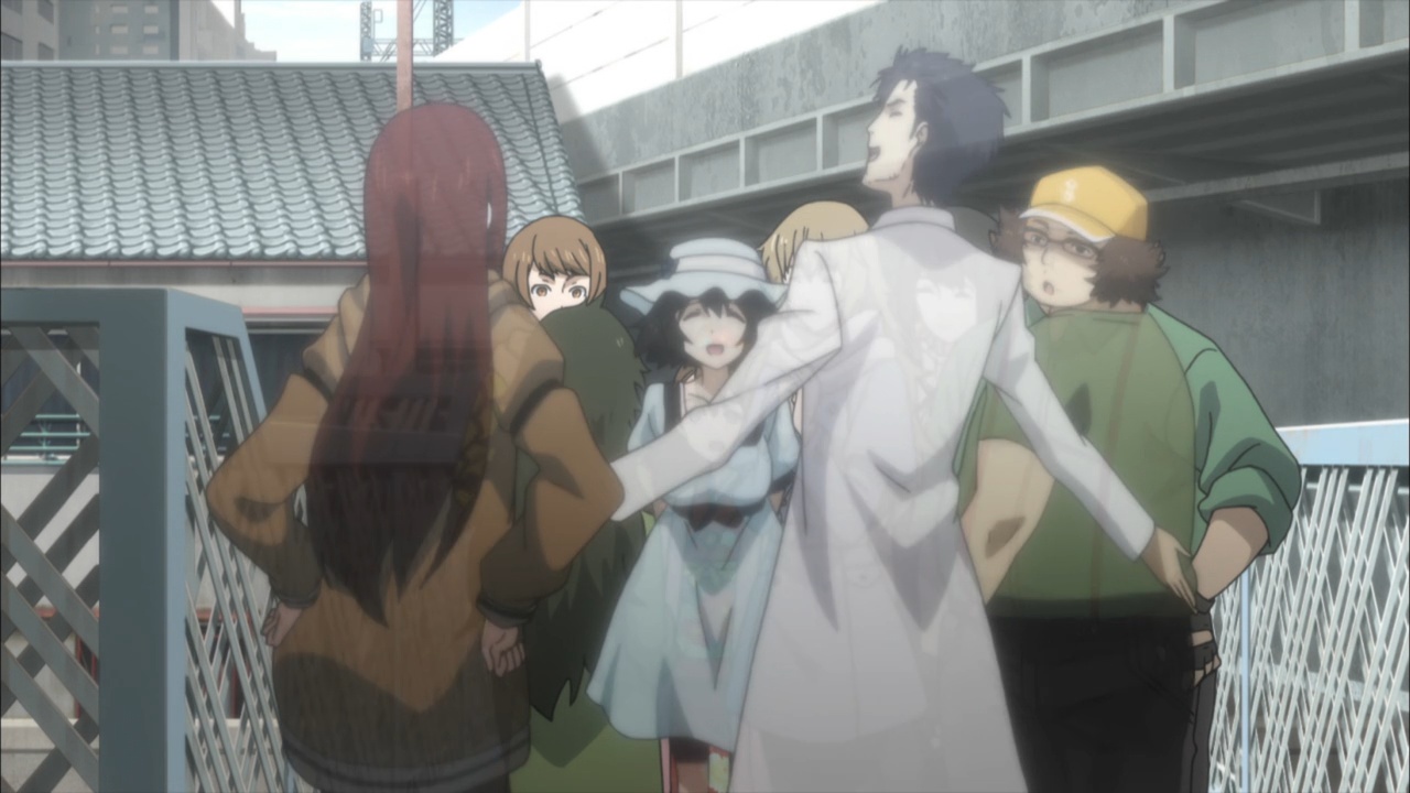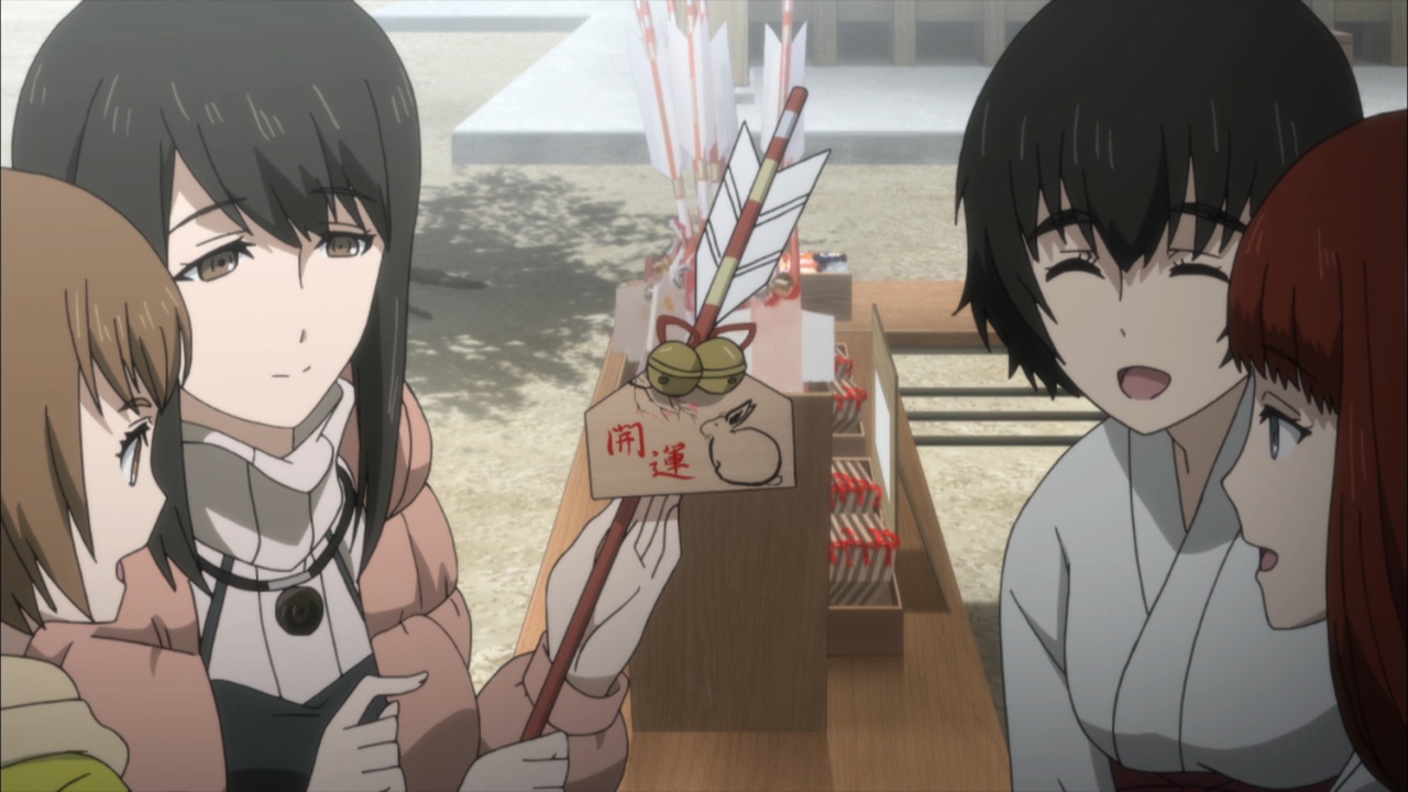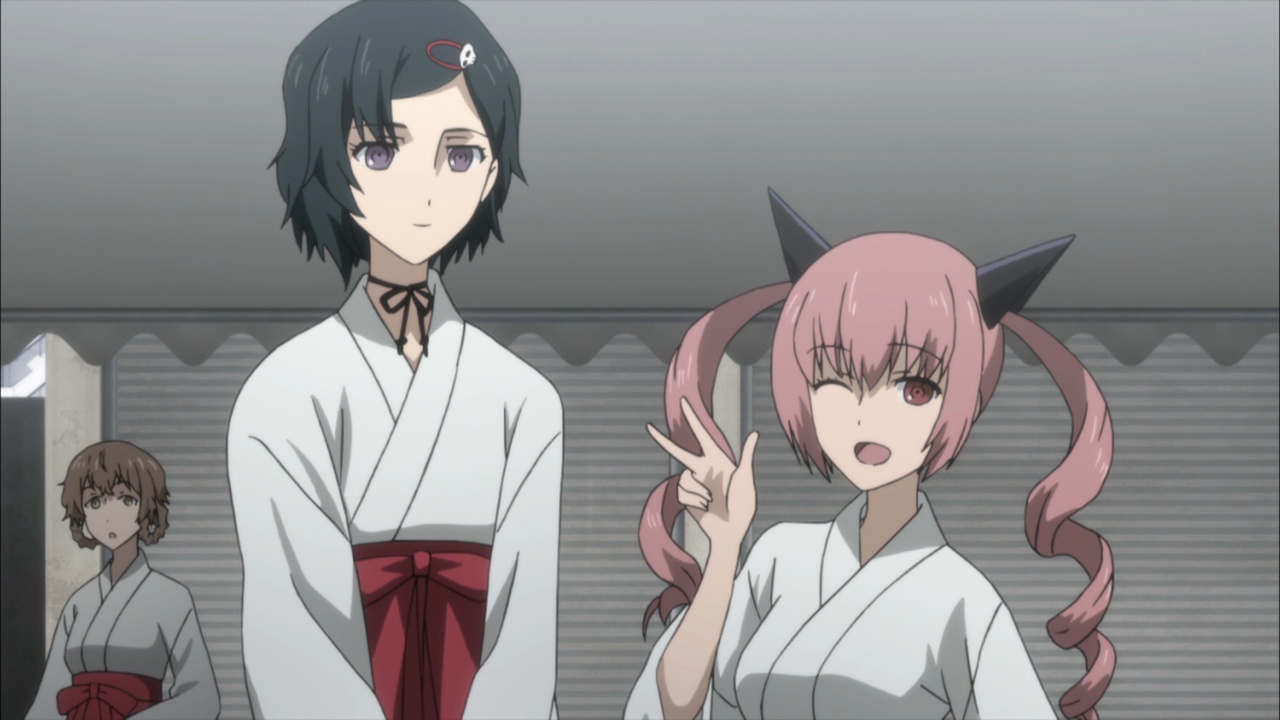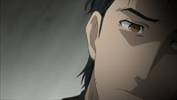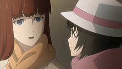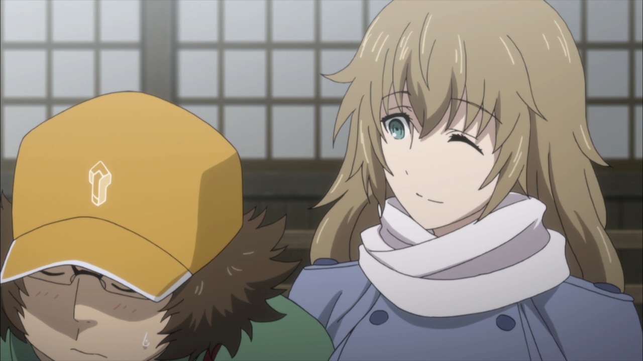 Suspicious people gonna suspicious.I must confess, watching Steins;Gate 0 I feel for Okabe Rintarou in a way I never quite did before. Don’t get me wrong – he’s always been a great protagonist. His charisma – fueled by Miyano Mamoru’s sizzling performance – has always been the spine of Steins;Gate. He’s a fascinating and likeable character who seems quite up the challenge of carrying this story whatever it throws at him.Things are quite different with Rintarou in “0”, though, even as the series as a whole grows more and more to resemble its predecessor. The overarching sense of the narrative is of the past hunting Okabe down relentlessly, its tendrils reaching out to grab him by the ankles and pull him down into his personal Hell. This Okabe is a changed man from the one we knew – more sober, more restrained, far more cautious. There’s not much of Hououin Kyouma left in this Okabe Rintarou, and that’s when he could still try and convince himself that he’d left world lines and reading Steiner’s behind forever.Part of that torture is Kagari of course. It’s not enough that talking to Amadeus is like talking to a ghost – now in Kagari, Okarin has to share the lab with a living and breathing reminder of what once was. It’s still to be determined just exactly what connection Kagari might have to Kurisu (her amnesia conveniently keeps that and other things about her a mystery), but Steins;Gate is not big on coincidences (that may be one of the biggest understatements I’ve ever written). Sadly for Okabe, Kagari’s appearance could be a coincidence and her presence would still be a dagger in the heart.It’s a sure-fire sign that the hidden world is closing in that Okarin is having strange visions, after-images of other timelines. And all the characters we know to be suspicious (and some we didn’t) are acting suspiciously. Tennouji has “something he needs to do” on New Years, and sees strange figures lurking in alleys. Moeka is, well- Moeka. Even Leskinen and Judy Reyes are giving us strong reason to believe they’re up to no good – it’s possible the lingering camera shots of Reyes this week may be a diversion, but that seems less likely than the alternative giving this series’ proclivities.We’re at the point in Steins;Gate 0 now where the illusion of safety around Rintarou is starting to crumble piece by piece, and it’t not pretty. When Maho takes a call from Amadeus at the New Year’s party, the cat is out of the bag as far as that secret is concerned. But there are much more immediate problems to worry about – uninvited guests are coming, preceded by a telltale malfunctioning of mechanical devices. It wouldn’t be a huge leap to take a guess at who they work for, and only a slightly bigger one at who might be in cahoots with them. But the most interesting question of the moment for me is just how well Okabe is going to be able to keep it together – because, as usual, it looks like everything is going to depend on the poor guy.
