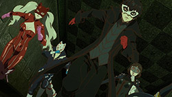 At breakneck speed, Persona 5 the Animation mows through Kaneshiro’s palace and wraps up the section where we see Makoto on the battlefield. For better or worse, many of the details and nods surrounding this section of the game took far a majority of the spotlight in comparison to the palace itself. Most notably was how Makoto’s personality had been fleshed out more so here than within the game. As someone who chose Makoto on the first playthrough, one thing I couldn’t help but shake was how she spent most of her time with Ren still being methodical, calculated, and logical with the exception of a few key moments where she’s flustered or excited. Makoto starts out as a straight-A student that has been groomed to fit the mold of a future workaholic like her sister Sae, but the progression towards being liberated, care-free, or open to unwind is only touched upon on occasion like when you go see a film with her based on the game Yakuza or playing the light-gun game during the first rank of her confidant. Aside from those casual hang-outs, it’s hard to feel like Makoto really got an opportunity to relax when most of her decisions and actions in the main narrative and her confidant were based on strategy.With the anime, however, the change that Makoto’s awakening has on her is more apparent as its addressed clearly that she wants to try out average high-schooler hobbies to catch up on lost time. Where her emphasis on getting invested in fun activities as merely a means of researching what students would do isn’t as heavily pressed here as it is in the game, allowing Makoto to be humanized in a way that makes her far more appealing. Framing the shooting game at the arcade as a way to blow off steam instead of as a way to learn tactics in the dungeon helps to show that she enjoys the activities she’s missed out on and that her new outlook on life is offering her the chance to relax and feel not so trapped within the confines of the mental prison that chasing after the highest honors under the principal’s supervision placed her in. It’s still great to see her as the smartest person and the room and it isn’t a detriment to her character that she is methodical, but the anime at least aimed to remedy the game’s issue of making her overly about seeing everything as a research project, leisure included.It also shows Makoto being personable and understanding towards her friends as well. As she becomes acquainted with her new friends, she gets comfortable with talking to them about personal matters. She quickly grows fond of Ann as she levels with her on sharing the blame for being unable to reach out to Shiho before matters got worse, and the building blocks that came from their interactions through the past two episodes come to fruition with their friendship being solidified. One fun inclusion the show makes is how their bond is exemplified through the game’s Baton Pass feature that boosts attacks when a character that hits an enemy’s weakness can follow up by giving another character an extra return. After Makoto and Ann patch up any of the hard feelings they had about the past, the anime switches right into a scene in the Metaverse where the pair tag teams their enemies with a one-two punch.The Baton Pass function makes a nice re-appearance as a key mechanic to defeating Kaneshiro as they each get a turn in getting a crack at his shadow. While it does streamline the fight by getting each of the members of the slowly growing Phantom Thieves time to shine, it also lends itself to how the anime wants to involve the party in the story’s events or side-events. For instance, the cheap TV that the player would ordinarily be able to buy from the thrift store by LeBlanc ended up being something Yusuke and Ryuji decided to install in his room to give the attic pizzazz. The added scene where Caroline and Justine were given some development akin to their confidant was a welcome surprise as well that made Igor’s prerequisite lecture easily more tolerable.The crux of the anime’s issues has always came back to the animation quality, and this episode takes a huge dive in the hang-out scenes where any time that camera goes far enough to show most of their body, their faces are lopsided and weird. While it is easy to spot the off-model mistakes in slower scenes that can be polished up for the Blu-ray release, it becomes an issue that’s hard to overlook with the fights. The wonkier animation works a little in Shadow Kaneshiro’s favor since the messiness of his movements gives his new fly form unsettling spontaneity, but for the rest of the Phantom Thieves, the crooked eyes, floating bodies, and off-model faces aren’t a good look. Kaneshiro rapping out his plans to decimate everyone was also awkward, but he is a flying purple fly-man who dances on a giant metal pig he calls the Piggytron, so him spitting bars at the party is the least strangest thing about this fight.The anime’s efforts to give the cast additional qualities to work with come at the cost of having to adapt the gameplay. They thankfully skipped through the tedious sections of Kaneshiro’s palace, as cool as the song “Price” is (the bass and funky high-pitched instrument gave the bank heist a smooth yet sleazy feel to it that fits well with what Kaneshiro’s subconscious would sound like), but they were definitely trying to wrap up the bank as quickly as possible and fast-forward to the calling card and fight. Even if it isn’t the most eventful part, it is disappointing that much of the pacing went into making the build-up to Kaneshiro longer while the actual hunt for his treasure was fast-forwarded through. There were further hints of the illusive black masked individual that is spying on everyone and working behind the scenes to use the Metaverse in less wholesome ways, so that’ll be interesting to see be a possible part of the next episode.