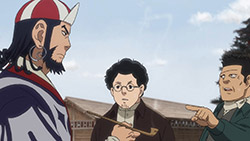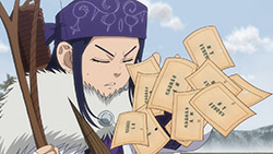 Hearing Mamiko Noto was reason enough to be happy for me this episode.Sly Fox type character? Even better.References to Yojimbo? Even better.Anyway, as Sugimoto realises, there are only few “unclaimed” skins left.Sugimoto/Asirpa teamhas 5 (drunkard who got killed by bear, psycho killer with golden boner, Shiraishi’s own, bear hunter guy and…someone else?)Hijikata and the gang have at least 4 now: Hijikata, his block-fore-head teammate, mad corssdresser doctor, and now one offered to them by the sniper guy – plus any that Shiraishi copied for them from Sugimnoto, but I dont count them for the sake of not overlapping)Tsurumi has at least one, which means there are only… 2 unclaimed skins now?And since the one that is in possession of the gravedigger isnow being pursued… soon there will be time when with all skins accounted for there will be zero-sum game forcing teams to confront each other more actively.Which means only more violence…Cant wait for the October!