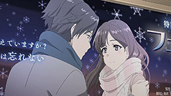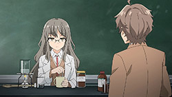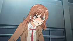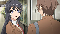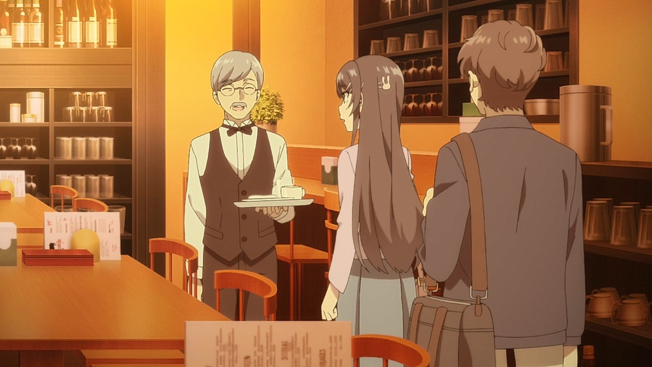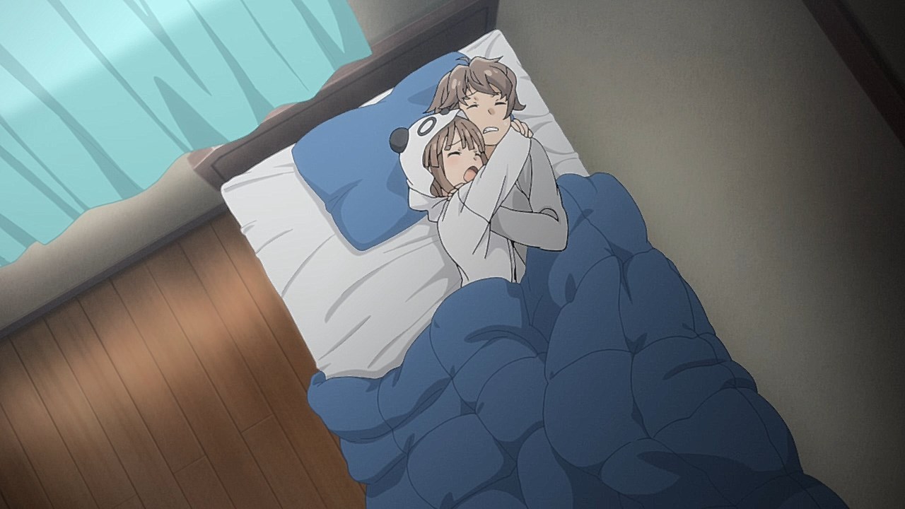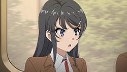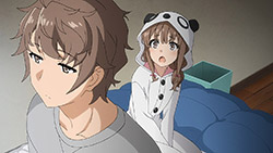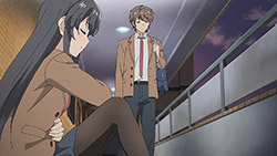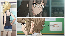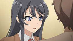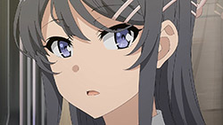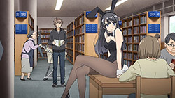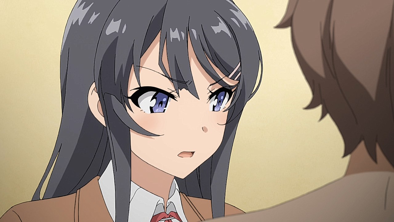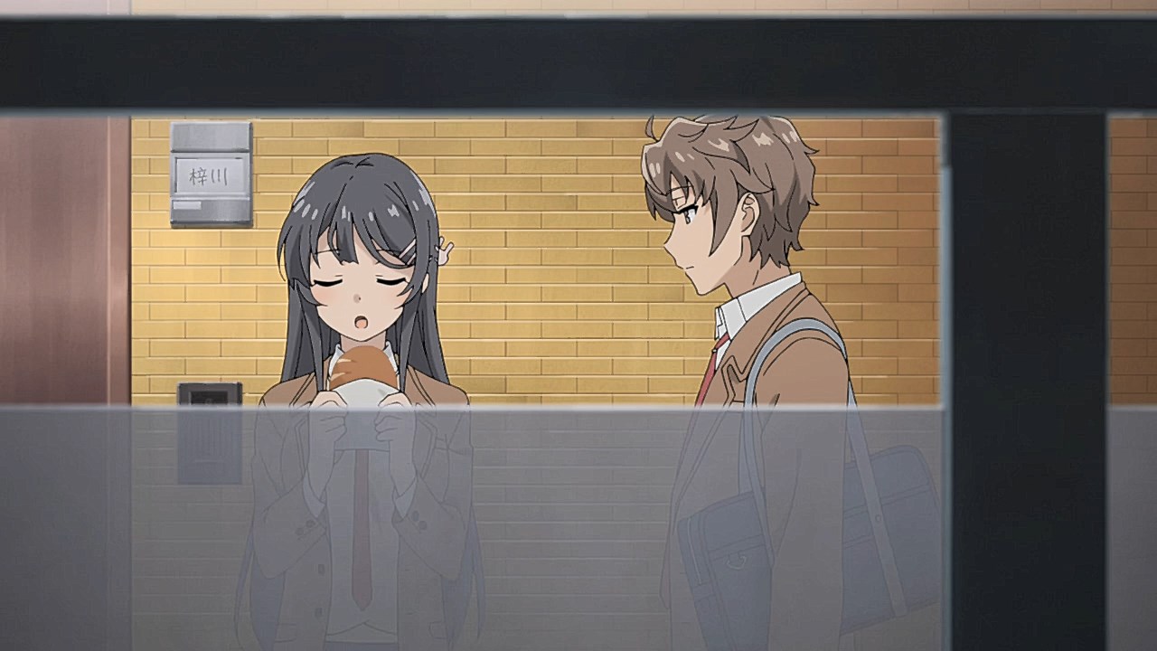Insaaaaanely fast progression with the story (the first arc in the manga took 21 chapters total, and we finished chapter 7 in the first anime episode). Which on one hand is welcome, but there is one thing I regret: They need to skip a lot of the great banter between Sakuta and Mai, which in my opinion is one of the show’s strongest points.Example: After admitting that he couldn’t forget Mai’s erotic bunny suit look, this little exchange was omitted:Mai: Can you scoot over away from me? You’re too close!Sakuta: But why?Mai: I feel like I’ll get pregnant if you don’t!Sakuta: I wonder what we should name the baby.I really do miss these little nuggets of gold, since they help flesh out the characters and their relationship. Let’s hope that they don’t skip next episode’s grocery shopping antics!