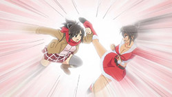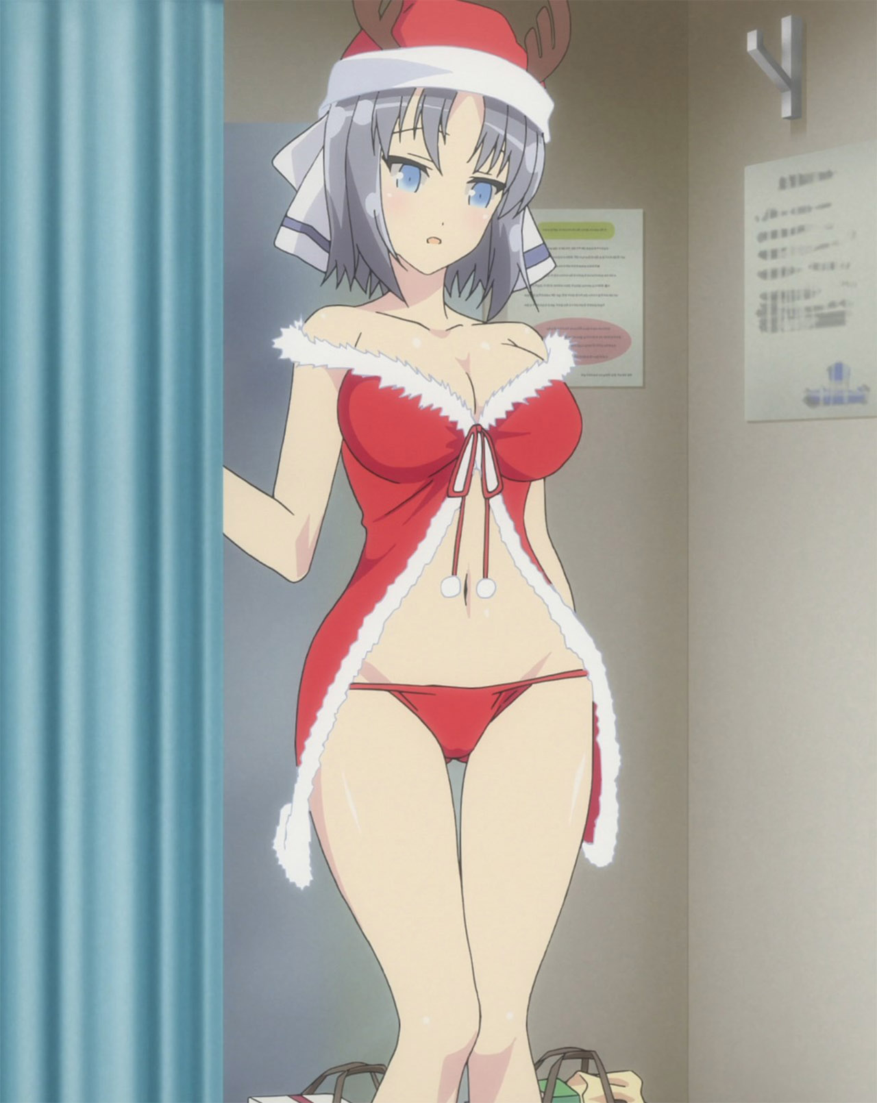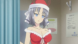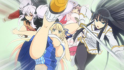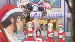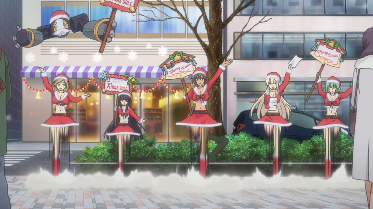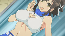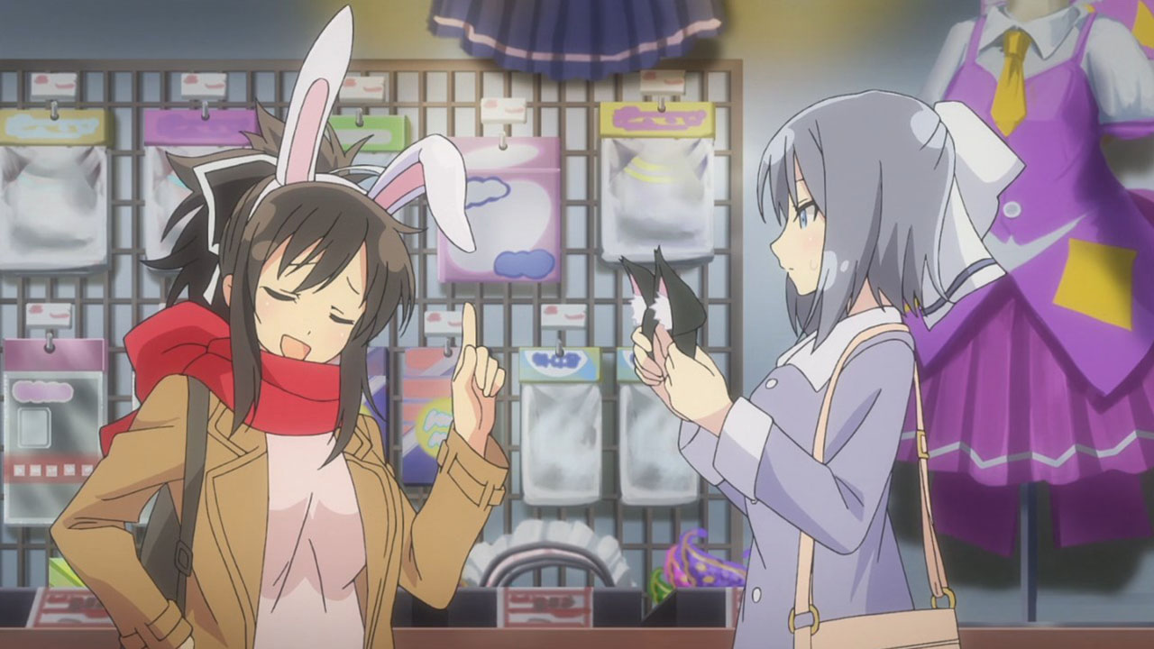 I’m not talking about what happened in this episode because there wasn’t much, and because plot isn’t the point of Senran Kagura (only PLOT). Main character Asuka (Harada Hitomi) meets her friend Yumi (Hara Yumi)—who I think we met during that one OVA—while the antagonists from the first series, including Homura (Kitamura Eri), are doing a part-time job so they can afford turkey. Then some “good” ninjas show up, only they want to beat up the other good ninjas, and they do that. Honestly, do you care? That’s not why we’re here. They’re going to have to do a couple more episodes on this conflict before I bother remembering what these new girls want. It sounds stupid anyway.