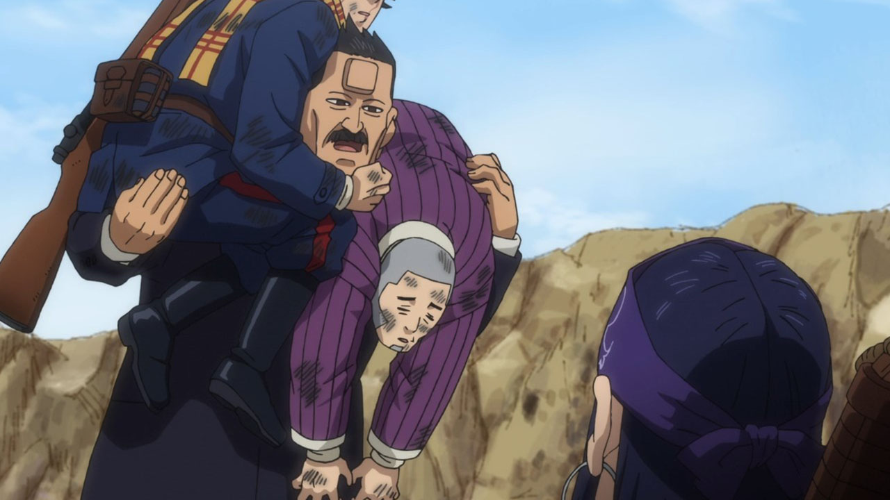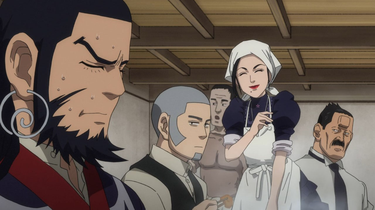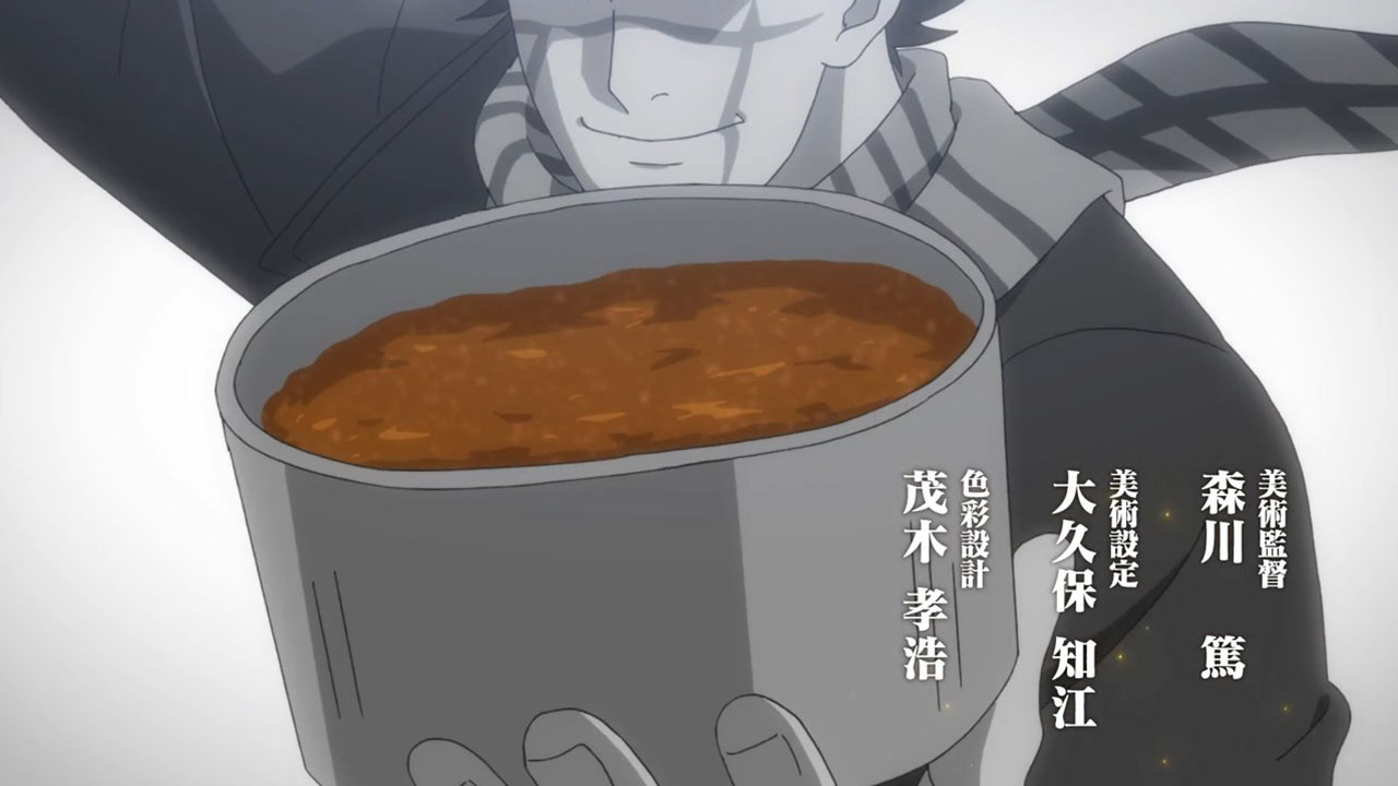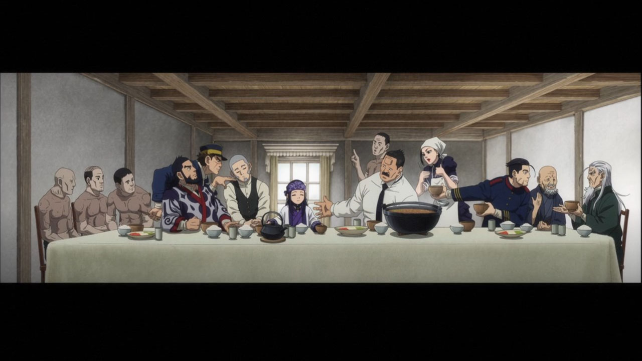 Of course, pure action series are great in their own way, too, but that’s not the kind of show Golden Kamuy is. In an action series, when opposing factions collide like they do here we’d expect them to be fighting all the time, for the sake of action. In Golden Kamuy, this collision brings up an opportunity for—what else?—food. The plot is getting more complex now, with talk of alliances contrasted with whispers of betrayal. We know that Sugimoto’s loyalty is steadfast—when offered money he turns it down purely out of his obligations to Asirpa—but otherwise little else is concrete. The key theme of this narrative arc, it seems, deals with these fluid human affiliations. Lt Tsurumi is capable of inspiring fierce devotion in his men (a devotion that Edogai dies for and does not tolerate traitors — even as he himself is a traitor to the state. And Sugimoto and Hijikata may be about to broker an alliance of convenience, even though it’s evident they don’t trust each other at all. After all, who can we trust. I’m never sure how seriously I’m supposed to take parodies of the Last Supper. Is this supposed to be a hint as to who is going to turn? Or is it mocking the very idea? I mean, Kiroranke is right there as Judas. What else am I supposed to make of that?