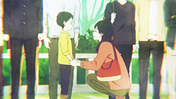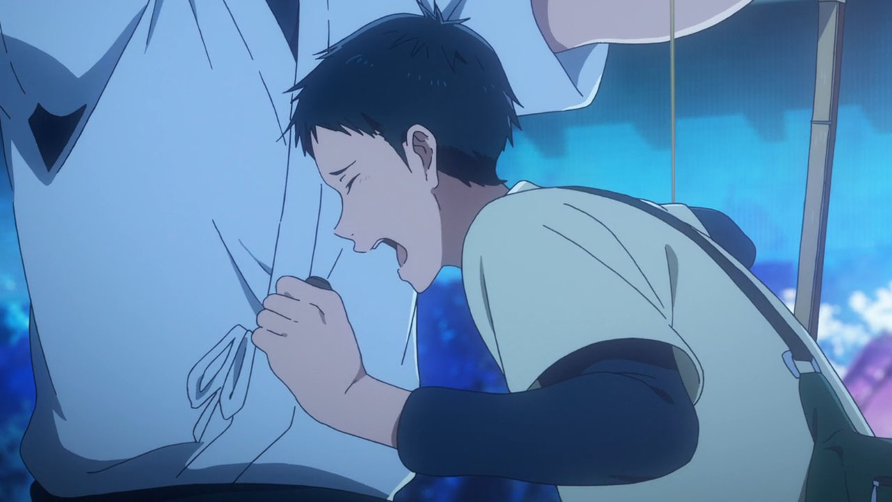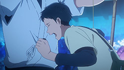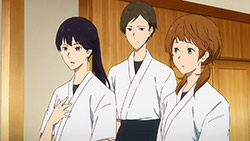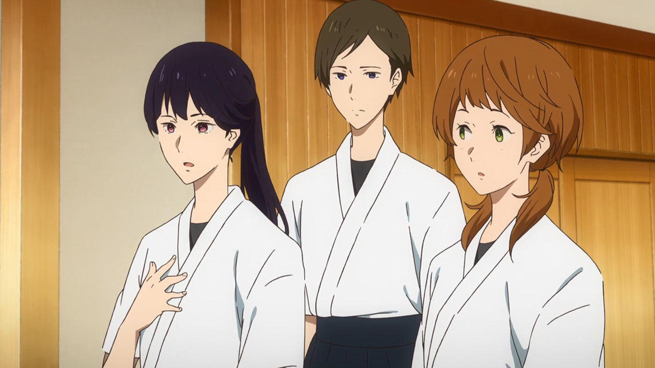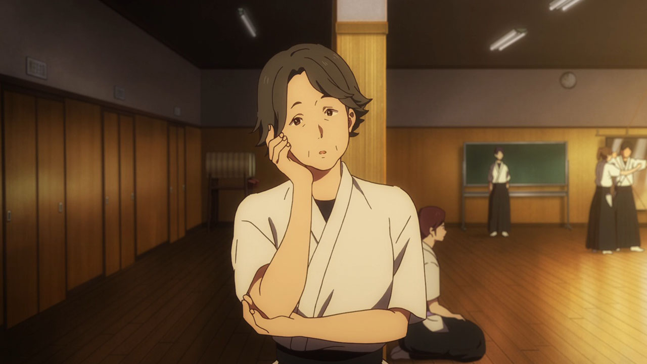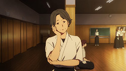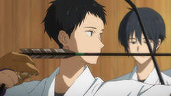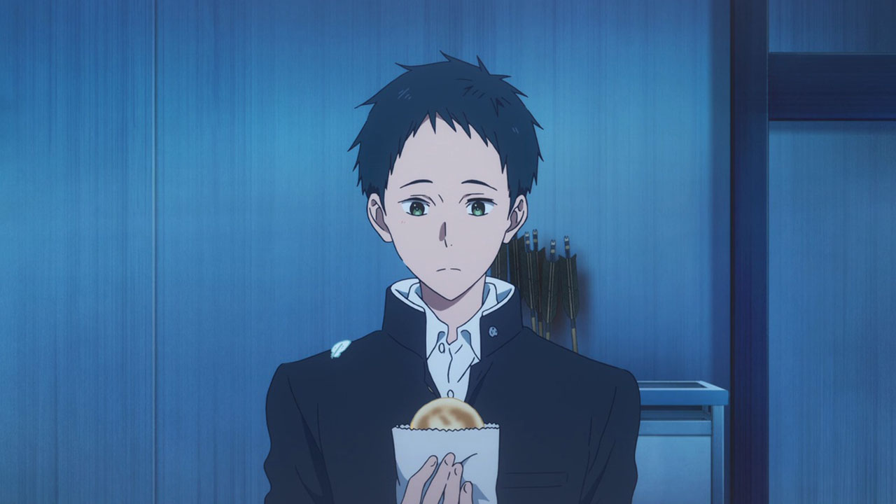 In Minatos time of need, it seems a tad convenient that he was able to stumble across a Kyudo Training Shrine, and meet the man who might hold the solution to alleviating his problems. However, Im hardly fazed. I believe that any good stories require a chance encounter of sorts, and the meeting between Minato and Masaki feels foundational to the setup of Tsurune. One would be careful to divulge their dark secrets to a stranger, as Minato demonstrated. However, he soon warms up to Masaki, telling the latter his tale of woes. Whereas no one else had the time of day to listen to Minato beforehand, Masaki might just be the first in this regard. Having been through target panic himself, Masaki also knows Minatos concerns inside out, and properly hears out Minato in an empathetic manner. He steadies the uneasy youngster, and demonstrates great persistence and patience in getting through to Minatos heart.After speculating about what might have caused Minatos target panic, I suppose it might simply have come down to a bad experience at the prefectural tournament. I doubt that the audience would know what it feels like, so Takigawa-sempai weighs in and paints the canvas to help us understand: pressure from the inability to hit, the mockery endured, the loss of confidence, and most importantly, feeling like you dont know yourself anymore. The first three I had vaguely guessed, because they had been mostly alluded to in flashbacks. But the final point was one that I had failed to consider and it proved the most interesting to me, because it went way beyond the surface, diving deep into the murky depths of Minato’s troubled self.Whats so fascinating about seeing someone at their lowest point? Well, I like to believe it’s because they cant go any lower, meaning they can only start to climb up. As Minato works to rediscover himself, we will be there, cheering him past every step of the way. That said, it is also quite easy to see why he feels so jaded. Not only did he abruptly lose a talent that helped define him as an individual, but he also lacked emotional support during these hard times. First off, his deceased mother is no longer there to comfort and cheer him on. Secondly, his father seems like a nice guy but always seems busy with work, meaning he doesnt have enough presence in Minatos life to be an effective source of comfort. And then theres the issue with his friends failing to step up at the right times, if not driving in the final daggers themselves.