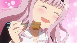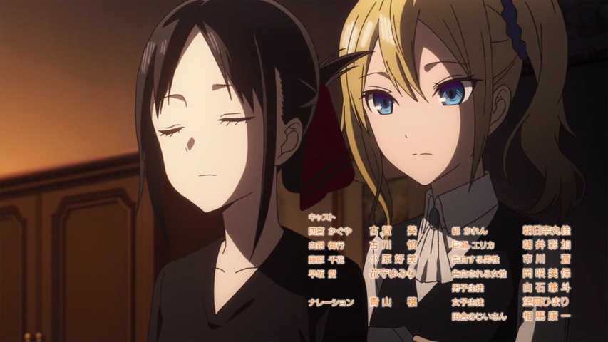 Kaguya-sama wa Kokurasetai: Tensai-tachi no Renai Zunousen is the last of the major new series on my radar for this somewhat undersized winter schedule. And it’s a big one too, the third of my top-level expectations shows for the season. But I was feeling oddly trepidatious going into this premiere. Usually with those series I’m either familiar with the material and extremely confident, or going in cold turkey on a hunch. But though I haven’t read the Kaguya-sama (fuck me if I’m going to type that whole title out one more time this week) manga, it almost feels like it because a lot of folks have – and it seems as if almost all of them have strong feelings about it one way or the other.Still, in all, this is one of the best aggregator-reviewed romcom manga out there (for whatever that’s worth). It’s published in a seinen magazine (which is probably worth more). And it’s directed by Hatakeyama Mamoru, fresh off one of the finest anime of the decade in Shouwa Genroku Rakugo Shinjuu (which counts most of all). So yeah, my expectations had to be pretty damn high – but the tempestuous reactions of manga readers had me thinking I was either going to love this series or hate it.Funnily enough, it was neither. I liked a lot about this first episode, some stuff about it bothered me, but my main reaction in the end was mild puzzlement over why this series seems to be such a big deal. It’s certainly not awful, so hard to get why some folks would feel strongly in that direction – but it didn’t strike me as being anything all that exceptional, either. I mean premise wise, it’s strictly retread tires with one twist (albeit the twist is central to the plot). That really means the strong feeling it elicits comes down to execution I guess, and the jury would still be out on that for me.First off let’s get the negatives out of the way, so we can focus on the good parts. The narration – that was a lot to take. I certainly have nothing against Aoyama Yutaka as an actor, or even with his performance here, and I get that the narration is part of the gag construction. But that was a lot to take. A lot– I mean, it was unrelenting. And it created a sort of implicit hand-holding by the narrative to make sure we knew when we were supposed to laugh. I don’t need or want that – I’ll laugh when something is funny (and I often did with this ep) and I won’t if it isn’t. One of the oldest rules of joke-telling is never explain the joke.That unrelenting quality – which extended to the visuals too – gave the whole episode a sort of SHAFT quality which hung in the air like a slightly-off smell in a crowded elevator. It shouldn’t be forgotten that Hatekayama-sensei cut his teeth at SHAFT, though he worked under the name Omata Shinichi there. Hey, I’d change my name if I used to work at SHAFT too, but old habits sometimes die hard. Shouwa Genroku certainly represented a big stylistic shift but 2012’s Sankarea was a lot closer to this post-SHAFT vibe Kaguya-sama is repping. I will say that it worked quite well for me with Sankarea for the most part (it might have even been a top 10 series if 2012 hadn’t been an all-time great anime year), but it remains to be seen if it will with this series.Apart from that, what essentially saved this premiere from going down the sinkhole was that it actually was funny a good chunk of the time. Romcoms about two essentially unlikable people have some hills to climb, and student council veep and general ojou-sama Kaguya Shinomiya (Koga Aoi) and seitoukaichou and top-ranked student Shirogane Miyuki (Furukawa Makoto) are pretty unlikable by design. You climb the hills mainly by casting those people as vulnerable (check) and by not taking the material too seriously (check). The gag is that the two of them are in-love with each other but so driven by pride and the idea that “love is war” that they’ll be damned if they’re going to be the first to confess. Hijinks, naturally, ensue.There were three mini-stories packed into this episode, with each principal “winning” one of them and one ending in a draw (I don’t know if that will be the case every week). The funniest of the three was the bento chapter, and it may not be a coincidence that it was the one that most prominently featured Fujiwara Chika (Kohara Konomi), the cheerfully airheaded student council secretary and general relationship obstacle/facilitator. Funnily enough, it helps when Fujiwara is around because she talks so much she pre-empts the narration, which feels like a welcome break. There were some good gags, sight and otherwise (the weed, and the indirect kiss) and the general youthful foolishness of the leads was exposited quite well.My worry here is staying power. The first episode was exhausting, yes – but equally of concern, my sense is that this is basically a one-joke premise. I love a good joke as much as the next man and probably more, but you’ve really got to be on your game if you’re going to milk the same one for an entire series and not have it go stale at some point. I see comic potential here, but unless the execution is so spectacular it changes the rules of the game, I would think there’d need to be some tonal variation and diversification of the humor to carry Kaguya-sama for an entire cour. Who knows, my read could be totally off and both of those things may be on the way in weeks ahead. I hope so, because I really want this show to work.