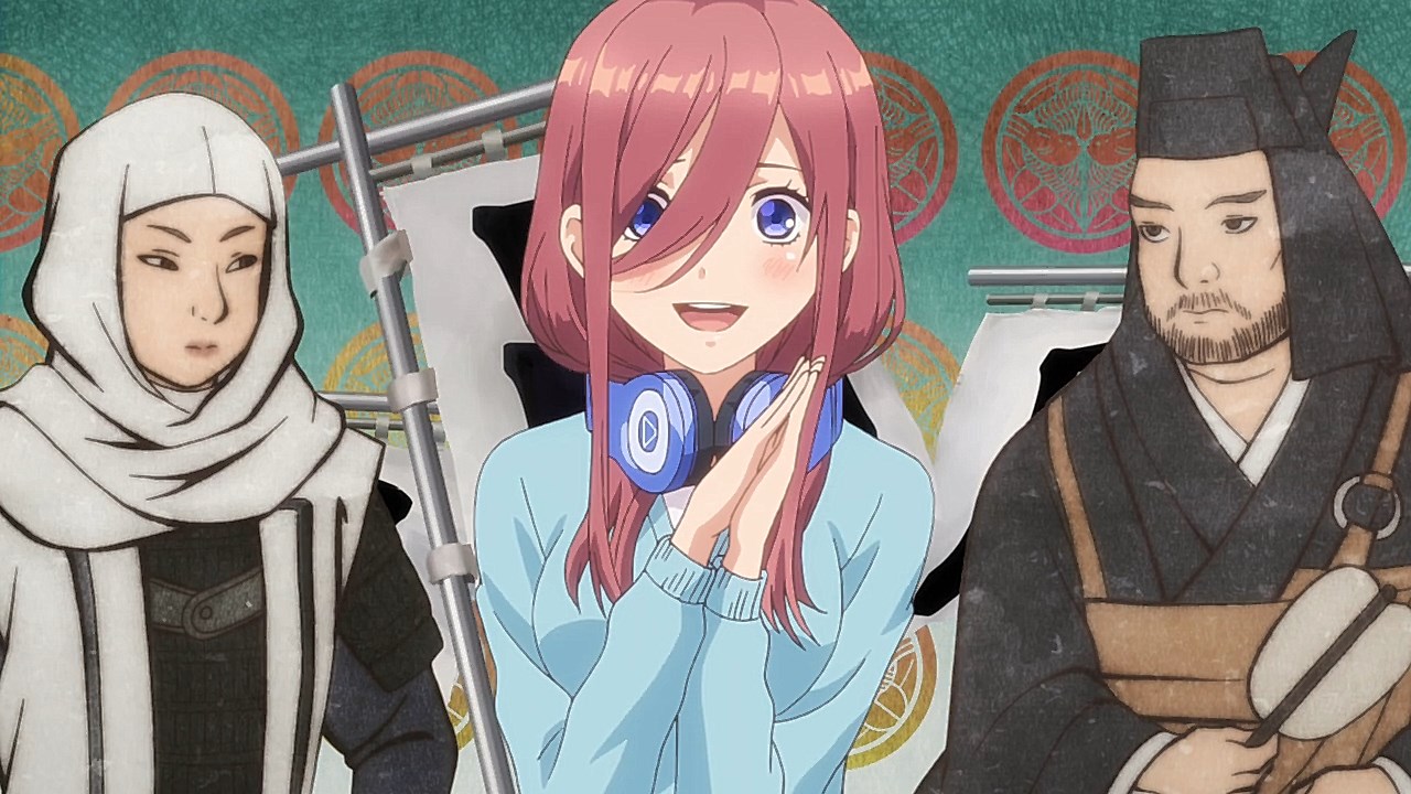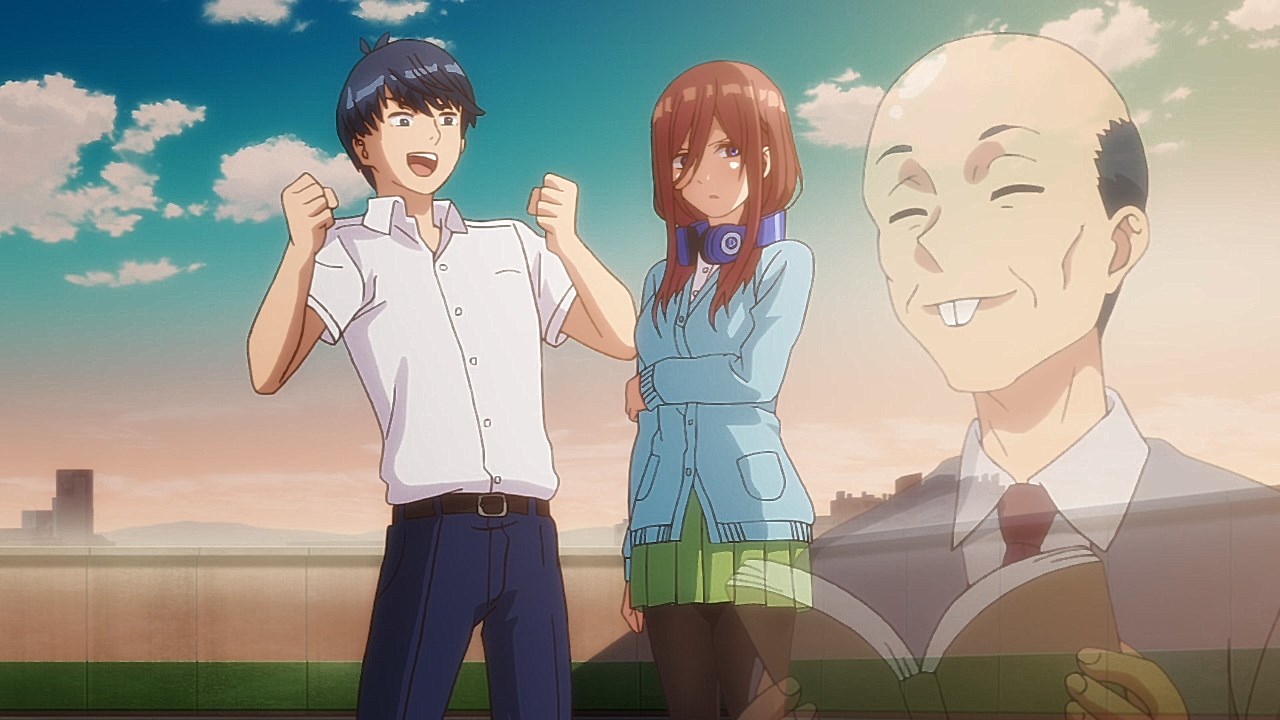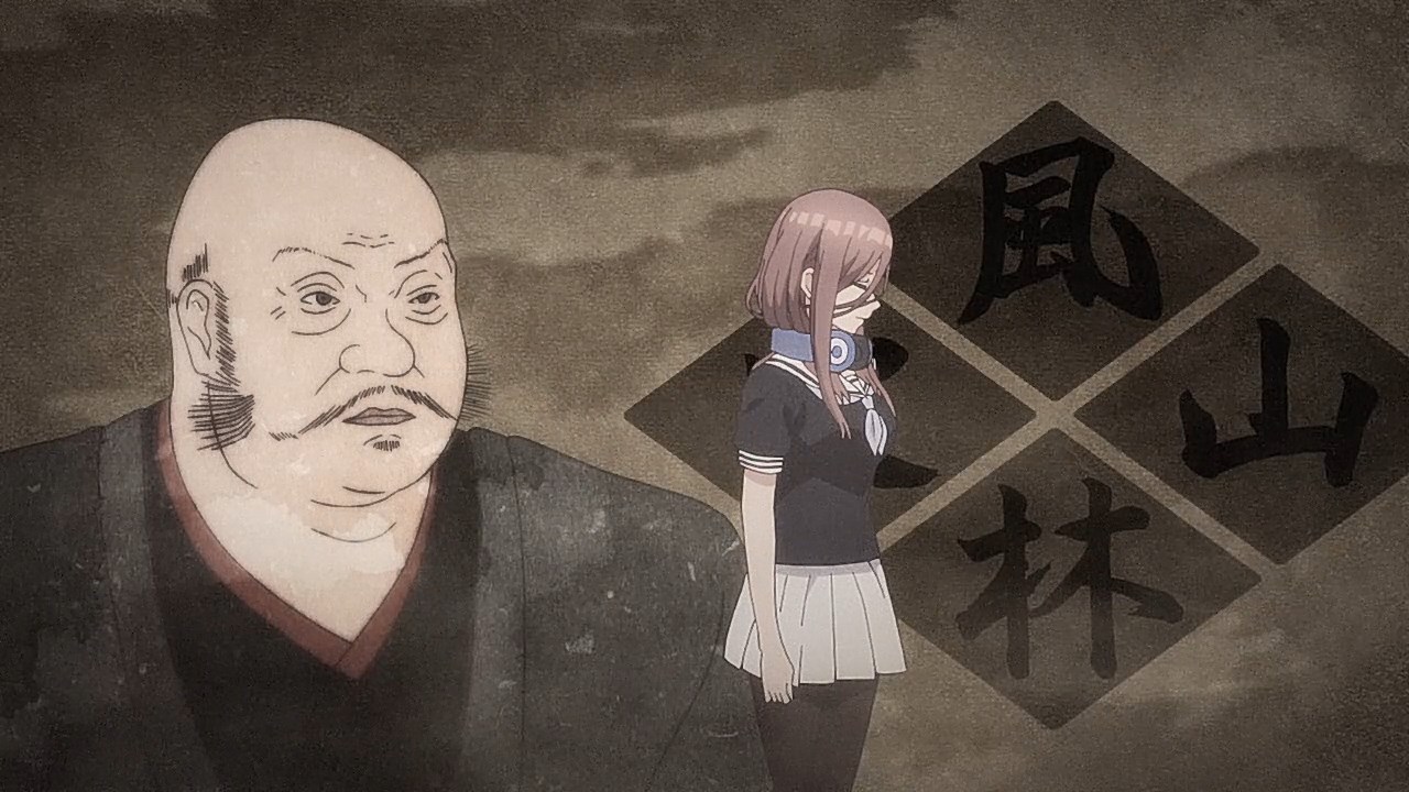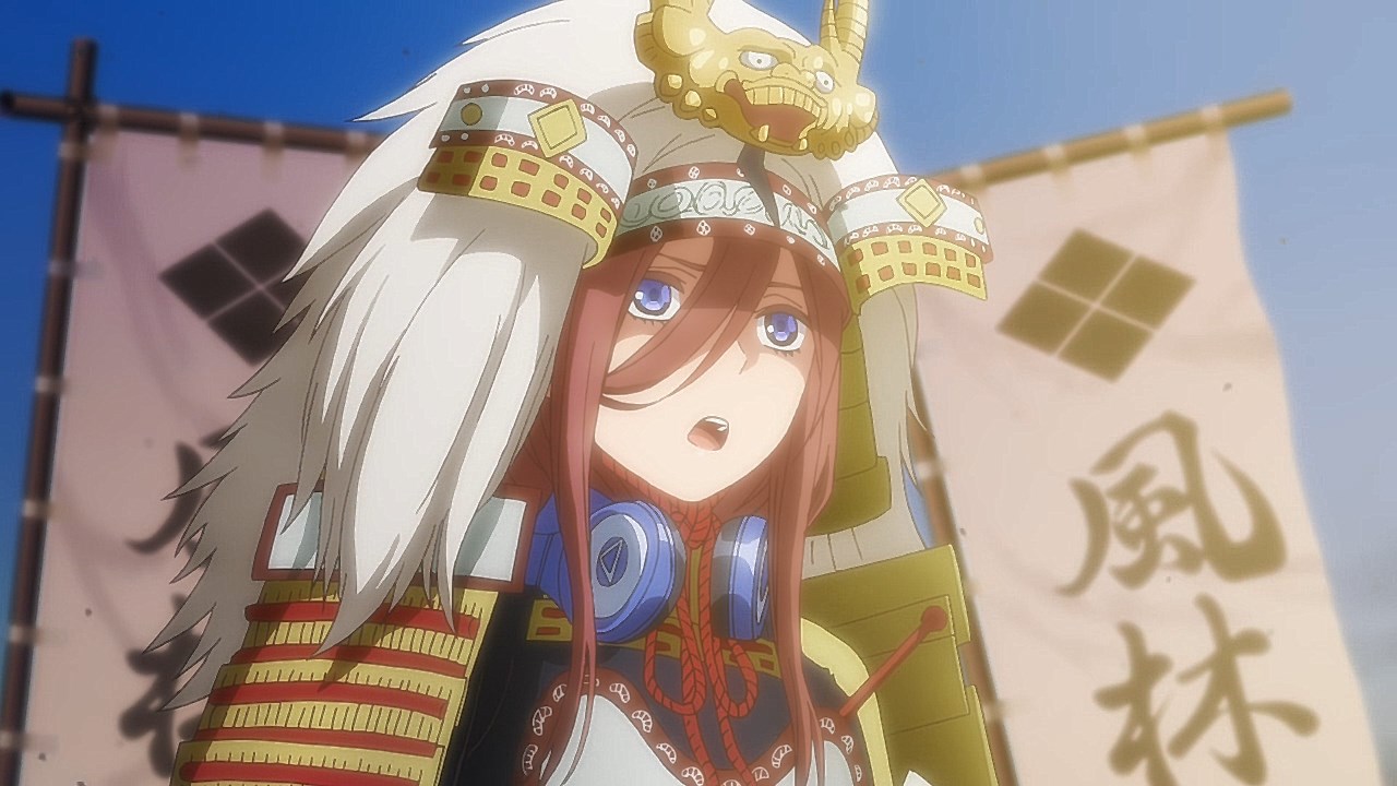 The second episode of Go-Toubun no Hanayome scratched an itch I didn’t realize was there with how Miku ended up being extremely cute. By showing Miku’s hidden obsession with Sengoku-era warlords, it not only gave her more knowledge to work with despite her and her sisters’ academic failings, but also gives her far more characterization as she tries to keep her repressed love a secret from her sisters.This episode’s main focus is on learning about what makes Miku tick. Even though she is often shy around others, it is the only way she was able to enjoy her hobby without the fear of being judged. Starting from the feelings she has for older, bearded generals from a historical app game, she then became obsessed with Sengoku warriors to the point of studying Japanese history. As a result, she’s able to answer every historical question she’s given despite failing in other subjects. Even though the Nakano’s siblings’ go-to response to Fuutarou’s tutoring is to run away as far as they can together, Miku showed the most creativity by putting on a bow to impersonate Yotsuba and point him in the wrong direction. It’s a funny moment, but it shows the hint of craftiness that Miku has in her problem-solving efforts. Another aspect of what make’s Miku’s point-of-view so special was being able to understand how important it is for her to find someone to talk with regarding her love for the Sengoku era. In the process of accepting Fuutarou’s tutoring offers, she’s also working towards an overall goal of being proud of what she knows, and trying not to see Sengoku-era history as a personal shame of hers. It was also impressive to have Miku see through Fuutarou and show him that there are still things that even he needs to learn. For being an astute person, Fuutarou’s knowledge on everything isn’t as encyclopedic as what Miku knows about the Sengoku era. This becomes a thorn in Fuutarou’s side because not only did his lack of knowledge in some references make Miku disinterested in learning under him, but most importantly, it was a wake-up call not to underestimate the Nakano sisters. To have been told he might not have all the answers rankled him so much that he used his studying habits to learn everything he needed to in order to match Miku. At the same time, his efforts would eventually drive him to do more to help these girls than to just hit their sweet spots or cater to their interests under the assumption that they’ll eat from the palm of his hand. Under that mentality, it only brought him to stumble around Miku. It’s honestly refreshing to see that Fuutarou isn’t completely perfect or stoic as he re-evaluates his approach and tries his best to make up for acting like he had all of the answers that Miku already knew. Additionally, knowing how gifted Miku is in her historical knowledge helped Fuutarou understand how the Nakano sisters are pieces to a bigger puzzle since each of them are masters of only one trade. I absolutely loved Miku, her quirks, and her growth as she decided to open up to tutoring, but the episode also gives us some extra tidbits on the other girls. Yotsuba continues to be such an amazing support system to Fuutarou as she is the only sister to eagerly ask for his advice on her poor exams. Additionally, she tries to make strides to help Miku get more accustomed to Fuutarou so she too can benefit from his tutoring, although some of this motivation is Yotsuba really wanting to know if Miku has a hidden crush. And speaking of that, Ichika has her humorous streak continue as well with how she tries to act as Fuutarou’s wingman to get some alone time with Miku and encourage Fuutarou to appreciate the idea that studying distracts them from being young and alive. It was also amusing to see how flustered Fuutarou got about the possibility of getting a love letter from Miku even after acting like love is a waste of time.It wouldn’t exactly be accurate to say that Go-Toubun no Hanayome is a guilty pleasure since it’s been doing a great job as a harem anime so far. However, it was hard not to be in high spirits after finding out how adorable and charming Miku turned out to be. I suppose that the nerdy moe appeal of Miku was too irresistible not to find endearing. It might be comfort food, but it’s just the right level of feel-good to make Go-Toubun no Hanayome an exciting series to continue following. I’m looking forward to seeing what the anime does to expand on Nino next time around.ED2 Sequence