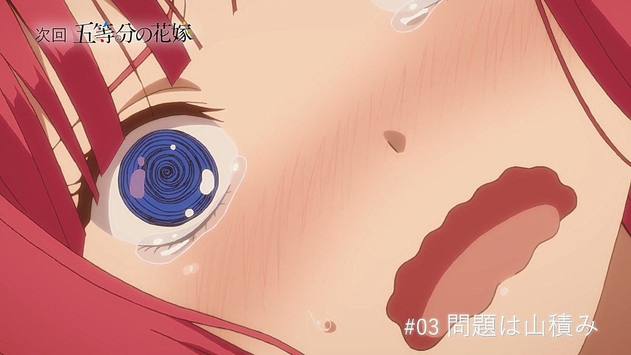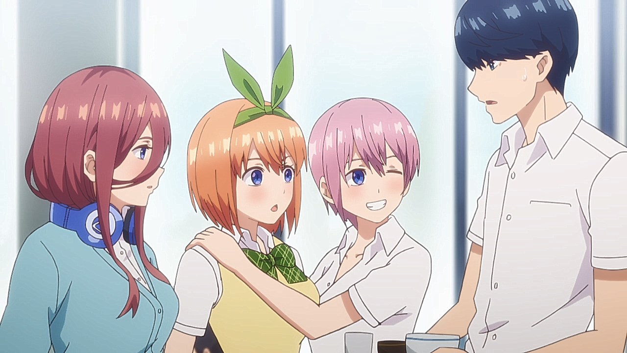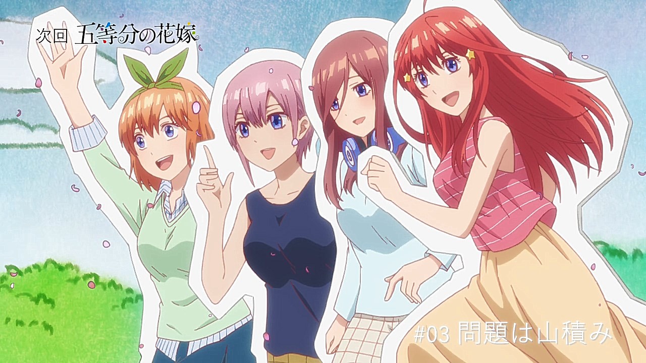 So after reading the impressions from the first episode (as well as searching for a backup harem anime this season just in case Date A Live III‘s off-model moments got worse**), I watched the first two episodes of Go-Toubun no Hanayome back-to-back.Needless to say, it was entertaining enough to add to this season’s “to-watch” list. (Hello, new guilty pleasure!)- Fuutarou is basically a black-haired Yu Narukami (Persona 4 protagonist) with a bigger ego.- I liked how Yotsuba’s ribbons somehow move on their own, similar to a certain skimpily-dressed destroyer girl from Kantai Collection.- I have this uneasy feeling Nino is gonna be a lot like Kirino (or from the same season, Kotori Itsuka in “black ribbon mode”) personality-wise.- Kana Hanazawa’s character just had to have a similar name (or perhaps they are written differently?) to the dense male protagonist of Infinite Stratos… (Poor Charlotte–unless you take the Infinite Stratos: Sugar and Honey manga to be the canon story.)- While it was nice to see Miku getting the first “day in the limelight” episode (and it’s easy to see why she’s “best girl” at this point), I would still love to see the other sisters get their day in the limelight.- From what I heard from the manga readers, the ecchi moments seem to have been toned down in the anime. (Damn, I’m tempted to read the manga now…) That said, I still wouldn’t mind “precision ecchi” scenes in the anime that can be used to great comedic effect.(** – Fortunately, episode 2 of DAL III put that worry to rest, at least for now.)
