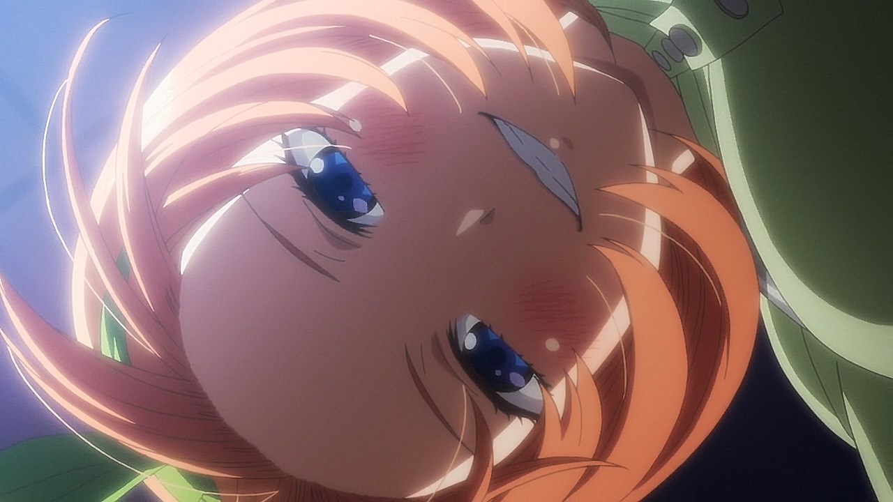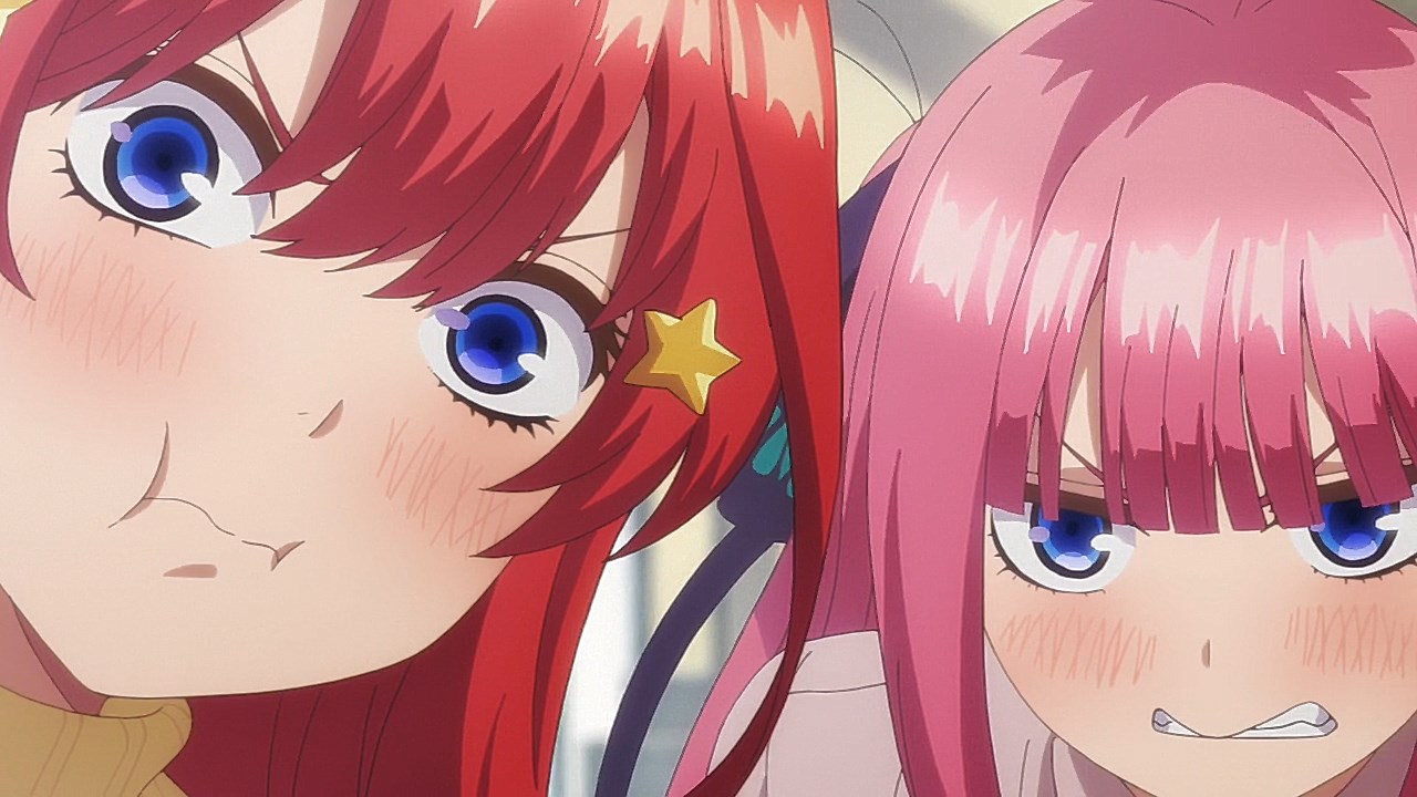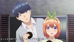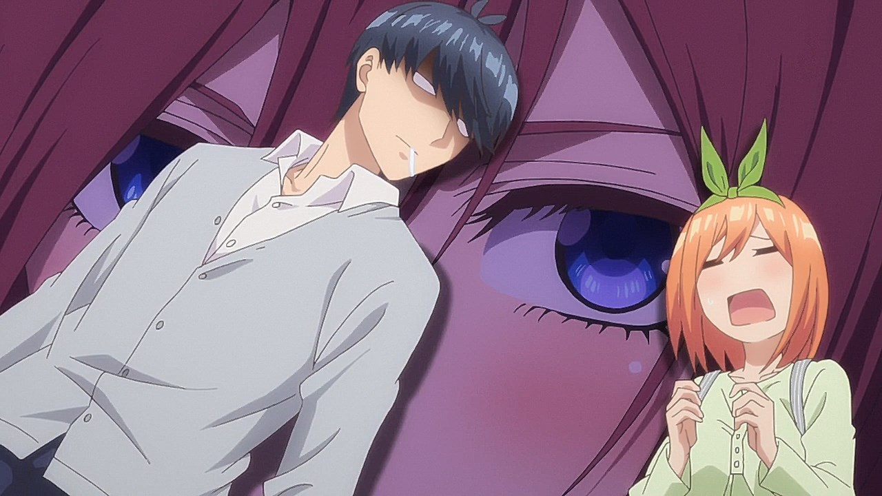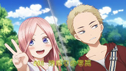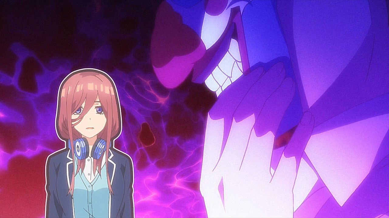 Following exam week, Fuutarou has his work cut out for him in Episode 08 as he figures out what his battle strategy should be from here. However, with explosive revelations coming left and right in this episode, Go-Toubun is looking to shift its focus on character relationships with many more allusions to both the idea of one of the sisters marrying him and one of the sisters knowing him in the past back when they were kids.In a change of pace, this episode gives some attention to Fuutarou, who is having a problem of his own when his student handbook goes missing in the Nakano’s condo. While it may just seem like your standard handbook, it has a photo of Fuutarou from back when he was a child, when he took on a blonder, rougher appearance. Fuutarou taking after his dad’s rebellious looks explains how his mindset was during his childhood, but also lets us understand that at some point between then and now, he made the resolve to change himself away from the delinquent look and take up a far more studious demeanor. Some of his mischevious behavior does come out in this episode when he aims to get revenge on the classmates who got him to be a part of the haunted house by scaring them. It does explain why he’s got a harder edge to him than other harem protagonists with how assertive he is, but applying his attitude towards getting the girls to study helps to flesh out Fuutarou’s character and show how he was able to channel his younger, rowdier self into his current, studious persona.Episode 08 also developed some of the Nakano sisters too as Yotsuba finally gets some time to herself with Fuutarou. So far, we’ve only gotten scenes where Yotsuba has cheered Fuutarou on from a distance while outright ignoring her studying. That changes in this episode with how she plays a pivotal role in trying to get on Fuutarou’s good side, starting with a failed attempt to get Nino and Itsuki to study by pretending that he’s gravely ill. For a positive change of pace, Yotsuba is also able to prioritize her studying to a larger degree as she puts basketball on-hold for the time being until she catches up with her education. For a spicer twist, we got a “confession” out of Yotsuba. It would definitely complicate matters if it was an earnest confession with Miku trying to get with him. But whether her insistence that she was kidding was a joke or not, it sure took Fuutarou aback. What is fascinating about Episode 08 are the implications it has towards the future. This episode was a chance for Nino to get back into the fold as Fuutarou had the chance to pierce her ears if it meant she wouldn’t look at his handbook. She was smitten by the older look Fuutarou had since she loves the bad boys, but with Fuutarou insisting that he was a relative, it put their particular development on-hold. He’s still keeping the door open considering that he was anticipating having her meet the guy in the picture someday. When she left the room, it’s revealed that part of the image was obscured specifically because the other side of the picture had a girl who is one of the Nakano sisters next to him. That brings in two mysteries for the series: “Who is the bride?” and “Which sister is the girl in the photo?” While there were other key moments in the episode such as Ichika being the first girl to ask for his email address (and threatening to send a picture of him sleeping on her lap if he didn’t gather the others), Miku making overbaked croquettes that Fuutarou ended up liking anyways, and Fuutarou cursing in English, this was an episode that ended on an explosive note that will eventually pave the way towards the series’ greatest mysteries being answered.Preview