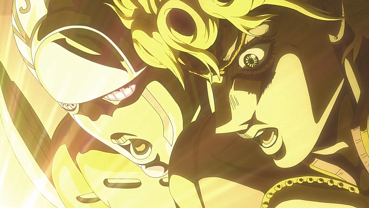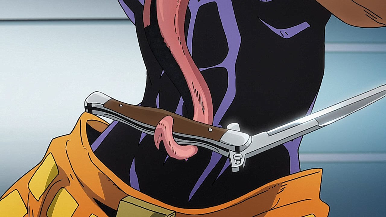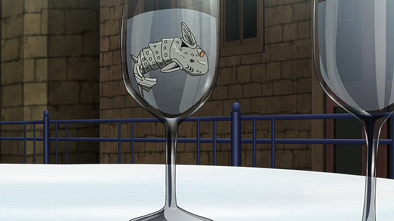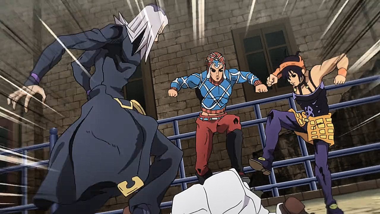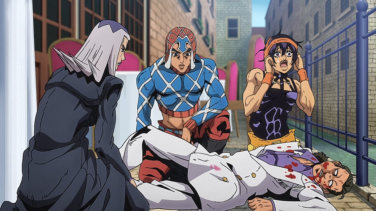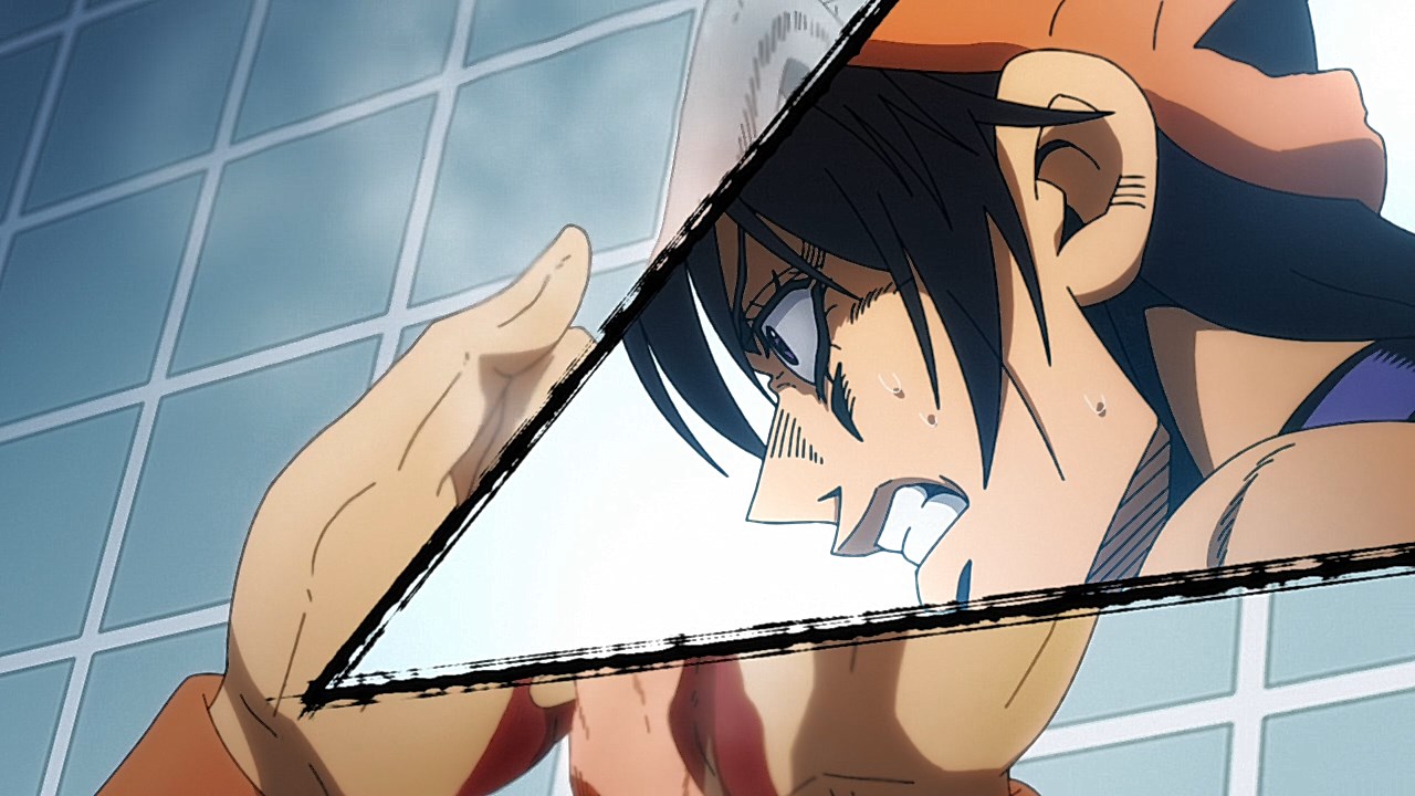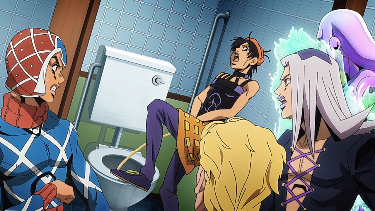 To get the most obvious out of the way first, this episode marks the grand debut of the new opening and ending themes. With the OP, they bring back Hasegawa Daisuke, the performer of Part IV’s “Great Days”, to perform the Part V-centric “Traitor’s Requiem”. At the moment, it doesn’t have the catchiness or bombast of Coda’s “Fighting Gold”, but makes up for it in the polished visuals of the OP. They did give away quite a few spoilery details, more than “Fighting Gold”, but as a manga reader, it was exciting to see what was being foreshadowed. The ending is much more interesting as they switched in another song from a Western artist. This time around it’s Enigma. Remember that Stand user from Part IV that creepily trapped Josuke’s mom in his Stand book only for Fungami Yuya to gladly turn himself into a piece of paper to turn the tables and trap him in his own book? This is where his Stand name comes from. But rather than choosing their bigger smash hits like “Return to Innocence” or “Sadeness”, they went with a deeper cut from 2000 called “Modern Crusaders”. Understandably, the title alone fits in by positioning Passione as the newer equivalent of the Stardust Crusaders from Part III. What I personally enjoyed about the two sequences, however, is how much they call back to prior fights. Whereas the OP skims the highlights of the first half’s fights, the ED has a stone pillar with a collection of Stands that are featured in Part V starting with Black Sabbath and ending with Gold Experience. It was nice to see them looking back at past fights, especially with so many of them in the rear view as Passione starts to take on the Boss’ own personnel. Despite the “quality” that permeated the deteriorating art of this episode, the content makes up greatly for these shortcomings. This sections fight is particularly fun because of how much chemistry that Tiziano and Squalo have with one another through both their personalities and abilities. So far, dual opponents have tended to be disjointed with how Pesci had to maneuver around Grateful Dead to try to lure out Passione without getting caught and how Prosciutto had to deal with Pesci’s erratic behavior in order to better utilize his Stand on the train. The big brother/mammoni relationship of Prosciutto and Pesci made it all the harder for them to work together without the former getting angry or the latter trying to lean on his aniki. With Tiziano and Squalo, however, their relationship is more symbiotic, starting with how comfortable they are with feeling up on each other as they formulate a plan to take on Passione. On top of their overall confidence in their relationship together, their confidence helps the two know exactly how their Stand abilities can complement each other. As a result, Squalo’s “Clash” synergizes comfortably and effectively with Tiziano’s “Talking Head” to trap Narancia into dooming his squad. As proof of their deep bond, Tiziano’s main strategy in the fight is to use Talking Head to manipulate Narancia into misleading Passione into a watery death trap where Clash can freely move about to strike as many of his targets as necessary. It’s one of those fascinating battles in JoJo where, because their current opponents have remote Stand abilities, our protagonists have to rely on their wits rather than their strength to win the battle. In Narancia’s Talking Head-induced trance, he has to find a way to communicate with his friends without leading any one of them to a shark-infested demise. And because Narancia isn’t the sharpest tool in the shed, his only means of making sure he can try to effectively stop his friends from heeding his misleading advice is through over-the-top physical actions such as peeing in front of everyone and cauterizing a wound with a burning handrail. It’s hard not to get excited about the battle when it encapsulates how much thorough planning and quick-wittedness goes into constructing such fights. Where only time would be able to tell how the dimmest member of Passione could find a way to out-maneuver two Stand users with such a strong connection that their abilities work in unison to create a highly-lethal combination. Where the plot goes with Trish as they plan to unearth the Boss’ identity at his hometown of Sardina will be neat to see unfold, but first, we’ll have to see what will happen now that Giorno is being attacked by Clash.ED3 Sequence