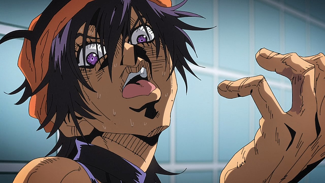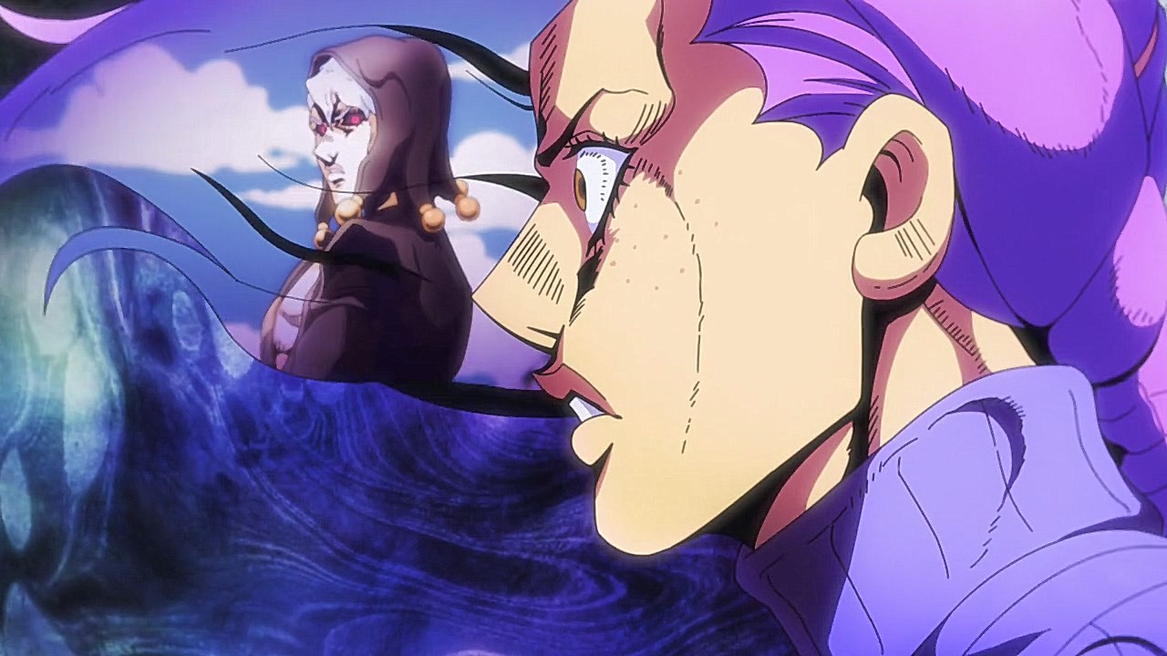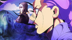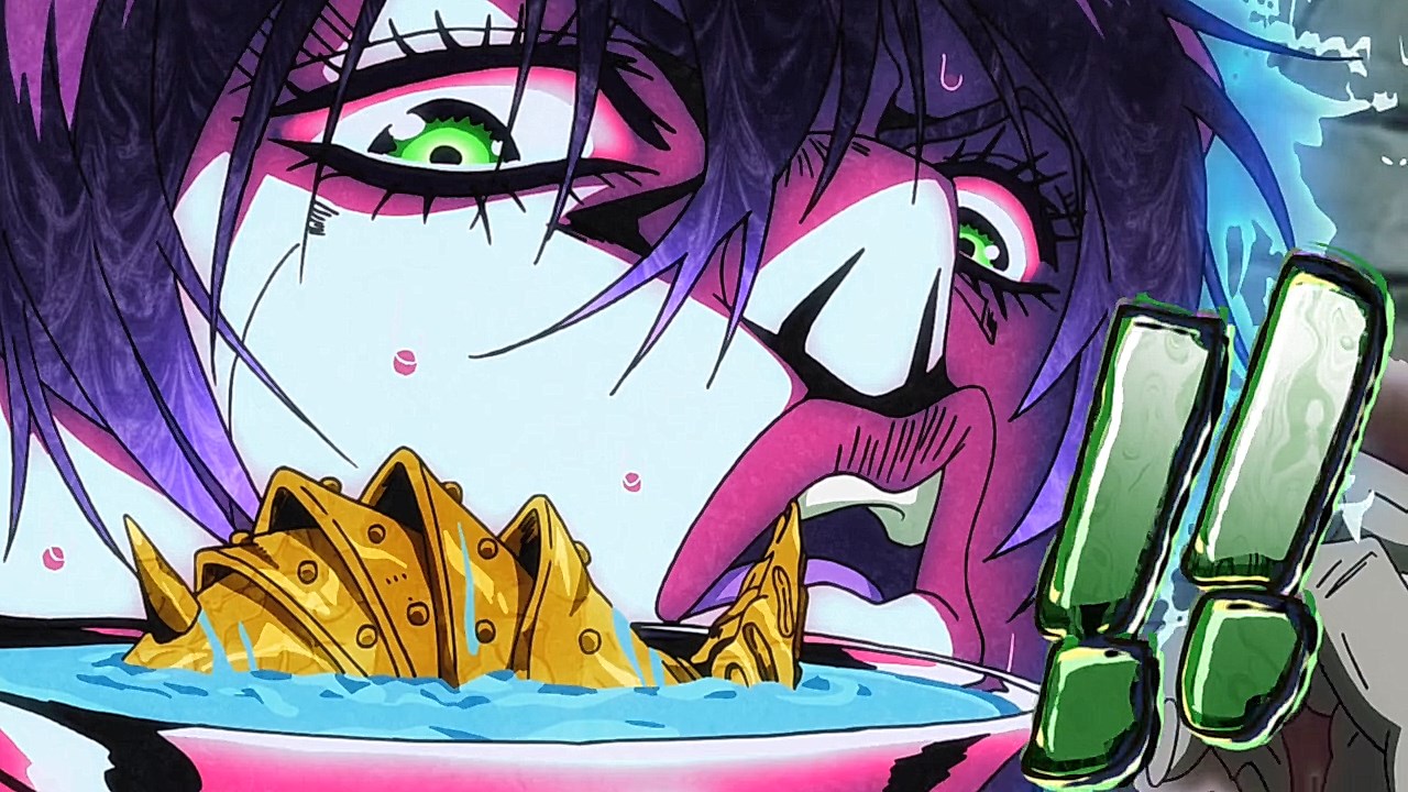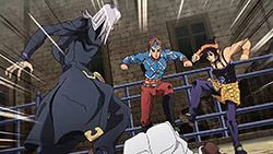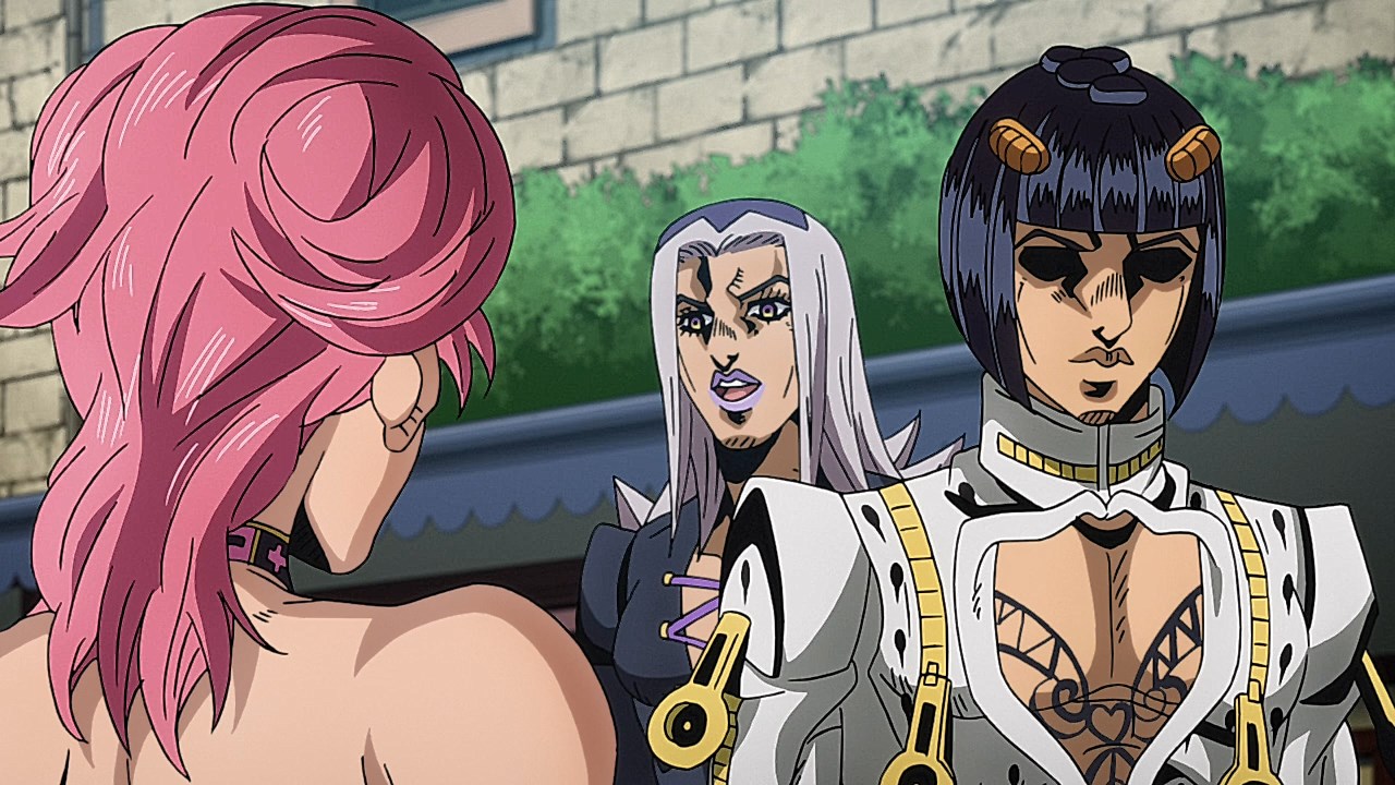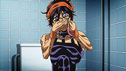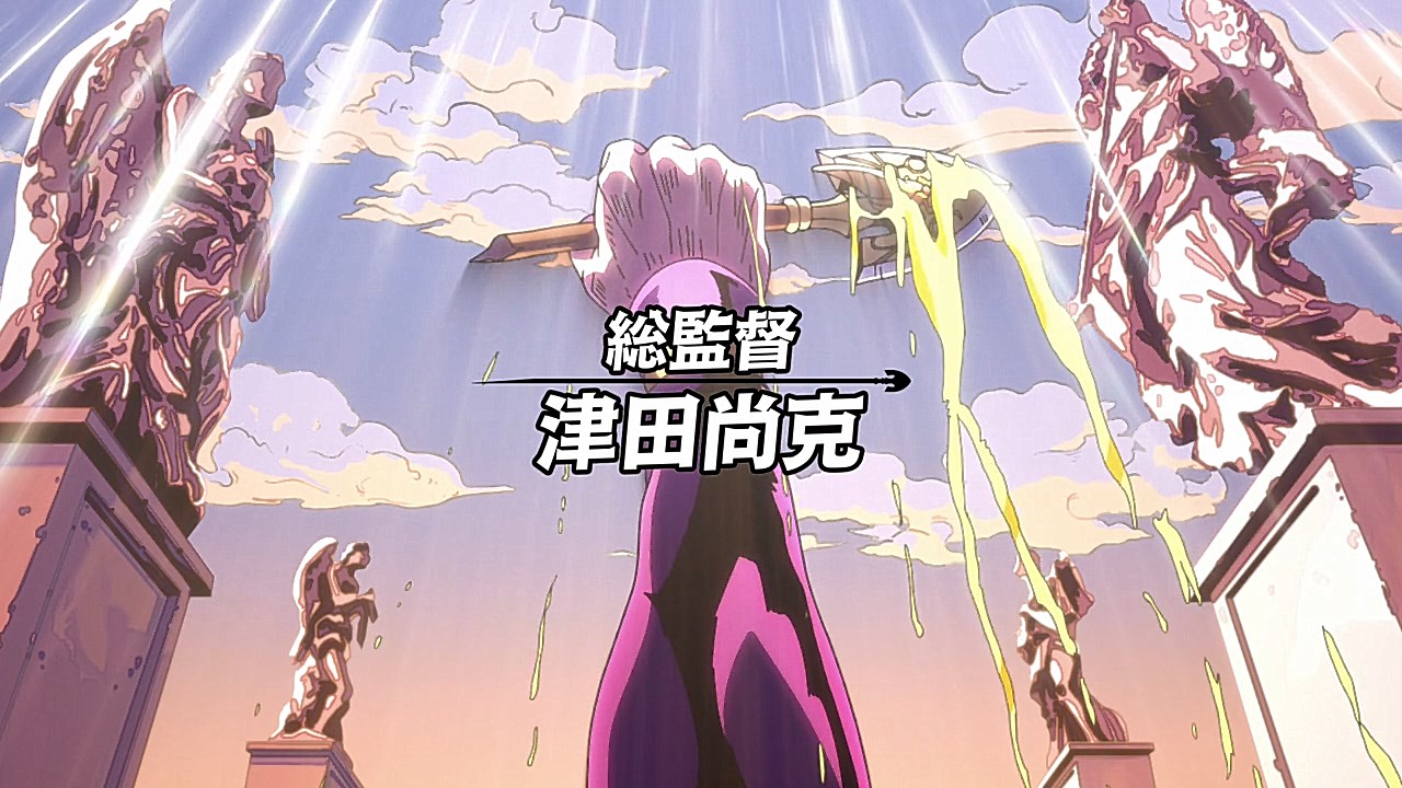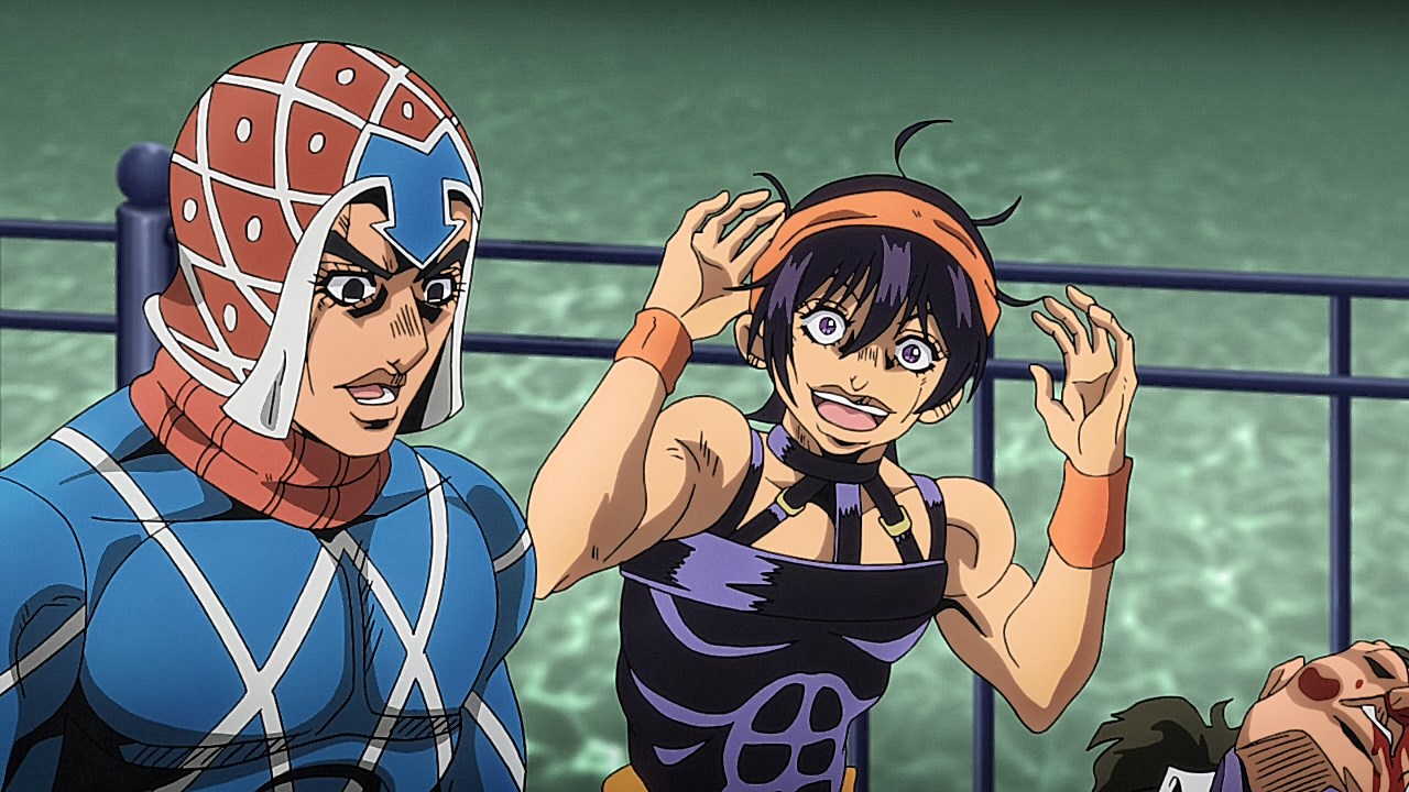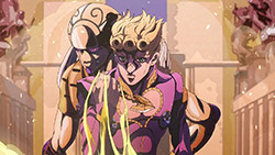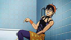 To get the most obvious out of the way first, this episode marks the grand debut of the new opening and ending themes. With the OP, they bring back Hasegawa Daisuke, the performer of Part IV’s “Great Days”, to perform the Part V-centric “Traitor’s Requiem”. At the moment, it doesn’t have the catchiness or bombast of Coda’s “Fighting Gold”, but makes up for it in the polished visuals of the OP. They did give away quite a few spoilery details, more than “Fighting Gold”, but as a manga reader, it was exciting to see what was being foreshadowed. The ending is much more interesting as they switched in another song from a Western artist. This time around it’s Enigma. Remember that Stand user from Part IV that creepily trapped Josuke’s mom in his Stand book only for Fungami Yuya to gladly turn himself into a piece of paper to turn the tables and trap him in his own book? This is where his Stand name comes from. But rather than choosing their bigger smash hits like “Return to Innocence” or “Sadeness”, they went with a deeper cut from 2000 called “Modern Crusaders”. Understandably, the title alone fits in by positioning Passione as the newer equivalent of the Stardust Crusaders from Part III. What I personally enjoyed about the two sequences, however, is how much they call back to prior fights. Whereas the OP skims the highlights of the first half’s fights, the ED has a stone pillar with a collection of Stands that are featured in Part V starting with Black Sabbath and ending with Gold Experience. It was nice to see them looking back at past fights, especially with so many of them in the rear view as Passione starts to take on the Boss’ own personnel. Despite the “quality” that permeated the deteriorating art of this episode, the content makes up greatly for these shortcomings. This sections fight is particularly fun because of how much chemistry that Tiziano and Squalo have with one another through both their personalities and abilities. So far, dual opponents have tended to be disjointed with how Pesci had to maneuver around Grateful Dead to try to lure out Passione without getting caught and how Prosciutto had to deal with Pesci’s erratic behavior in order to better utilize his Stand on the train. The big brother/mammoni relationship of Prosciutto and Pesci made it all the harder for them to work together without the former getting angry or the latter trying to lean on his aniki. With Tiziano and Squalo, however, their relationship is more symbiotic, starting with how comfortable they are with feeling up on each other as they formulate a plan to take on Passione. On top of their overall confidence in their relationship together, their confidence helps the two know exactly how their Stand abilities can complement each other. As a result, Squalo’s “Clash” synergizes comfortably and effectively with Tiziano’s “Talking Head” to trap Narancia into dooming his squad. As proof of their deep bond, Tiziano’s main strategy in the fight is to use Talking Head to manipulate Narancia into misleading Passione into a watery death trap where Clash can freely move about to strike as many of his targets as necessary. It’s one of those fascinating battles in JoJo where, because their current opponents have remote Stand abilities, our protagonists have to rely on their wits rather than their strength to win the battle. In Narancia’s Talking Head-induced trance, he has to find a way to communicate with his friends without leading any one of them to a shark-infested demise. And because Narancia isn’t the sharpest tool in the shed, his only means of making sure he can try to effectively stop his friends from heeding his misleading advice is through over-the-top physical actions such as peeing in front of everyone and cauterizing a wound with a burning handrail. It’s hard not to get excited about the battle when it encapsulates how much thorough planning and quick-wittedness goes into constructing such fights. Where only time would be able to tell how the dimmest member of Passione could find a way to out-maneuver two Stand users with such a strong connection that their abilities work in unison to create a highly-lethal combination. Where the plot goes with Trish as they plan to unearth the Boss’ identity at his hometown of Sardina will be neat to see unfold, but first, we’ll have to see what will happen now that Giorno is being attacked by Clash.ED3 Sequence