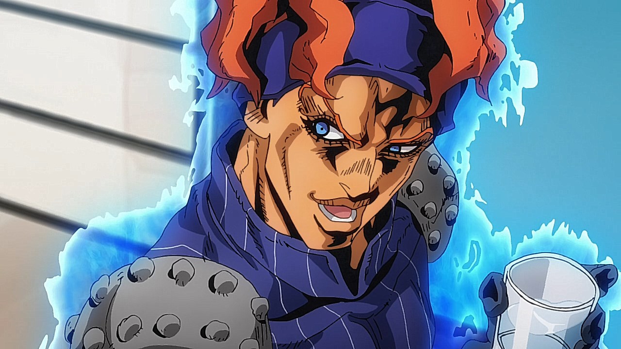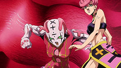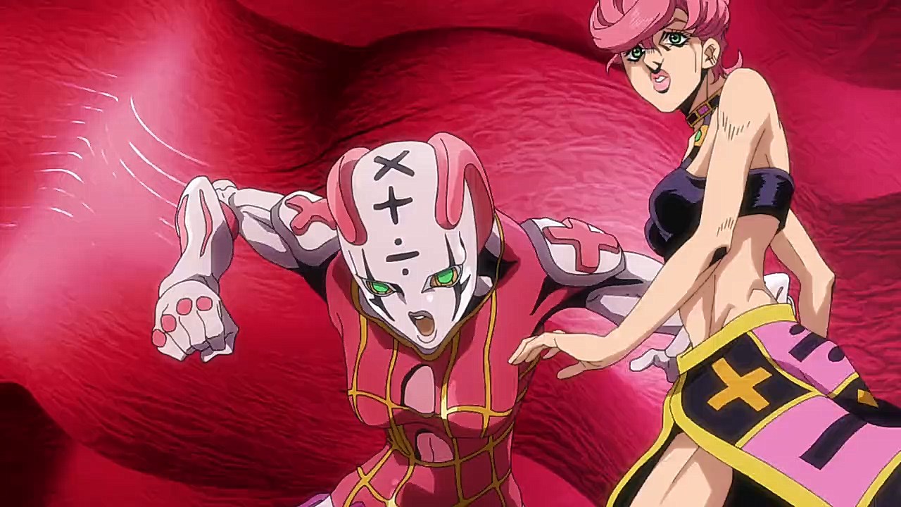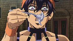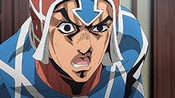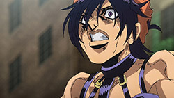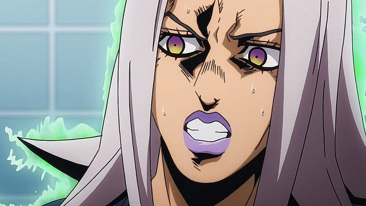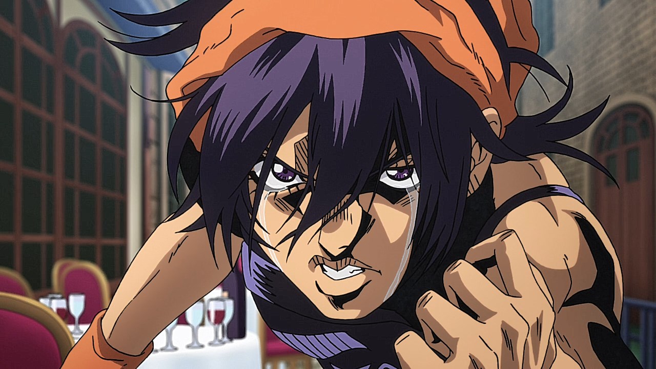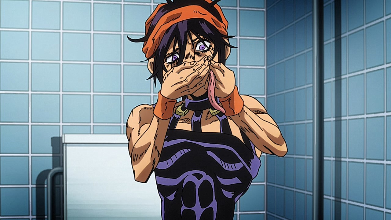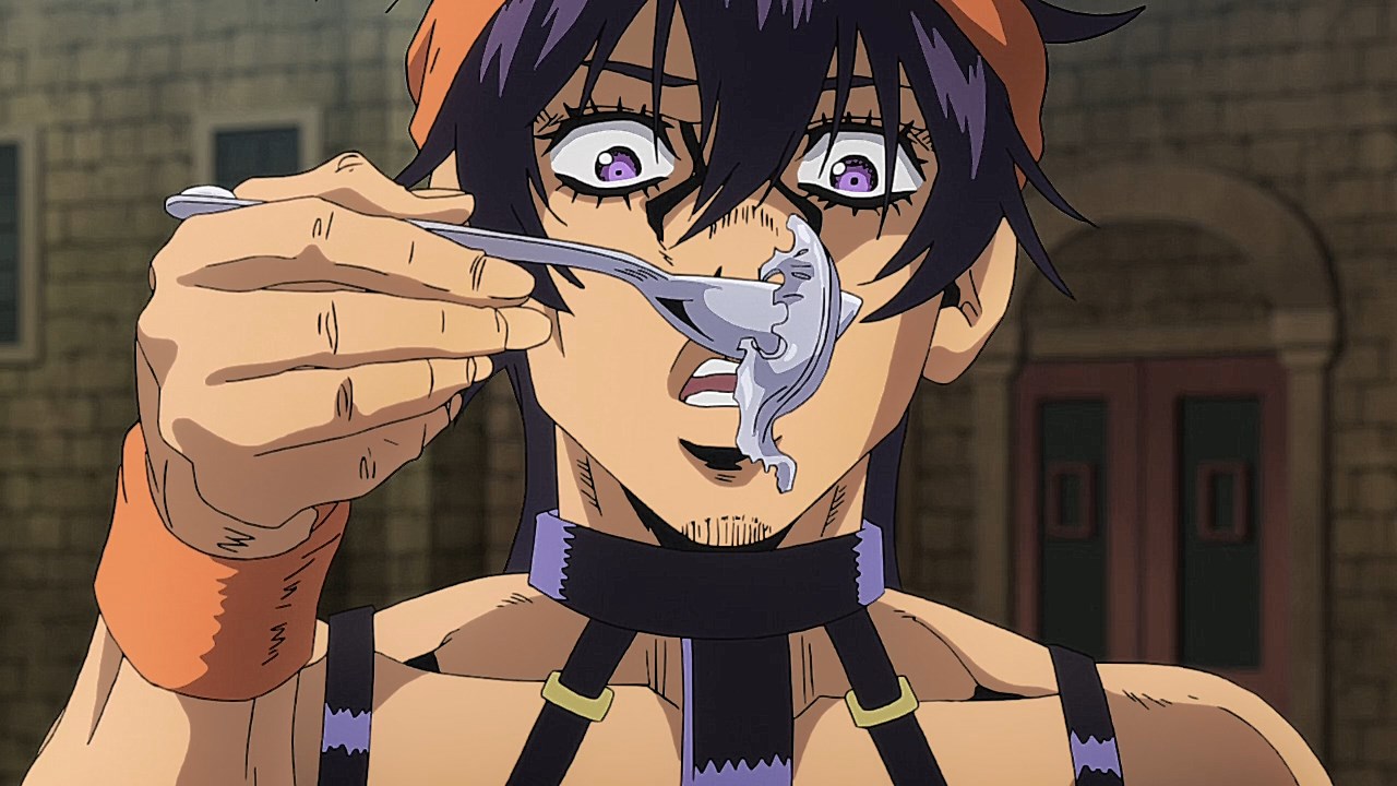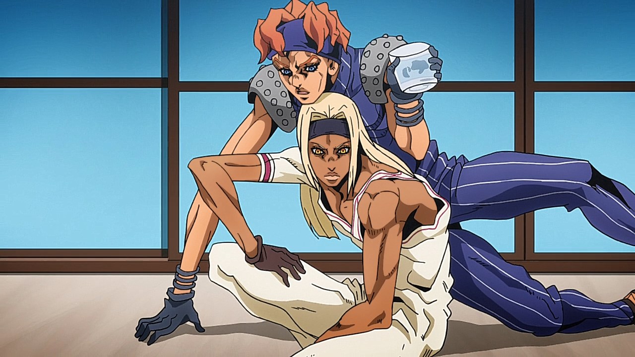 To get the most obvious out of the way first, this episode marks the grand debut of the new opening and ending themes. With the OP, they bring back Hasegawa Daisuke, the performer of Part IV’s “Great Days”, to perform the Part V-centric “Traitor’s Requiem”. At the moment, it doesn’t have the catchiness or bombast of Coda’s “Fighting Gold”, but makes up for it in the polished visuals of the OP. They did give away quite a few spoilery details, more than “Fighting Gold”, but as a manga reader, it was exciting to see what was being foreshadowed. The ending is much more interesting as they switched in another song from a Western artist. This time around it’s Enigma. Remember that Stand user from Part IV that creepily trapped Josuke’s mom in his Stand book only for Fungami Yuya to gladly turn himself into a piece of paper to turn the tables and trap him in his own book? This is where his Stand name comes from. But rather than choosing their bigger smash hits like “Return to Innocence” or “Sadeness”, they went with a deeper cut from 2000 called “Modern Crusaders”. Understandably, the title alone fits in by positioning Passione as the newer equivalent of the Stardust Crusaders from Part III. What I personally enjoyed about the two sequences, however, is how much they call back to prior fights. Whereas the OP skims the highlights of the first half’s fights, the ED has a stone pillar with a collection of Stands that are featured in Part V starting with Black Sabbath and ending with Gold Experience. It was nice to see them looking back at past fights, especially with so many of them in the rear view as Passione starts to take on the Boss’ own personnel. Despite the “quality” that permeated the deteriorating art of this episode, the content makes up greatly for these shortcomings. This sections fight is particularly fun because of how much chemistry that Tiziano and Squalo have with one another through both their personalities and abilities. So far, dual opponents have tended to be disjointed with how Pesci had to maneuver around Grateful Dead to try to lure out Passione without getting caught and how Prosciutto had to deal with Pesci’s erratic behavior in order to better utilize his Stand on the train. The big brother/mammoni relationship of Prosciutto and Pesci made it all the harder for them to work together without the former getting angry or the latter trying to lean on his aniki. With Tiziano and Squalo, however, their relationship is more symbiotic, starting with how comfortable they are with feeling up on each other as they formulate a plan to take on Passione. On top of their overall confidence in their relationship together, their confidence helps the two know exactly how their Stand abilities can complement each other. As a result, Squalo’s “Clash” synergizes comfortably and effectively with Tiziano’s “Talking Head” to trap Narancia into dooming his squad. As proof of their deep bond, Tiziano’s main strategy in the fight is to use Talking Head to manipulate Narancia into misleading Passione into a watery death trap where Clash can freely move about to strike as many of his targets as necessary. It’s one of those fascinating battles in JoJo where, because their current opponents have remote Stand abilities, our protagonists have to rely on their wits rather than their strength to win the battle. In Narancia’s Talking Head-induced trance, he has to find a way to communicate with his friends without leading any one of them to a shark-infested demise. And because Narancia isn’t the sharpest tool in the shed, his only means of making sure he can try to effectively stop his friends from heeding his misleading advice is through over-the-top physical actions such as peeing in front of everyone and cauterizing a wound with a burning handrail. It’s hard not to get excited about the battle when it encapsulates how much thorough planning and quick-wittedness goes into constructing such fights. Where only time would be able to tell how the dimmest member of Passione could find a way to out-maneuver two Stand users with such a strong connection that their abilities work in unison to create a highly-lethal combination. Where the plot goes with Trish as they plan to unearth the Boss’ identity at his hometown of Sardina will be neat to see unfold, but first, we’ll have to see what will happen now that Giorno is being attacked by Clash.ED3 Sequence