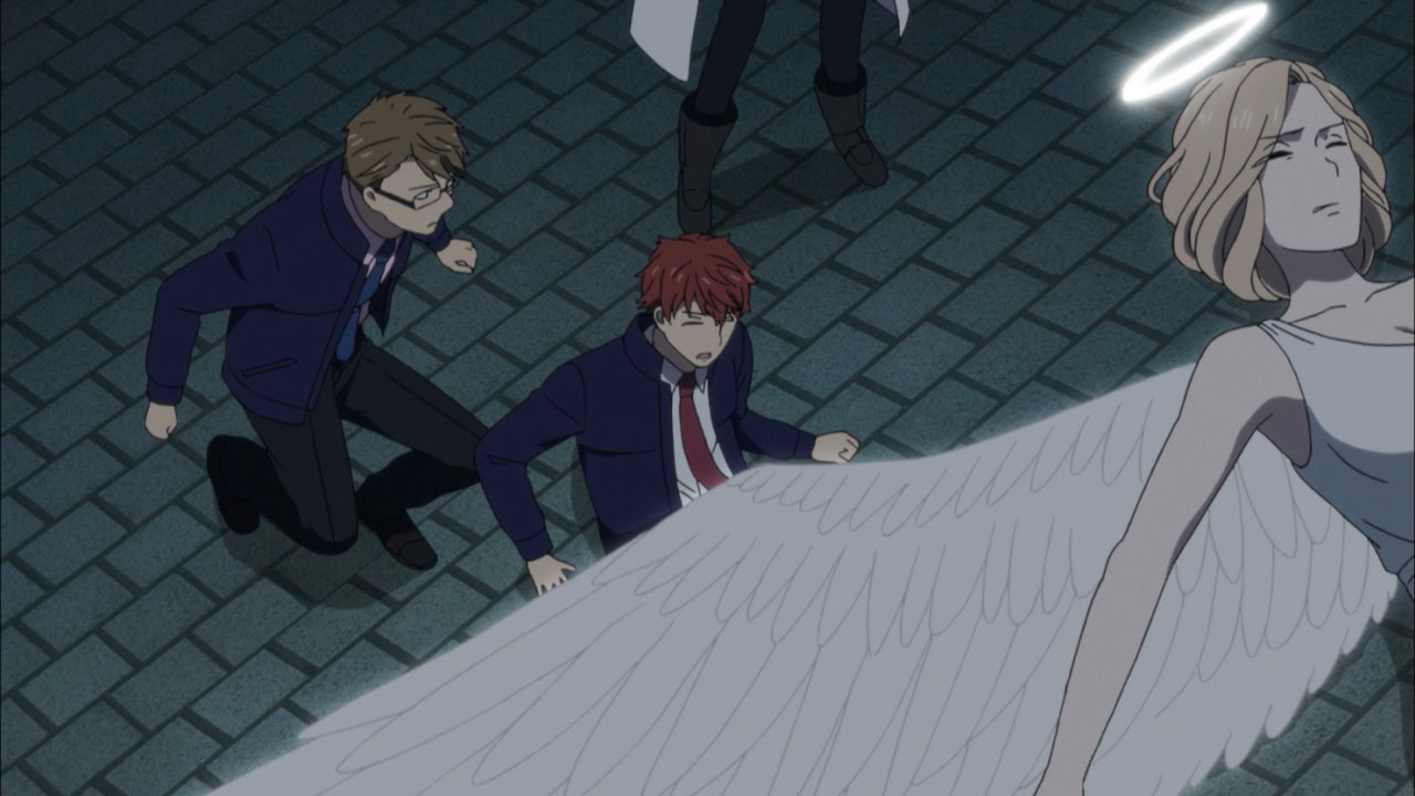 Since it’s Arata’s first day in the Shinjuku Ward Office’s “Nighttime Regional Relations” department, he’s still a little wet behind the ears. Luckily, he has the oddball pair of Seo (Irino Miyu), a blunt scientist with an effeminate figure, and Sakaki (Maeno Tomoaki), a former host, to show him the ropes. At first, it seemed like Arate was in for a steep learning curve, since he was assigned to take care of and manage angels and youkai without even believing they exist, but it’s quickly revealed that Arata is the only human capable of understanding the youkai’s language. He first discovers this gift when listening in on a tengu and an angel couple discussing their elopement in the Shinjuku Imperial Gardens. The interaction between the lovers felt so comedically overdramatic I half-expected Sakaki to pull out a bag of popcorn, but then it was revealed that none of the other humans could understand what “Anothers” say. This may have even led to humans thinking the youkai and angels and fairies weren’t capable of higher thought, since Seo compared speaking with them to speaking with cats and dogs, and has definitely led to unnecessary conflicts in the past.