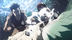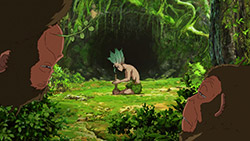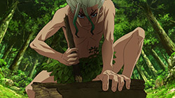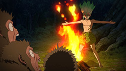 Diving into the other half of the episode, it was fun to get a peek at just what Senku went through as he began his journey into recreating civilization. Or rather, it was fun watching Senku overcome all of his shortcomings in a world without technology one step at a time. From starting a fire to building a shelter to protect him from the elements, it was just a damn good time watching his intelligence provide the jumping off point to moving forward. It also didn’t hurt to see all of those damn monkeys get put in their place for talking so much smack about Senku — but that was just the cherry on top of watching a well-done montage.