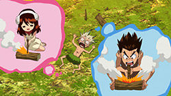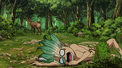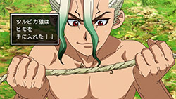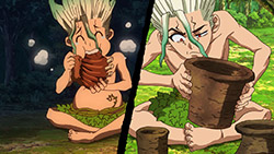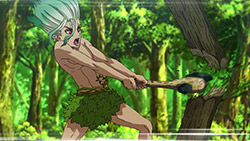 I loled when Senku tried to make fire… and failed. Frankly, that’s almost impossible to do without a firebow. So next scene he twisted himself some rope and made a firebow. Nice touch.There’s a lot of such details – like chewing animal skin to make rawhide – showing that author clearly did his homework.
