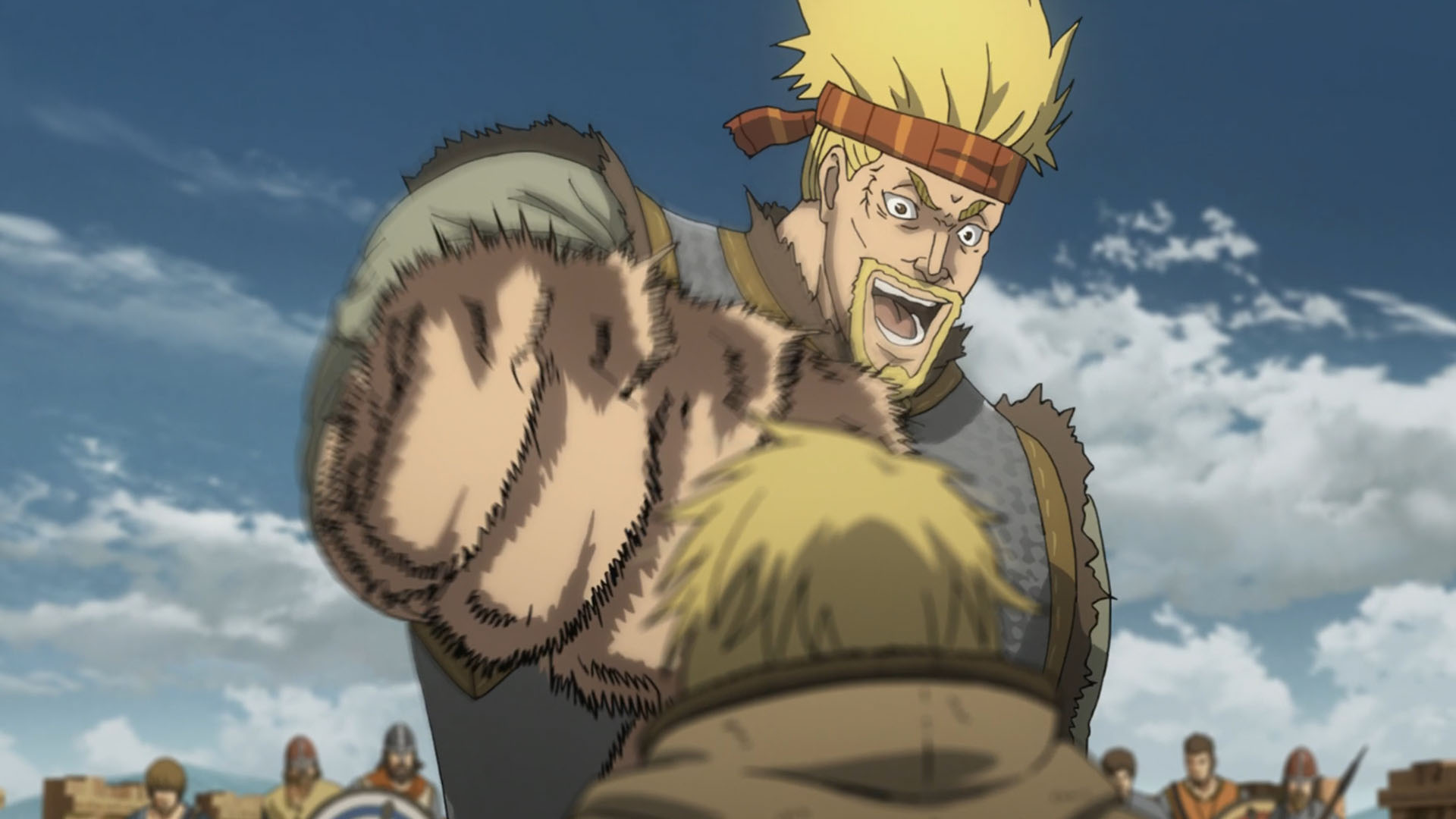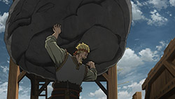 1013 AD – the combined forces of King Sweyn and the viking try to capture London, but find themselves held at London Bridge. As someone who’s walked up and down the Thames and London Bridge countless times, it’s so hard for me to imagine that everything used to look like that 1000 years ago! Back then, makes sense it was full of wooden structures, surrounded by swathes of green speckled with settlements, and strewn with the mangled corpses of men who died in battle. Now, it’s just an urban metropolis with tall metal buildings sprawling as far as the eye can see, and emotionless crowds of people. I would happily take the second choice without a question, because although times were much more exciting back then (though Brexit and Trump give them a run for their money), nothing beats stability, safety, and a steady provision of resources such as food and water. At least for sane people like myself. But it’s just so weird thinking that there’s so much history to this place where people led lives that are different from current times, and it’s interesting to think that people back then could never have envisioned the kind of progress humans would make in the next 1000 years. And I believe that remains the case, even today.To kick things off, Bjorn makes the assumption that Thorkell is a hired gun that would happily flog himself to the highest bidder. Little does he know that this giant is a quite insane, refusing Floki’s higher monetary offer simply because it would be more fun to fight for the losing side against more challenging opposition. And I have to say, Thorkell’s stole the show every single time he appeared on the screen, emanating with a continuous torrent of charisma and strength. Though he may grin like an idiot, he posed an absolutely formidable presence. I doubt even the Mountain from Game of Thrones could chuck a boulder that size, or throw giant wooden pillars sundering ships apart as if they were javelins. If he had his hand wrapped around my head like that, I’d be shitting my pants, figuratively and literally. To say Thorkell’s got a few screws loose would be kindly putting it. This is a man who completely lives for the sake of battling. He fights for the sheer hedonistic fun of it. And you know, he’s damn good at it too. I find it extremely impressive that his abilities alone essentially allowed the defenders to successfully hold London Bridge, and fend off the combined Nordic invasion. Upon sighting Thorfinn, he calls off his men and engages the boy in a 1v1 duel. The CG animation was thoroughly breathtaking, and since the visual perspective came from behind Thorfinn, you could feel the sheer pressure and intimidation that Thorkell’s massive fists alone were exerting. In a fair fight, no way Thorfinn stands any semblance of a chance. Thorkell’s vitals are too high for Thorfinn’s blades to reach, and if Thorfinn takes a single hit from this Goliath-esque specimen, it’s game over. This makes for an extremely intense duel, where the odds are overwhelmingly against Thorfinn, but his ridiculous agility and speed keep him alive. And he uses some wits to trip up Thorkell, forcing him to one knee, bringing his difficult to hit vitals within proximity. After stabbing into Thorkell’s hand, at what was so nearly his neck, Thorkell shrugs off the pain and damage as if it was a mosquito bite, and proceeds to Hulk slam Thorfinn into the ground repeatedly and smashing up multiple bones in his body. Only when he seems limp and unresponsive, does Thorfinn see an opportunity to unleash a decisive attack that inflicts permanent damage onto Thorkell – cutting fingers off the giant’s hand. But if you asked me, cutting two fingers off in exchange for getting most of the bones in your body broken seems like a terrible exchange. Though he manages to get away with his life, I feel pity for Thorfinn who seems racked with agony as well as despair – and he ponders to himself about the futility of war. Even though he fails to realise and make that direct connection with the word Thors left to him, his father’s philosophy very much lives on inside his heart. And it’s telling that Thorfinn’s only in it due to Askeladd, because it’s clear he only kills out of what he perceives to be necessary for his revenge. Perhaps once he finally achieves it, Thorfinn will look back on the destruction he was involved in and feel endless pangs of regret and guilt.And I know it’s a silly thing to think about, but I wonder how a fair duel would play out between Thors and Thorkell. Both are pretty much worth dozens of men in terms of strength, with an incredible mix of power, technique and speed, so a fight between these two would be absolutely amazing to witness. Plus considering Thorkell’s love of combat, and hinted recognition of Thors towards the end of his fight with Thorfinn, perhaps they have indeed sparred before? If that’s the case, I really hope that Wit decide to throw in an animated flashback of Thors and Thorkell duking it out. Meanwhile, Swedish politics seems quite intriguing. Sweyn seems like a ruthless king, and for whatever reason, he’s giving his son Canute an impossible task that will likely culminate in the boy’s death. What would cause him to take such drastic measures? Likely a test for the worthiness of succession, but if that’s the case, why the utter lack of love or empathy towards his son? It’s clear he’s rather disapproving, accusing Christianity of making his son soft. I guess we’ll find out in the coming weeks, and maybe there’s more to Sweyn, Canute and their relationship than whatever meets the eye. Anyway, that’s about everything I wanted to discuss. All in all, a masterful and pretty much perfect adaptation by Wit. I have no complaints as a manga reader this week – with the exquisite animation (particularly the facial expressions and use of CG this week) and excellent voice acting bringing so much life to this adaptat