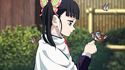 After Tanjirou’s obnoxious request to take out Sanemi with a few headbutts was dismissed by not-so-aloof-in-the-end Muichiro, he’s carried to the mansion where he meets Tsuyuri Kanao (Ueda Reina). She’s revealed to be Shinobu’s pupil, her Tsuguko. She’s next in line to become the insect pillar, taking over Shinobu’s position. She must have shown a great deal of strength and potential to have been chosen as her Tsuguko. I wonder what events led to their paths (Shinobu’s and hers) crossing. But why is Tsuyuri being introduced as Shinobu’s possible heir? Should I be concerned here?