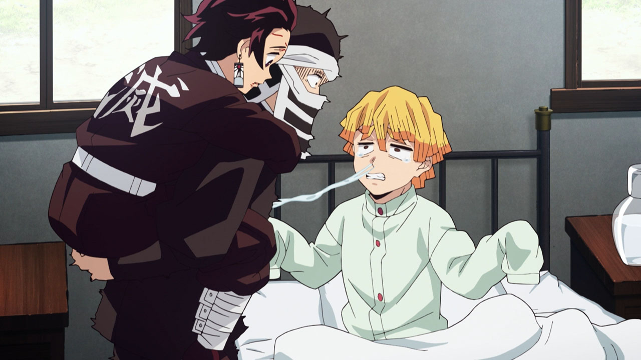 Moving on, Tanjirou reunites with a shrunken Zenitsu and a very emotionally, mentally, and physically damaged Inosuke in the infirmary of the mansion. Even with all the pain he’s going through, you can tell he’s relieved, even happy to be by their sides again. It’ll take a long time for them to recuperate their energy but it looks like the next episode might jump forward in time because it’ll be about their first training with the Hashiras.