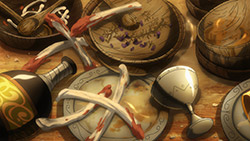 Theoretically the advantage Askeladd has is that he’s not burdened by a belief system the way Canute and his party are. But if Askeladd is doing all this in pursuit of a political end, that may be just as much of an anchor around his neck. When we see Canute’s priest question the love of his God, we see real anger in Canute for the first time. And it’s clear why that is – for him, the Father is a personal necessity. Because his own father doesn’t love him and he knows it, the love of his Father in Heaven is something Canute must believe in to keep himself moving forward. And meanwhile all this makes Thorfinn think of his own father, whose voice still echoes inside his head and fills him with misgivings about the life he’s chosen to lead.