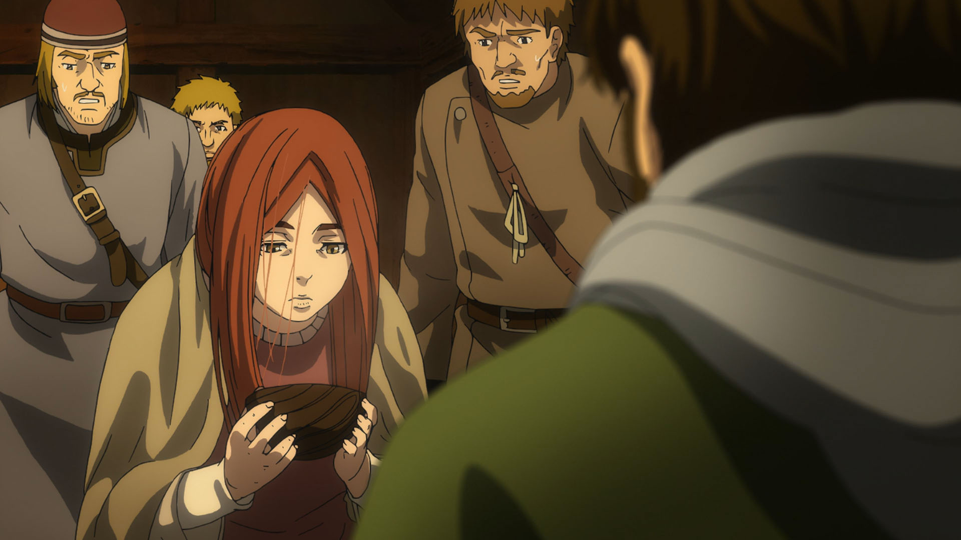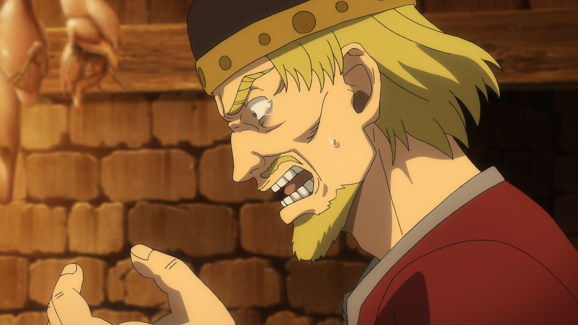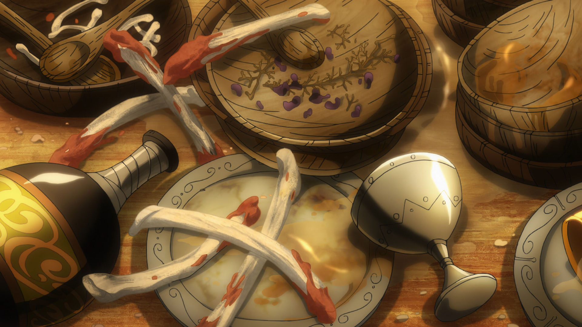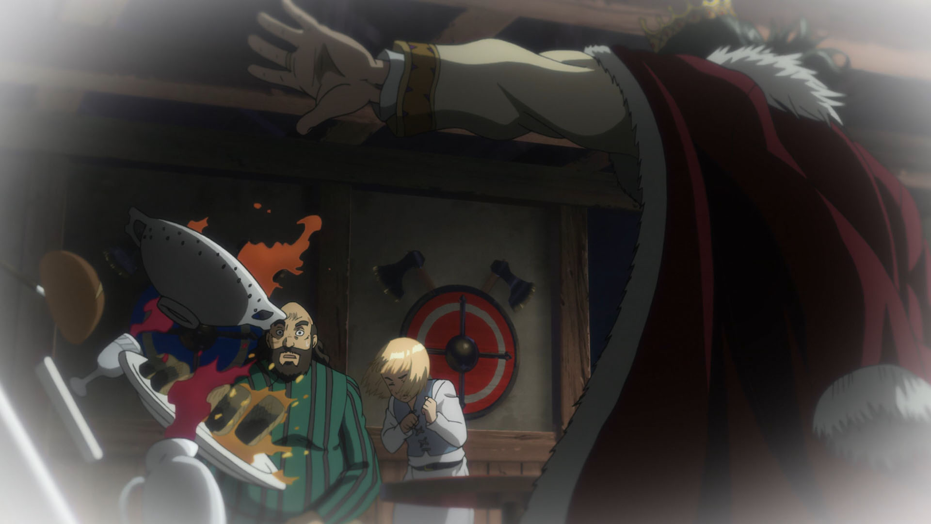 Had to find the manga equivalent (Vol. 5, Ch. 30 – “Master And Servant’s Dining Table”) and it turns out… No metal tray in that version, just a panel where King Sweyn rejects Canute’s cooking. (The other one was a panel of the meal Canute serves to Thorfinn, which was given a panning shot in this episode.)