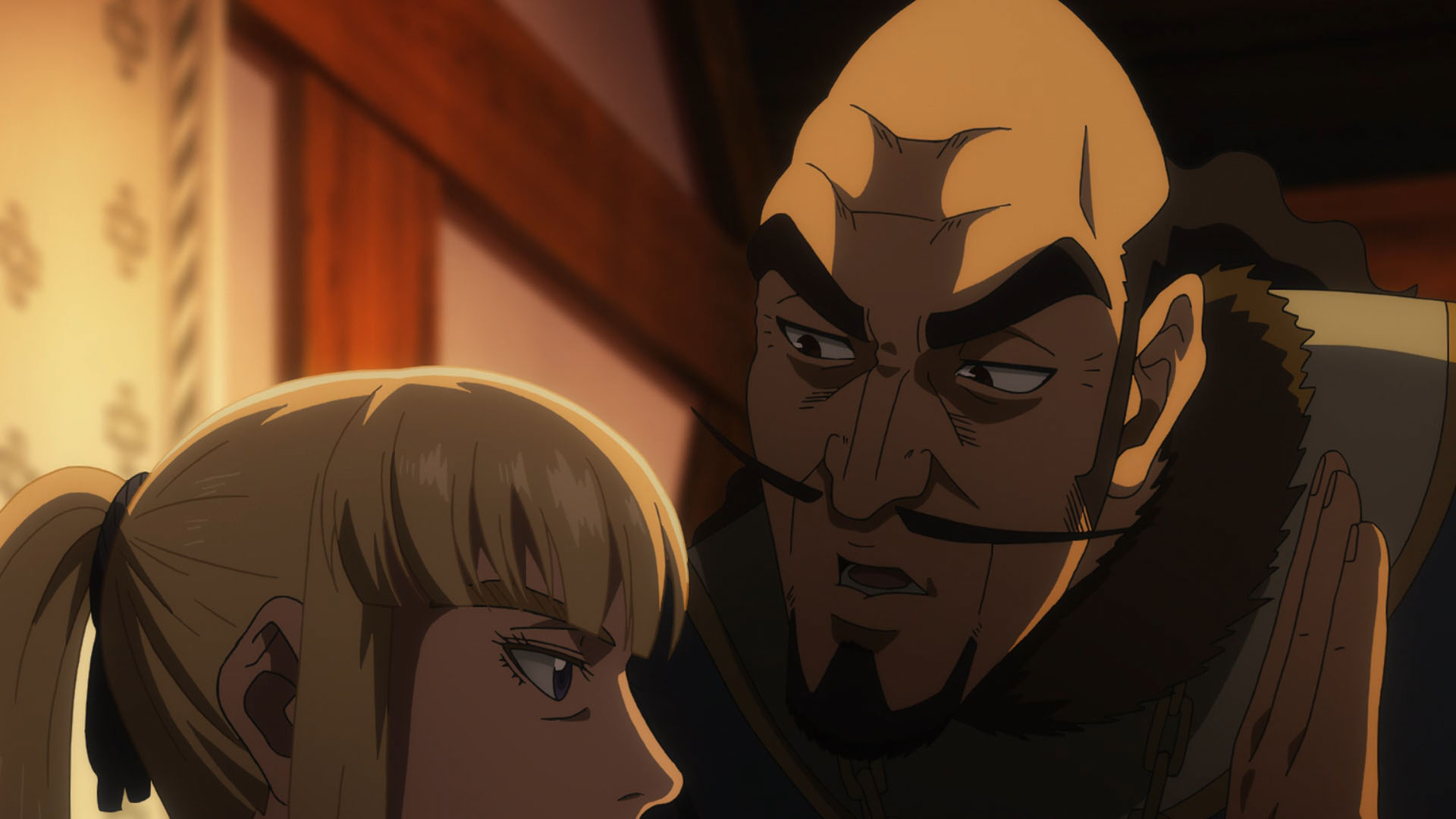 The more I notice King Sweyn, the more I can’t help but point out how physically decrepit he looks (reminiscent of Immortan Joe from Mad Max: Fury Road). Despite this, Sweyn still gives off that Tywin Lannister vibe–that of an all-around magnificent bastard who has managed to hold on to all that power (and wealth). And he’s also the one character that can put Askeladd on edge. Luckily, Prince Canute is quickly learning the finer points of magnificent bastardry from Askeladd (sending Thorkell and his men to drink with the local garrison to keep them distracted from Canute’s meeting with Sweyn + win them over to Canute’s side) as well as drawing from his own experiences within the intrigue-filled royal court of his father.