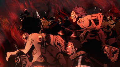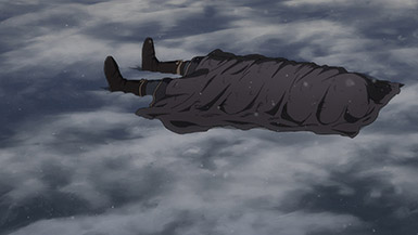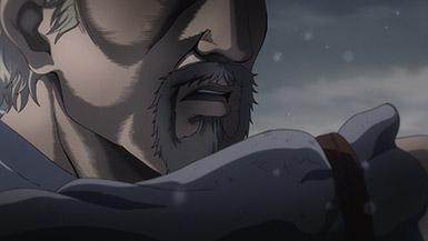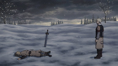 It was clear from the final moments of last week’s episode (uncharacteristically recycled in the cold open here) that Askeladd was approaching this duel with Thorfinn in a much different manner than his usual. I feel as if there are times when something happens to remind Askeladd how miserable he truly is and this sets him into a funk, and the death of Bjorn at his hand is certainly one such event. While I don’t doubt that there was a part of him that mourned Bjorn and even considered him almost a friend, I think what was really bothering Askeladd here that Bjorn – a member of the race of brutes he so contemptuously looks down on – was capable of such powerful feelings for him, and he was unable to reciprocate. The episode title was “Lone Wolf”, and it could hardly fit Askeladd any better.