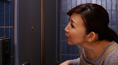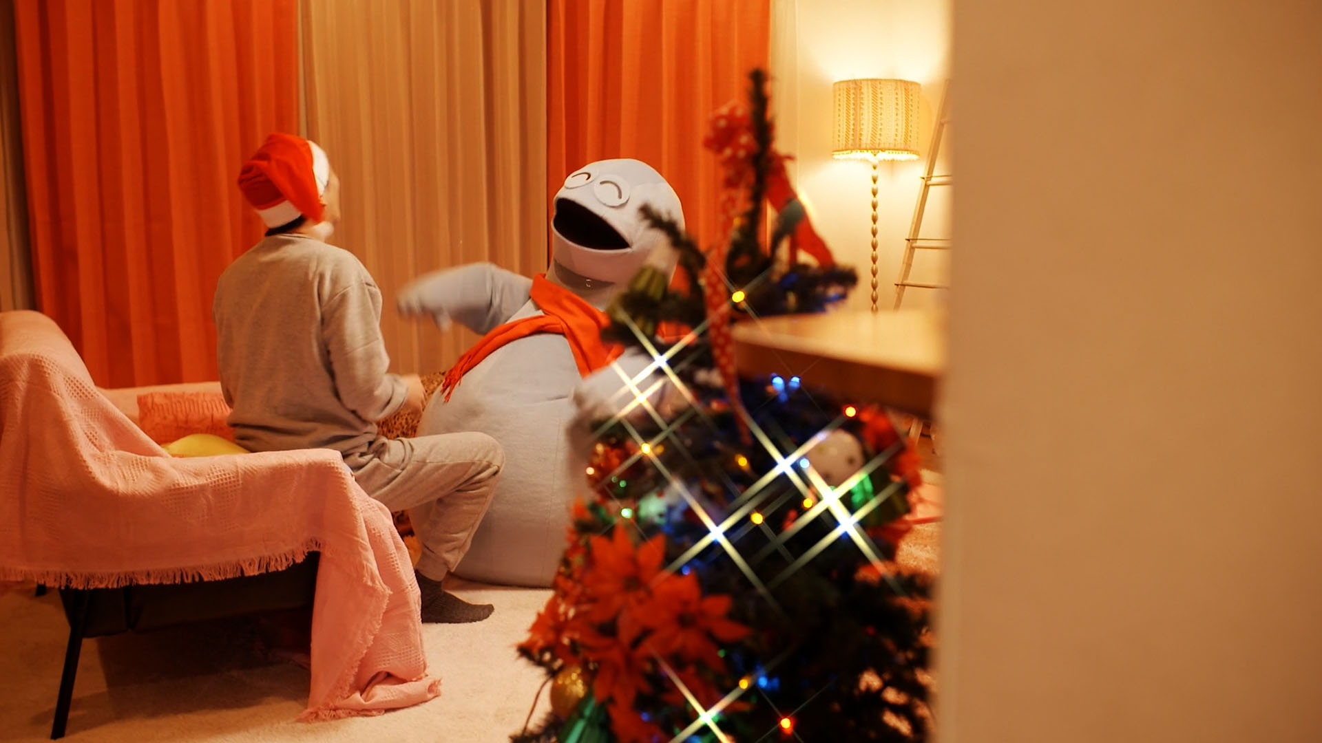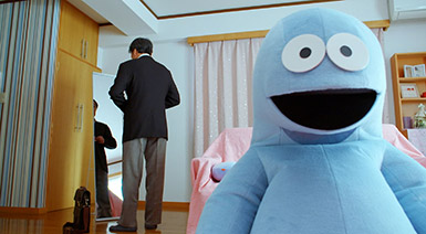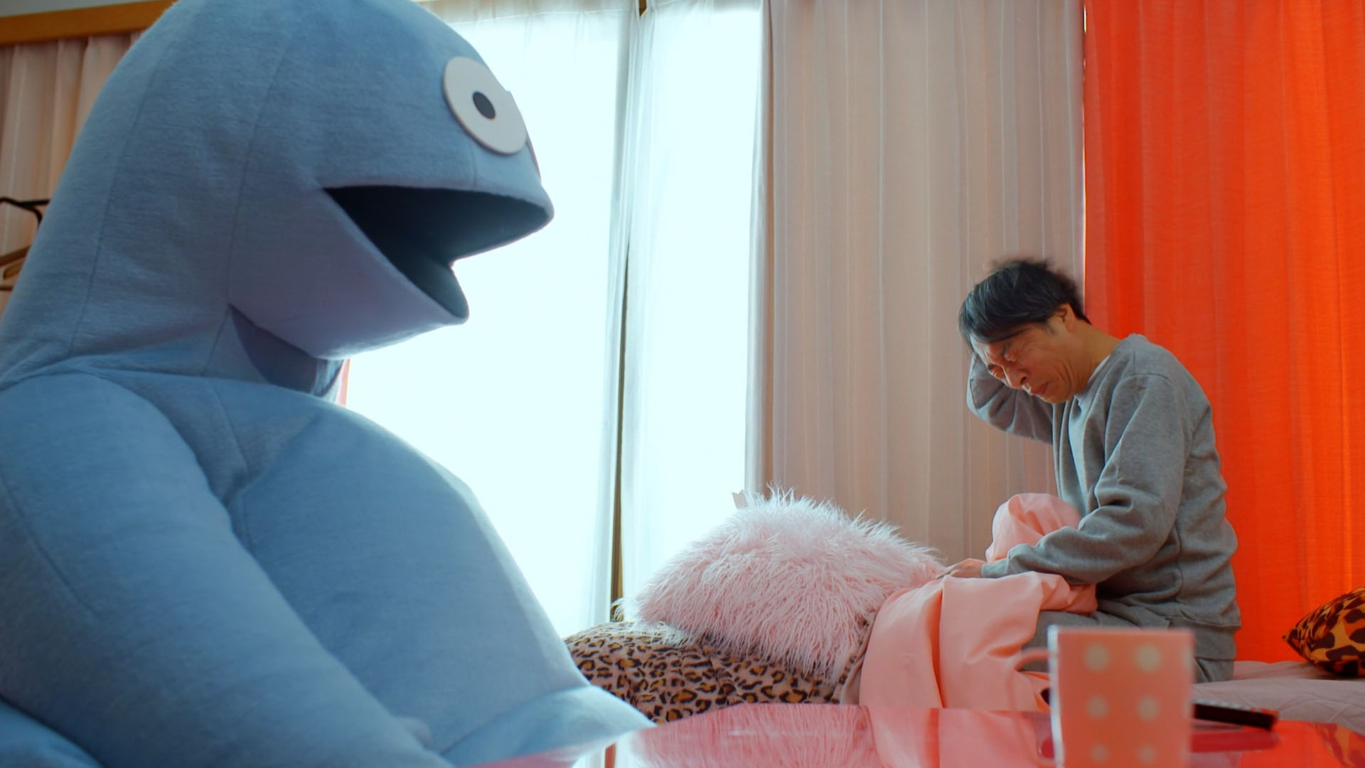 So the neighbor isn’t surprised by the blue creature in the apartment considering