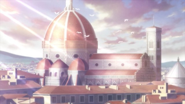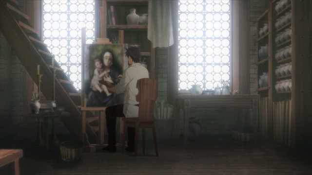 For all that, though, I must say I didn’t find this first episode especially convincing. The best way I can describe it is to say that rather than as a seinen, it played like an above-average light novel. Everything was executed rather broadly, and rather than Florence in the Renaissance I felt like I was watching 21st century anime characters stuck in a Renaissance setting. And while the look of the series was fine (art director Scott MacDonald is one of the most accomplished gaikokujin in the anime industry), somehow it didn’t pop the way you’d want a show about Renaissance Florence to (the way Paris popped in Ikoku Meiro no Croisee, for example).). The look was generically anime in much the same way that the tone was.