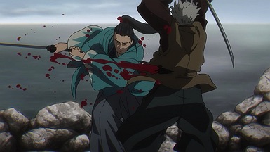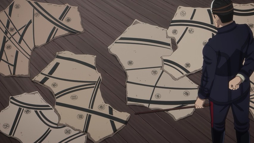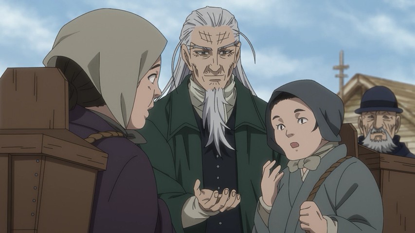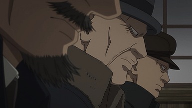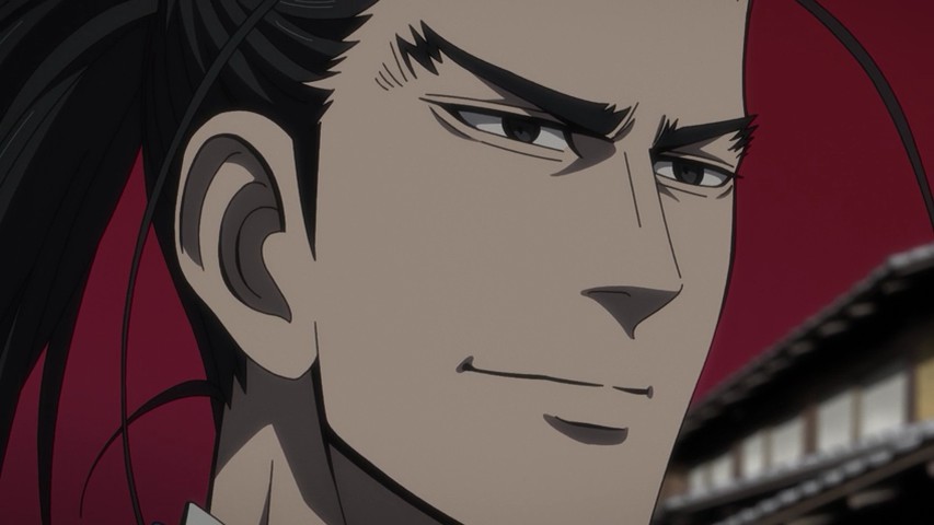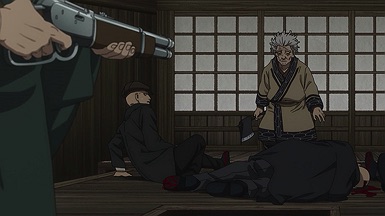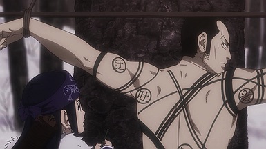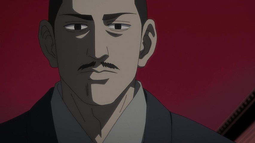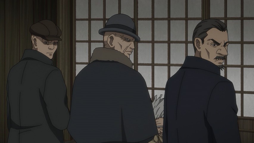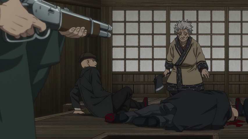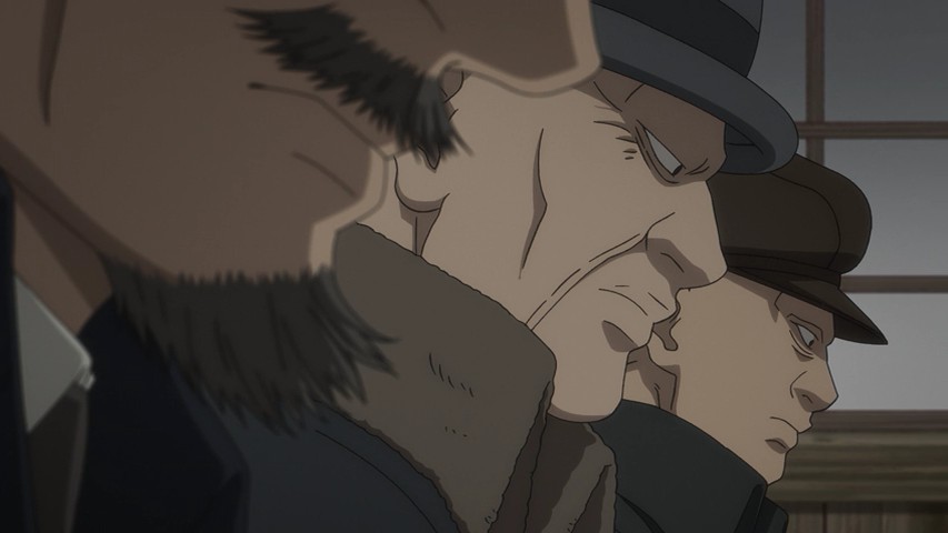 Youichirou is nominally of interest to Hijikata and his group because he bears one of the Wilk’s tattoos. But these two have a history – a deep and intense one, as Youichirou was a manslayer in the service of the Imperial loyalists (the Shinsengumi’s sworn enemies). It’s not only Hijikata who’s interested – two separate groups of revenge-seekers are after him too, having hired guards from Abashiri to accompany them and identify Youichirou at the end of the trail. It’s a bit of a credulity stretch that they should all arrive at the same time, but that’s a tiny quibble – and you can’t deny it makes for great drama.