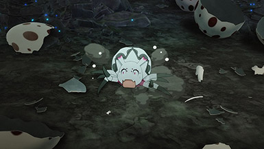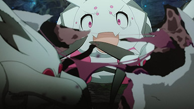 I have to give the show credit for starting right out the gate with the grisly reality that Kumoko faces right when she’s reborn as a spider. As Kumoko makes the realization of what she’s become, the tone is set immediately when she notices her fellow spiders eating each other out of necessity. Even with Kumoko scuttling about and cracking jokes to the viewers, the grim “kill-or-be-killed” atmosphere never dissipates.