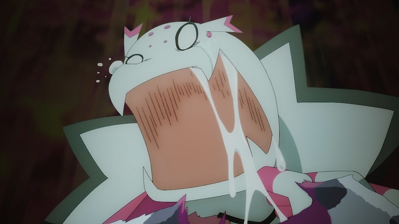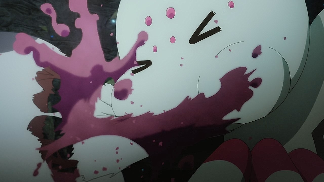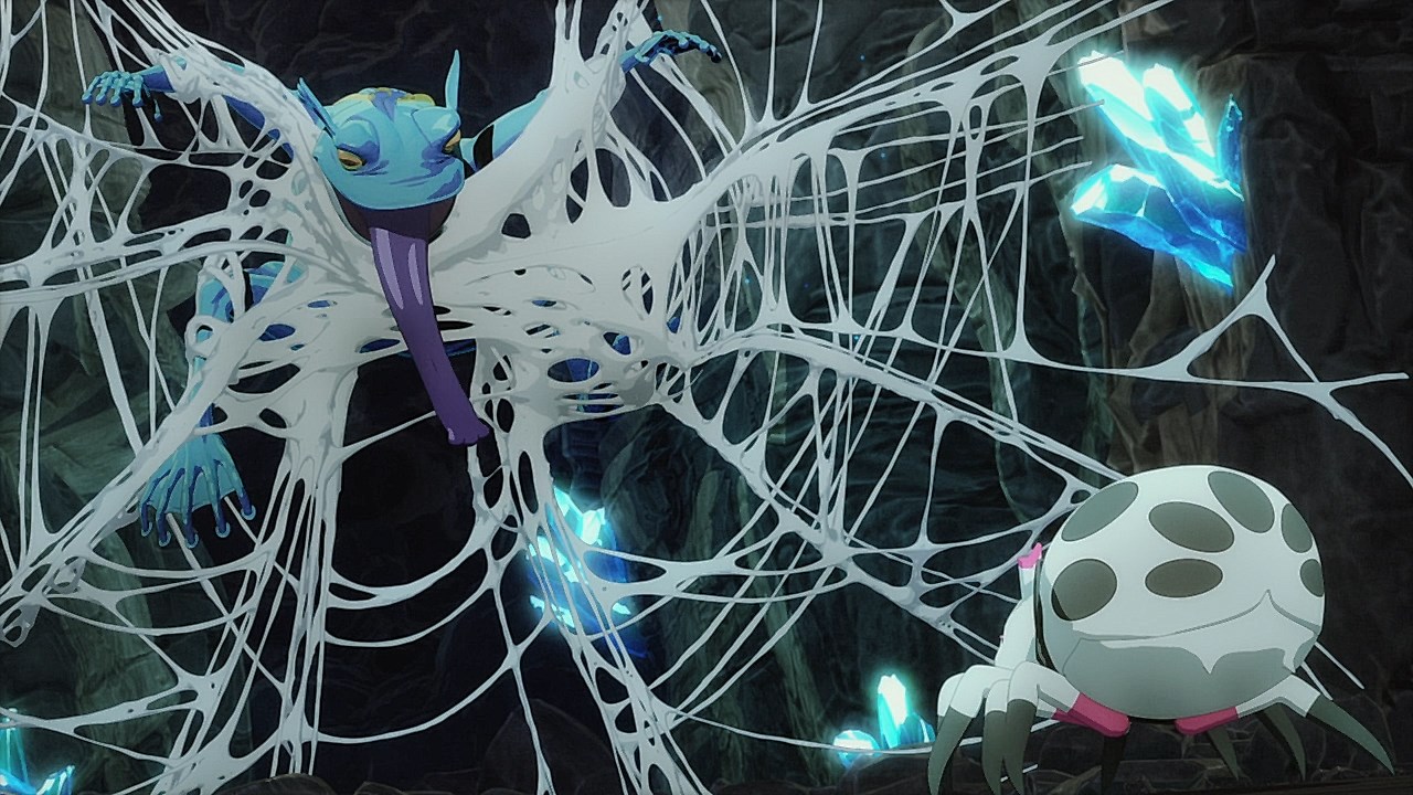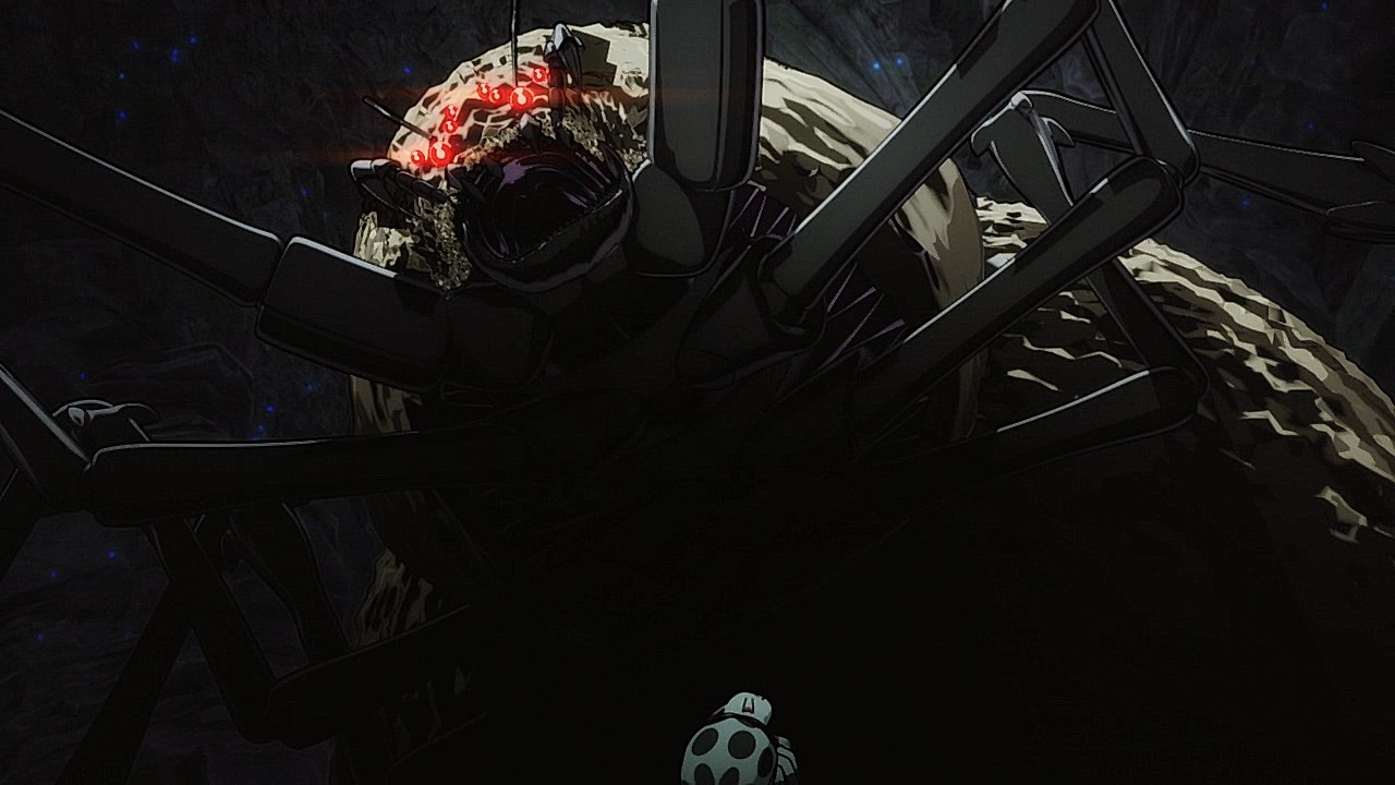 In fact, for the remainder of the episode, Kumoko remains stuck in this dank cave surrounded by monsters that she will either have to avoid or devour in order to survive. The morbid vibe provides much of the show’s tension with how harrowing it is to see Kumoko force herself to stop puking as she eats a fellow spider or chews through a poison frog until it gasps its last dying breath. It makes it interesting to see an isekai like this where the stakes are high enough that the looming threat of death is taken seriously, and survival instincts are what it takes to progress instead of just skill or talent.