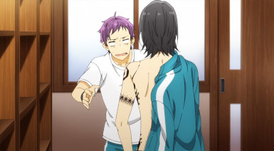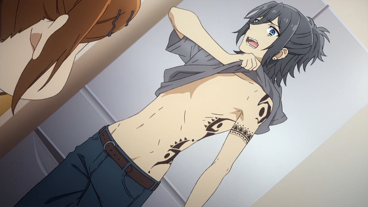 Make no mistake, this “two faces” element is very crucial thematically in Horimiya. As Hori-san notes, everyone has a “secret side of themselves they don’t want anyone to know about”. It’s more obvious in Miyamura’s case (he has major ink in addition to 9 piercings) but no less true for her, since the frumpy surrogate mom she plays at home is as far removed from her image as the rebel is from his. Circumstances (and Souta) conspire to force these two to reveal their secret sides to each other, and she quickly realizes that this is a subtly powerful form of intimacy, whether she asked for it or not.
