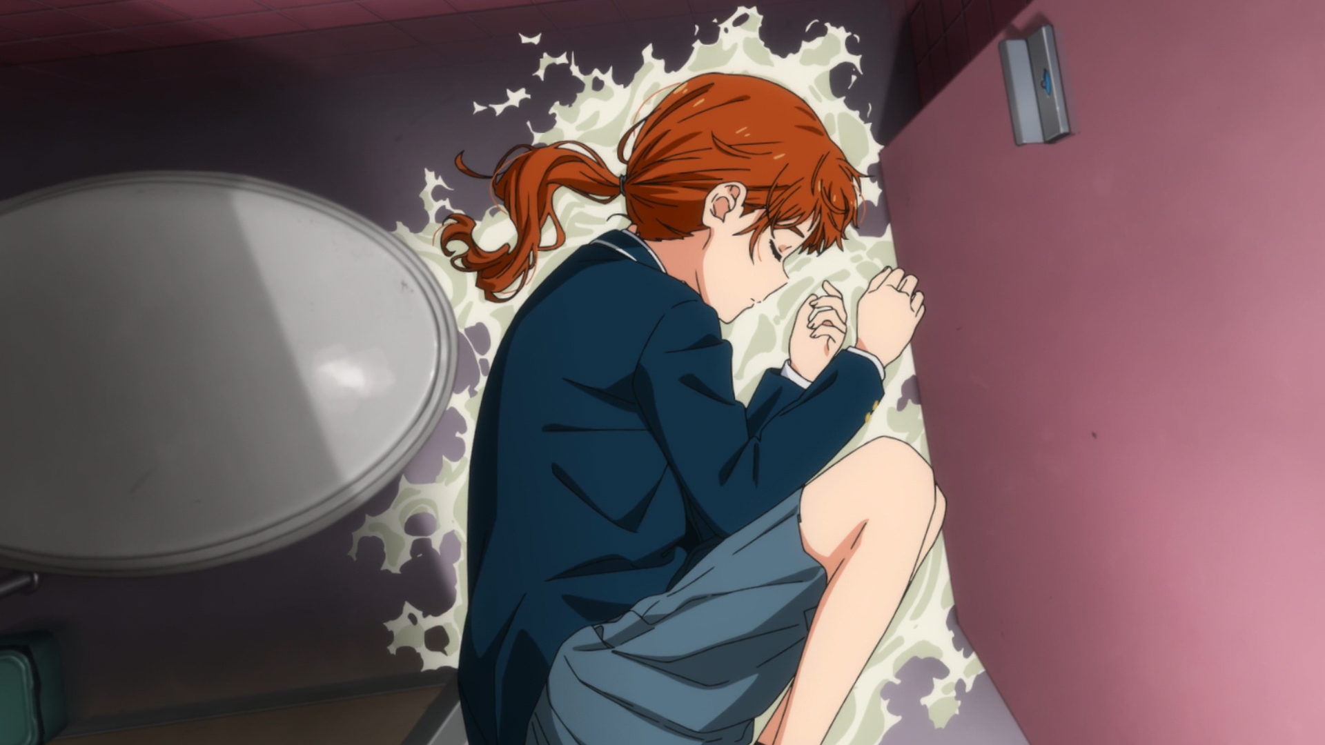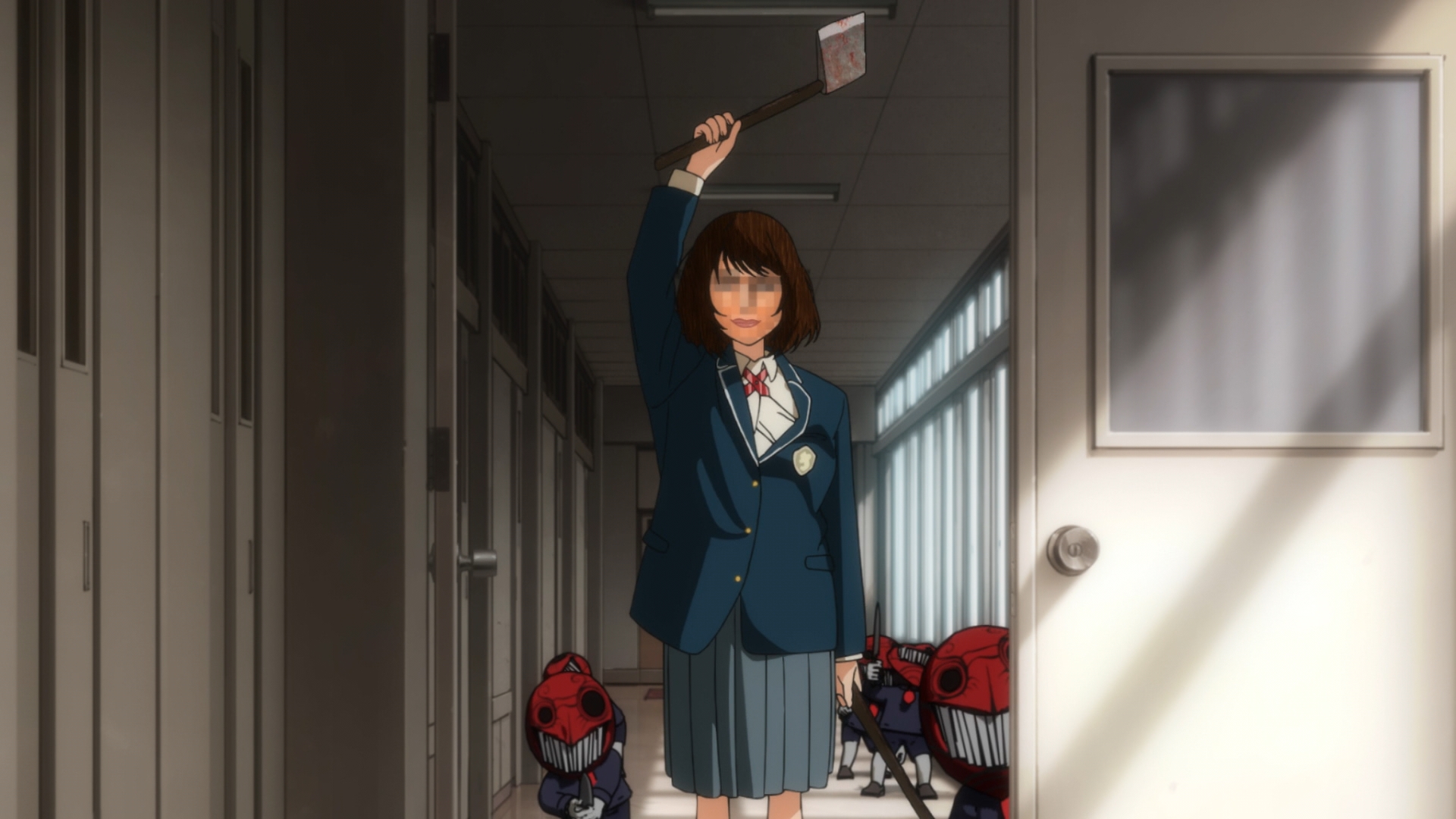 From what I can tell, Ooto Ai is a hikkikomori for two reasons. She’s bullied for her heterochromia (which looks really beautiful) and she harbors guilt over her friend’s implied suicide. Regarding her experiences, where the wounds she suffers end up re-appearing in the real world, just how much of that was imagination? And how much of that was reality? If that was reality, then we can deduce that there’s a supernatural aspect involved. Something tells me that the eggs are containers for ‘lost souls’ (proverbially speaking) that have attempted suicide. At the insistence of some angry toilet paper, Ai forcefully smashes the egg into the ground. And it hatches into a girl named Kurumi, who is being pursued by these strange little creatures who seem intent on murdering her. When Ai decides to make her stand and defeat their boss, order is restored to the world and she wakes up as it fades away.