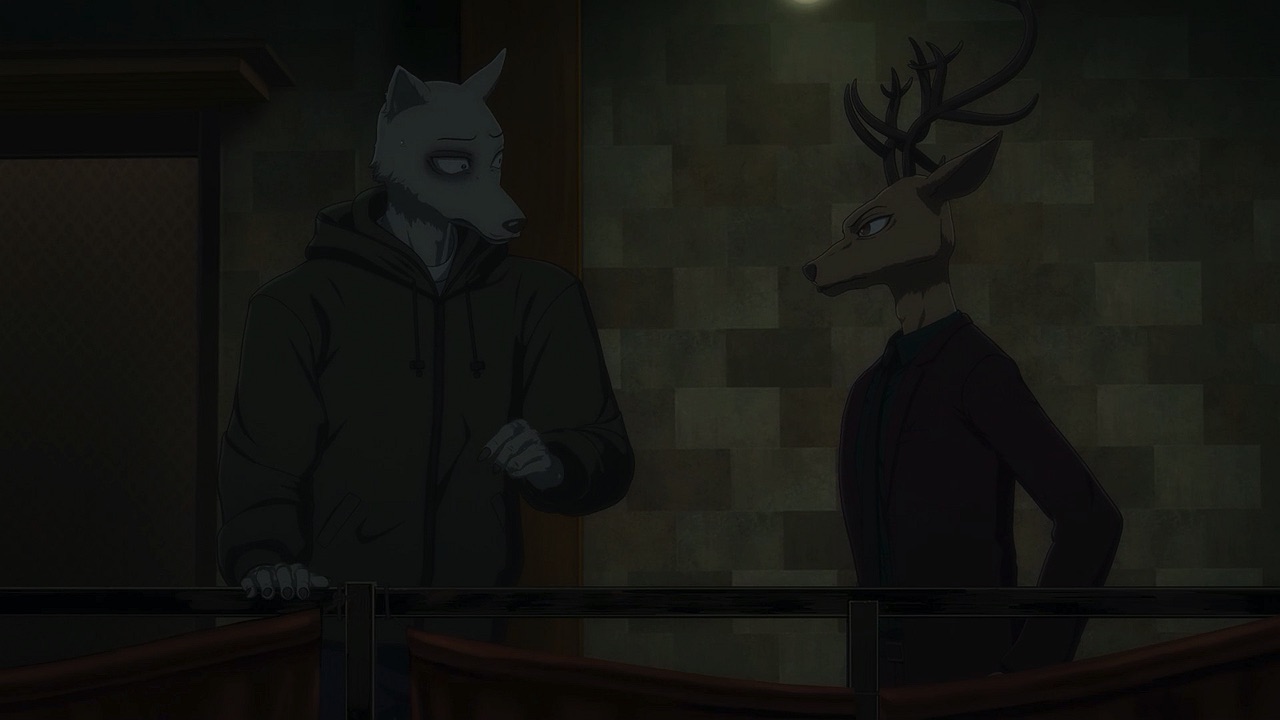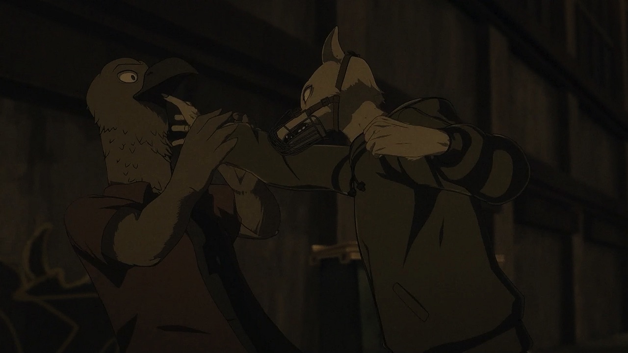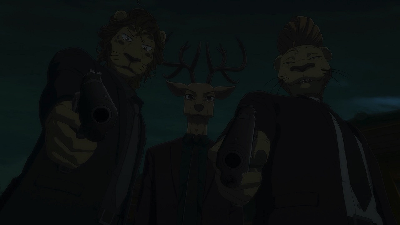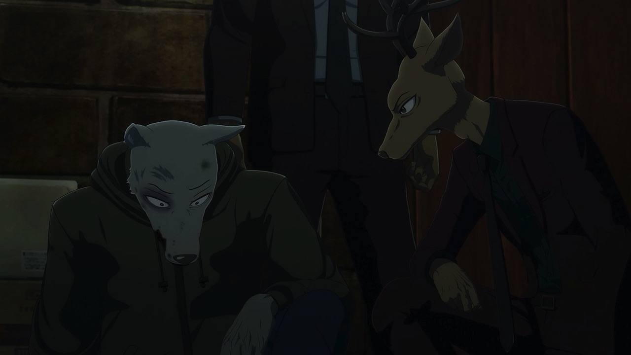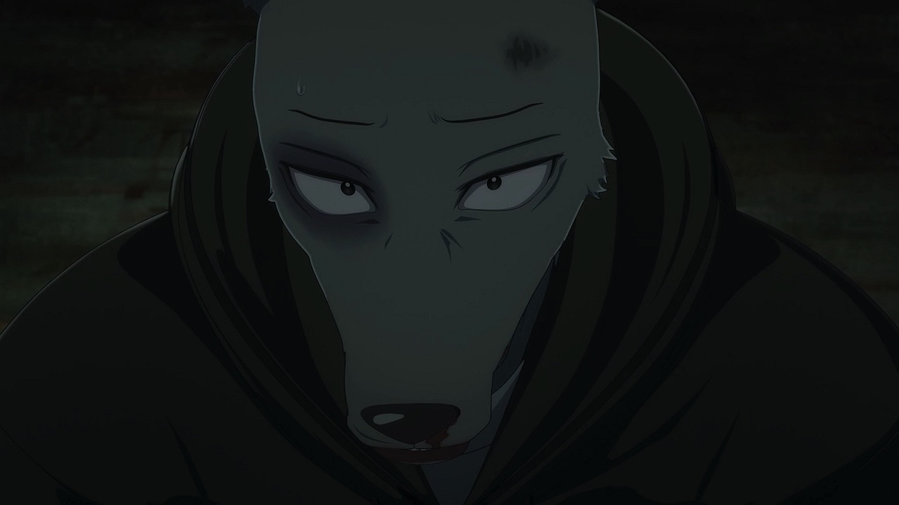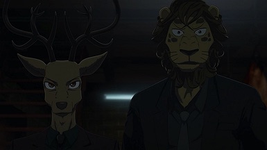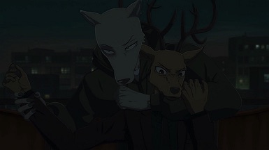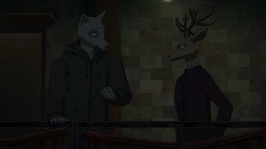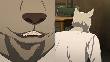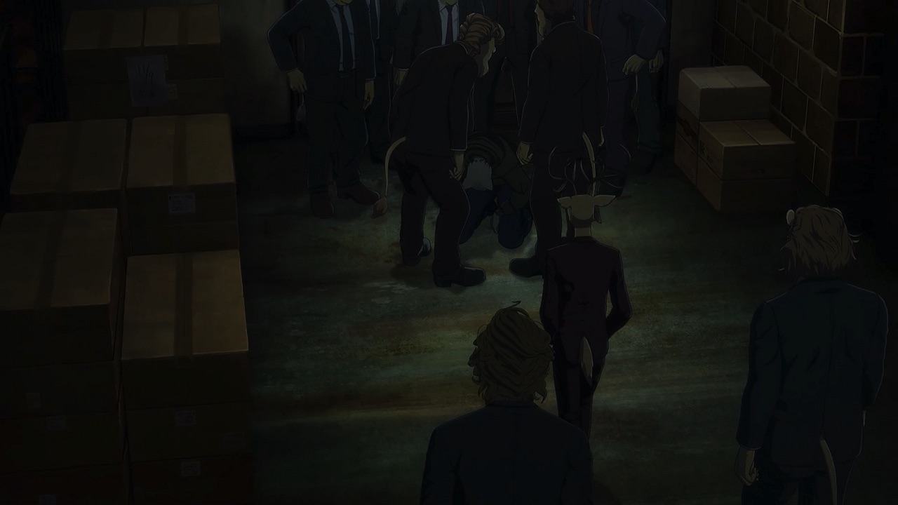 The reunion between Legosi and Louis, long in coming, certainly starts out in rough fashion. Wrongly suspected of being the one stealing the gang’s illegal ivory, Legosi gets roughed up by the pride as Louis looks on, shocked but keeping his poker face. Legosi is smart enough not to blow Louis’ cover, but he can’t keep his tail from wagging even as he’s getting his ass kicked, he’s so thrilled to see Louis-sempai. Whether Louis is deserving of the adoration Legosi holds for him is debatable, but it’s so authentically Legosi. He’s an incredibly pure soul, utterly genuine, and that someone like him can exist in this series’ universe somehow gives you a sense of hope for its world as a whole.
