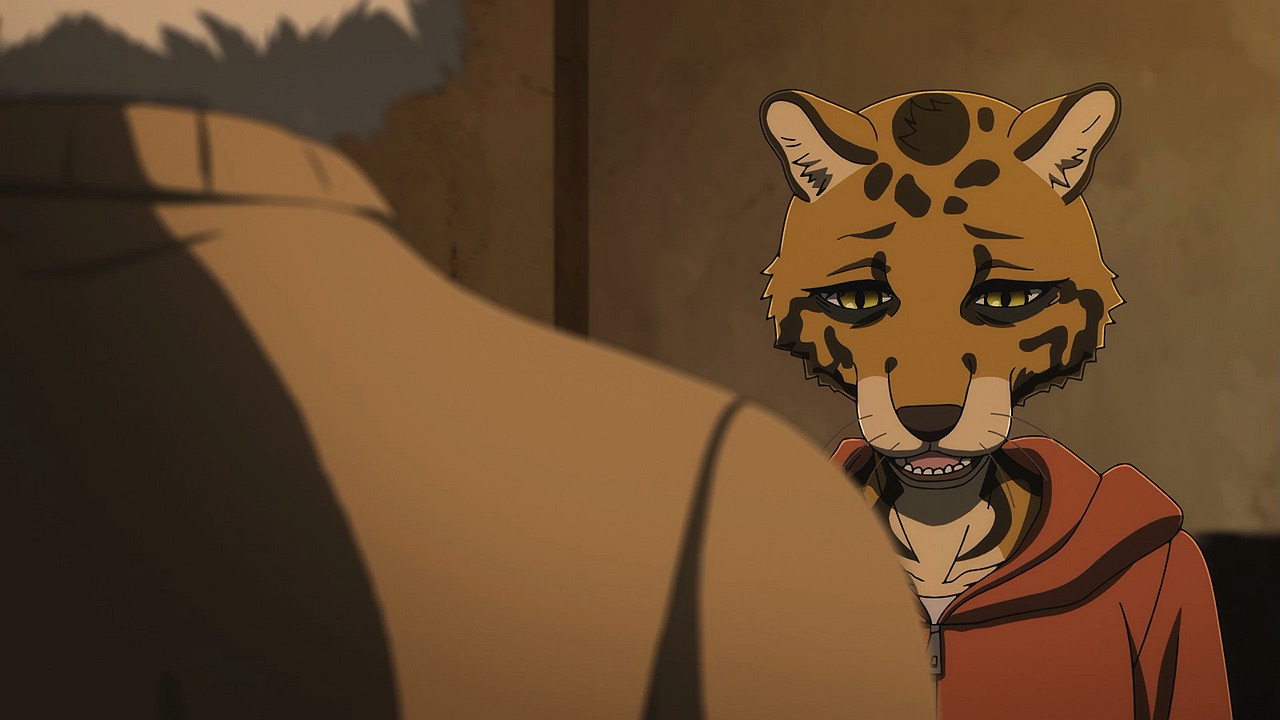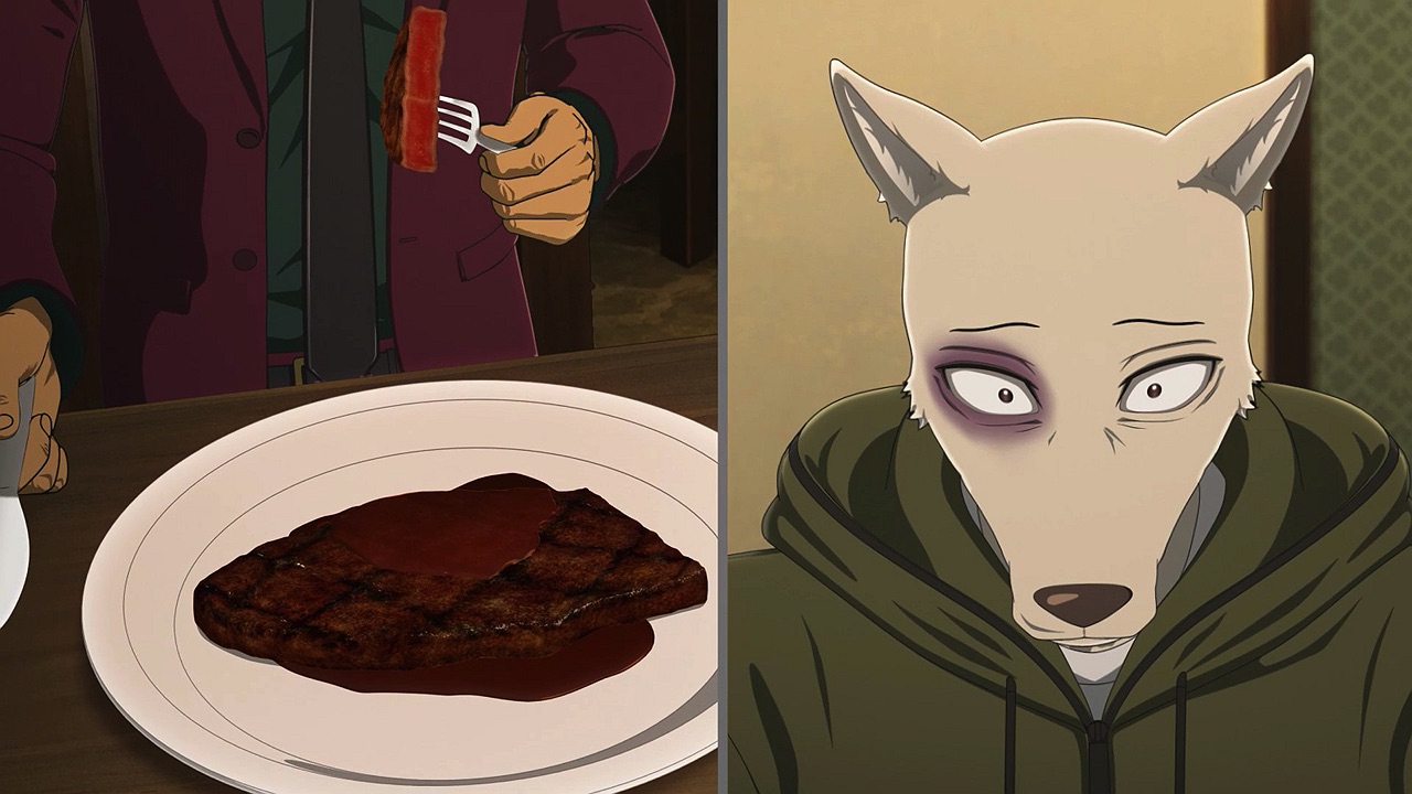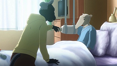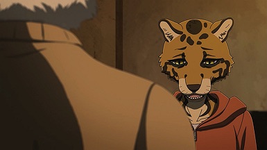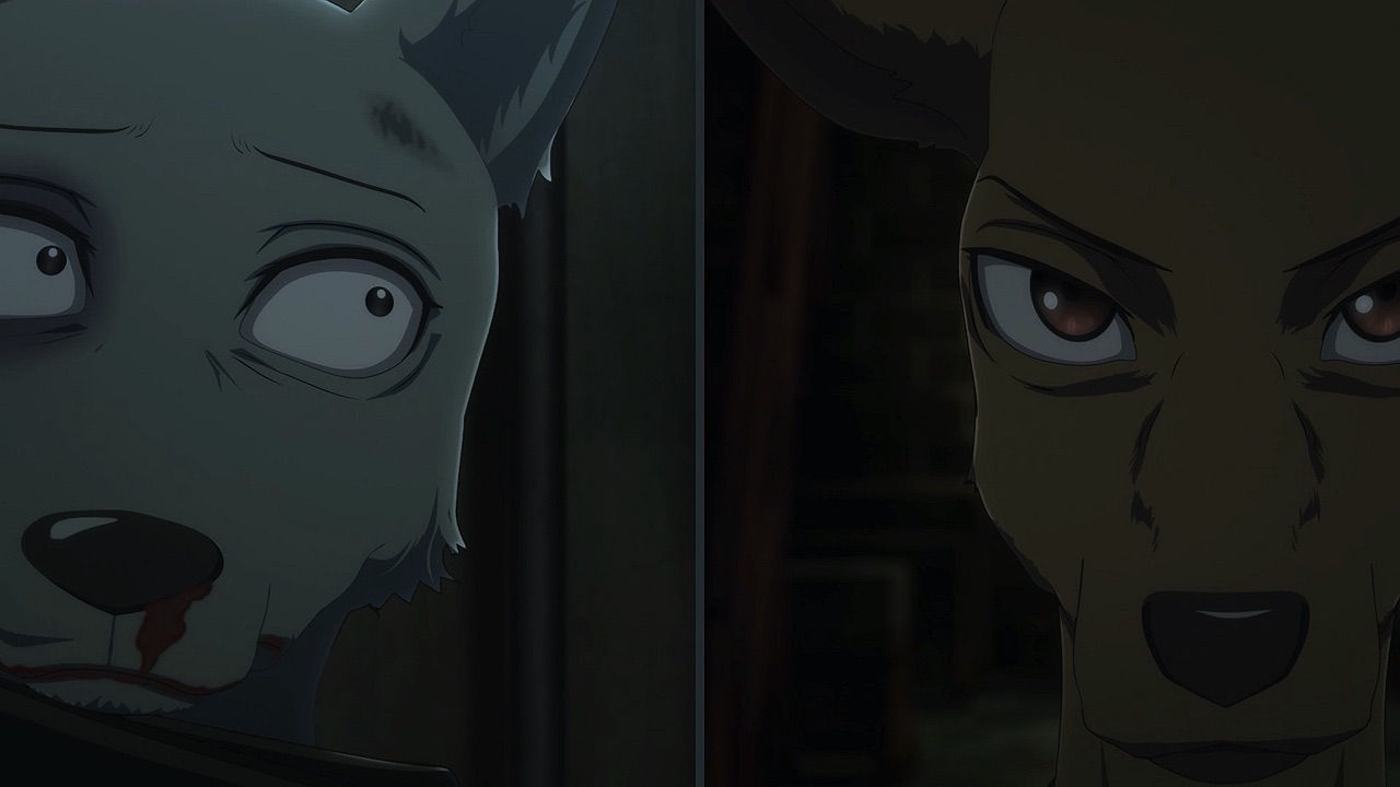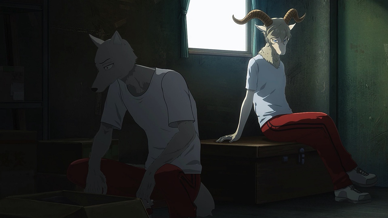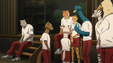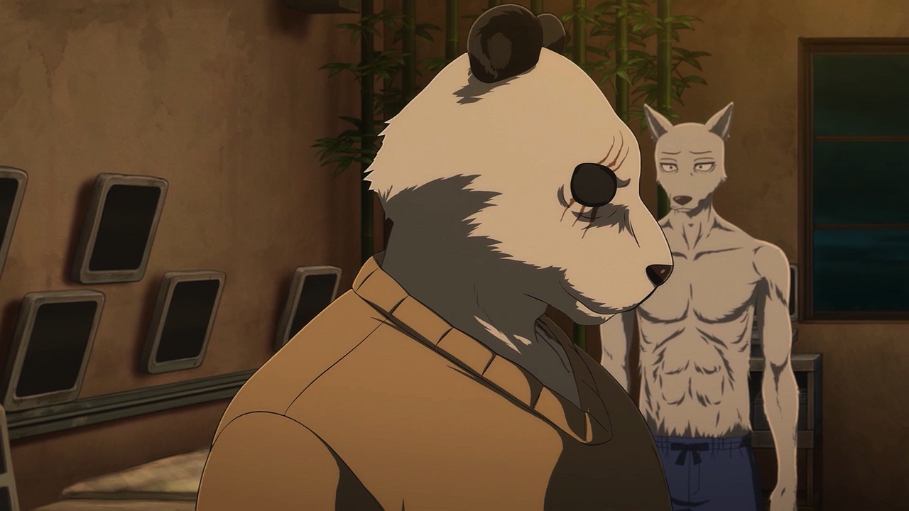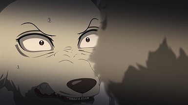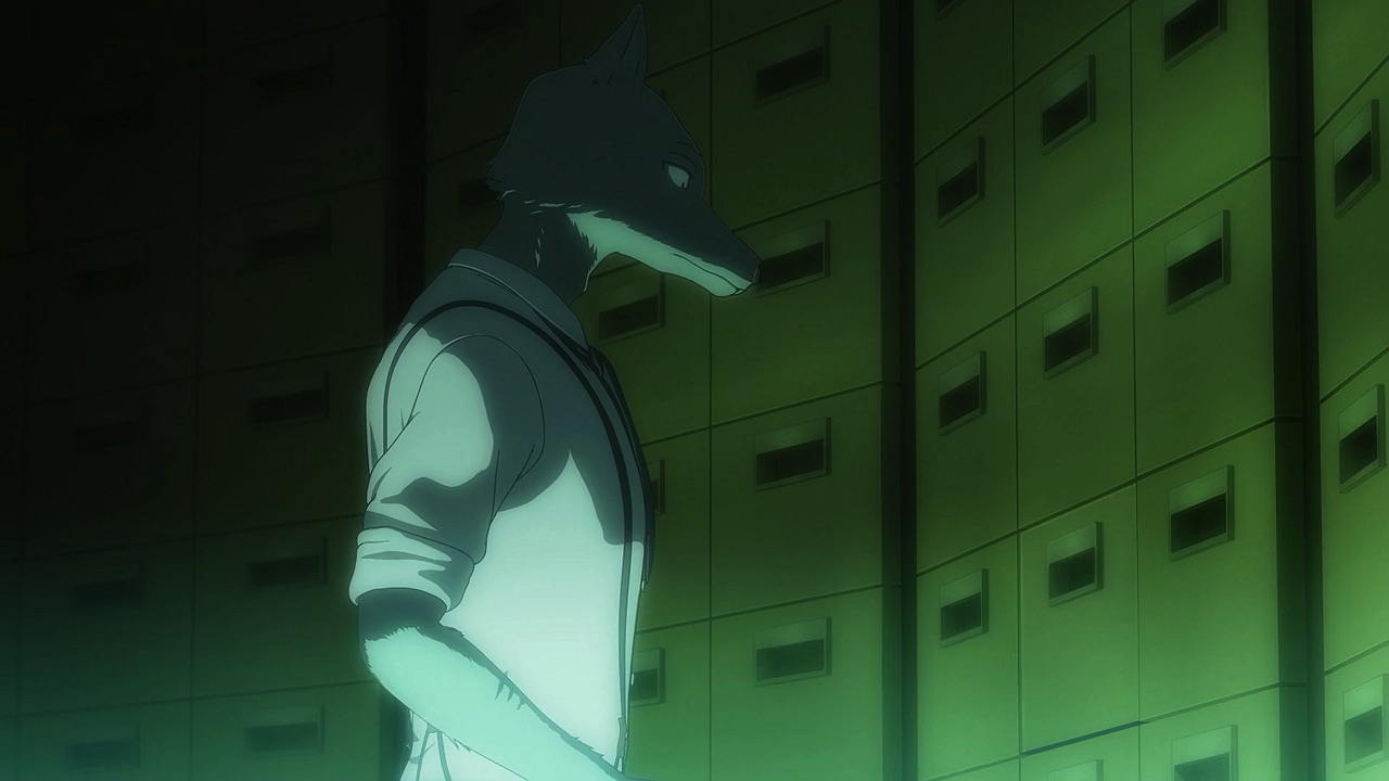 The reunion between Legosi and Louis, long in coming, certainly starts out in rough fashion. Wrongly suspected of being the one stealing the gang’s illegal ivory, Legosi gets roughed up by the pride as Louis looks on, shocked but keeping his poker face. Legosi is smart enough not to blow Louis’ cover, but he can’t keep his tail from wagging even as he’s getting his ass kicked, he’s so thrilled to see Louis-sempai. Whether Louis is deserving of the adoration Legosi holds for him is debatable, but it’s so authentically Legosi. He’s an incredibly pure soul, utterly genuine, and that someone like him can exist in this series’ universe somehow gives you a sense of hope for its world as a whole.