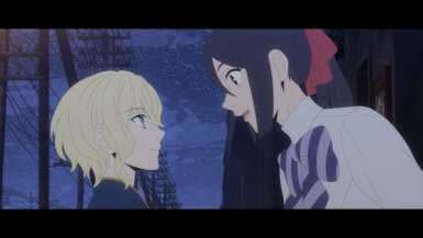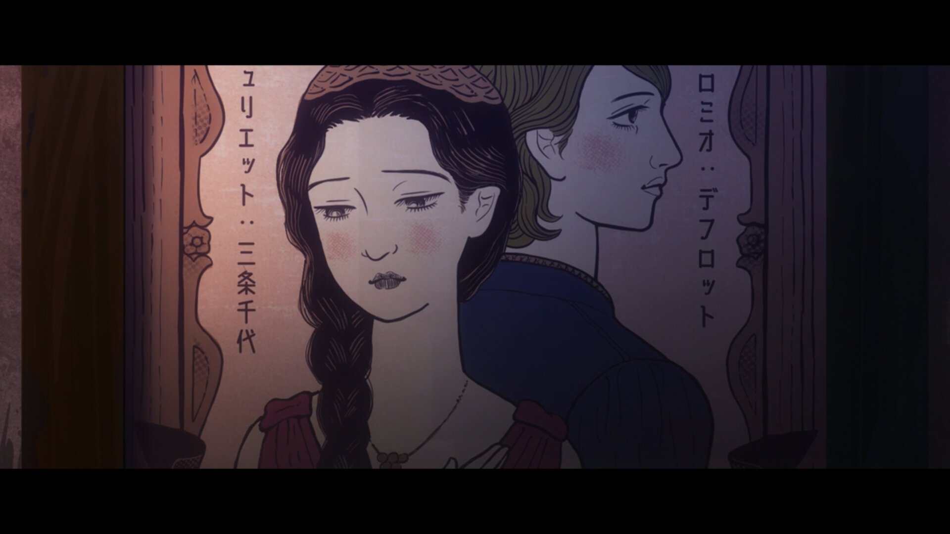 Tragic love ran throughout this episode like the red thread of fate, red with the blood so precious to these vampires and so tragic to the ones who lost it. After the loss of the actress at the playhouse, Salome is replaced with Romeo and Juliet, foreshadowing the elements of ill-fated love. Aoi Shirase (her last name could be a play on the Japanese word shirase, which means news or notification), is determined to get the scoop on the rumored “elopement” of this actress.