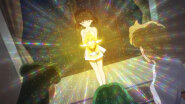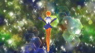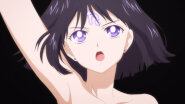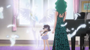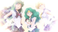 The theme of family and growing up is continued with Haruka (Minagawa Junko), Michiru (Ohara Sayaka), and third wheel Setsuna (Maeda Ai) raising Hotaru (Fujii Yukiyo). The family dynamic with Haruka worrying about diapers and milk and Michiru dressing Hotaru was adorable, though short-lived. Many parents and grandparents talk about kids growing up too quickly, but Hotaru took that to the extreme, growing rapidly within a short time of the eclipse. Hotaru is able to return the care she received from her outer senshi parents when she gives them their new power ups.