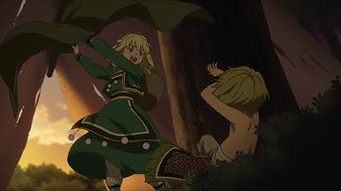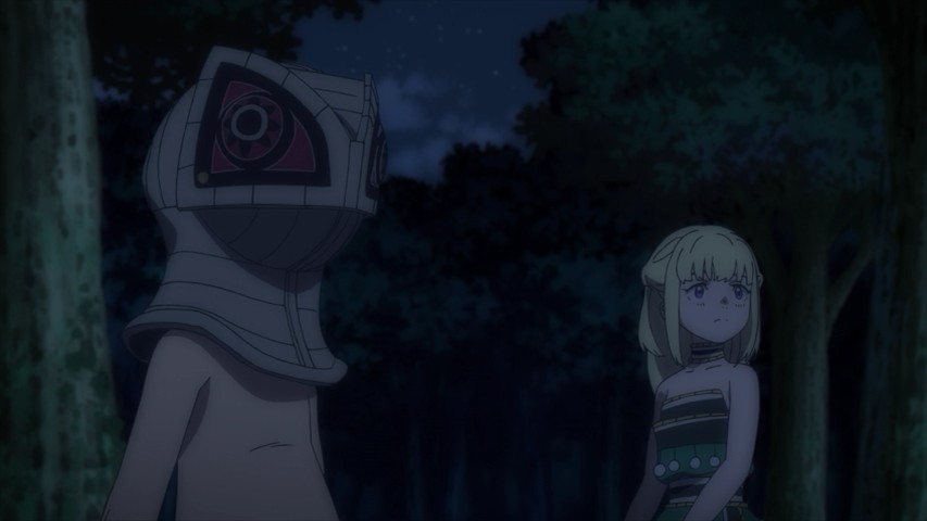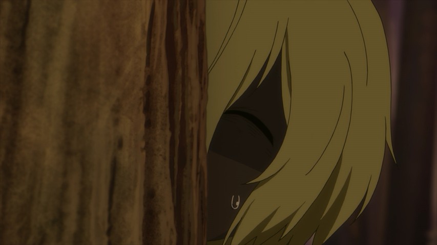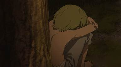 People – certainly children – can only know their own experiences. And Gugu is a special child, able to grasp that idea and move past his anger. Declaring that he’s “lost interest in my own circumstances” he agrees to bring Rean “home” – in effect, to be her protector. On the way to find Fushi they’re accosted by one of her father’s searchers, who Gugu liberates Rean from. And after they reunite with Fushi (and the mask) they run into one of Rean’s maids in the woods. Fushi is dispatched to sideline her – he shows great emotional intelligence in how he decides to do it – while Gugu dashes for the house with Rean in-hand.
