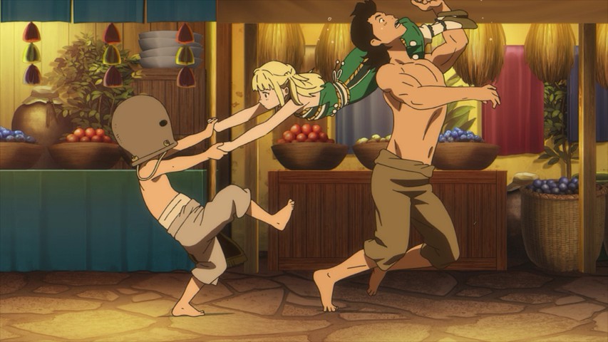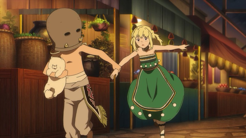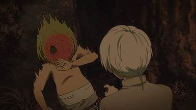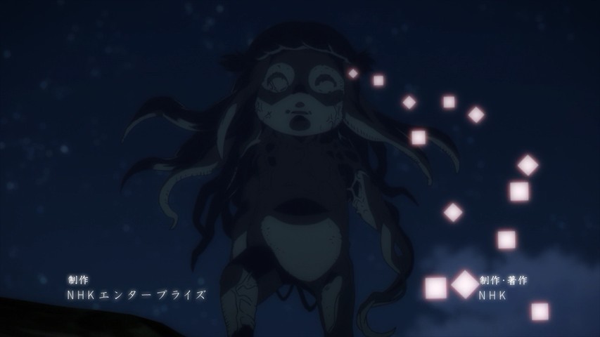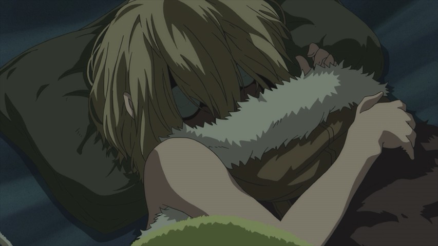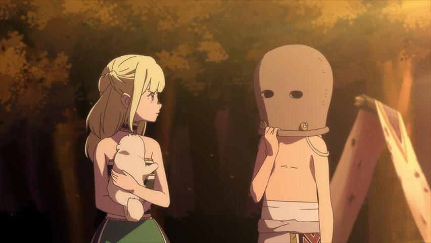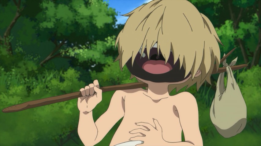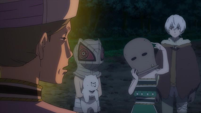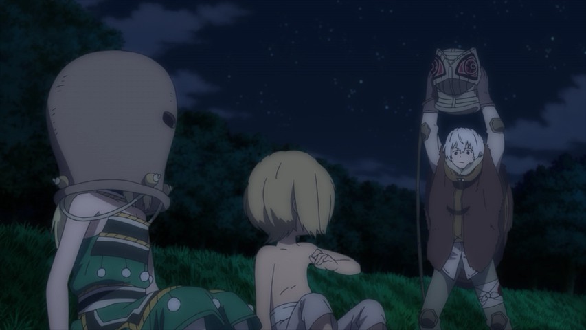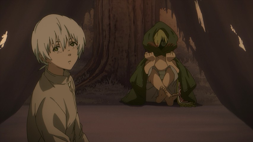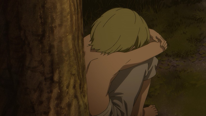The arrival of Meer shakes things up substantially. Meer has a habit of running away (he clearly takes after his mistress in that sense), and Rean eventually shows up on his heels. There’s a profoundly effective bit of misdirection right before she does, but her arrival causes great alarm for the maskless Gugu, who’s still in love with her after all. Rean tells him that the Booze Man has said he’s sorry and agreed to remove what he implanted in Gugu’s belly, but the boy is determined not to go back. Eventually Fushi darts off to find Gugu’s discarded mask, on the grounds that its return will change his mind about returning to the old man’s house.