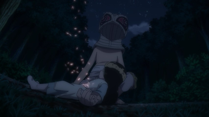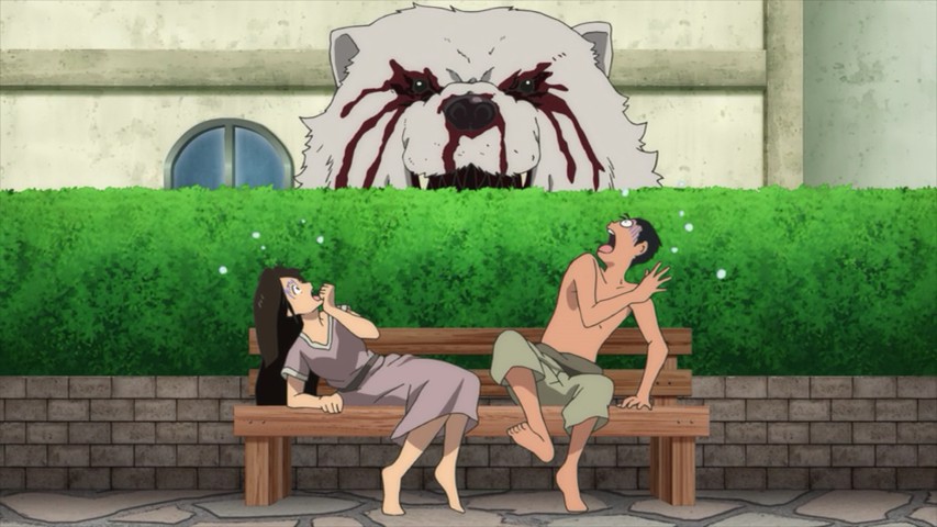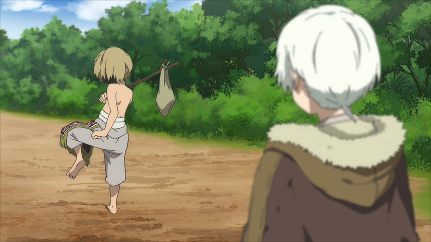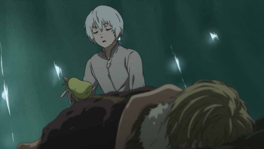 But the best-laid plans are waylaid by another visit from the mysterious enemy who attacked Fushi in the woods during his travels with Pioran. Fushi has already saved Gugu once, so there’s obviously zero chance Gugu will leave Fushi to fight this battle alone. Gugu has reserves of strength and courage far beyond his years, but this is an opponent far beyond his capacity to comprehend. It’s just that when it comes to standing by his little brother, Gugu is the exact opposite of Shin, and no circumstances can change that about him.