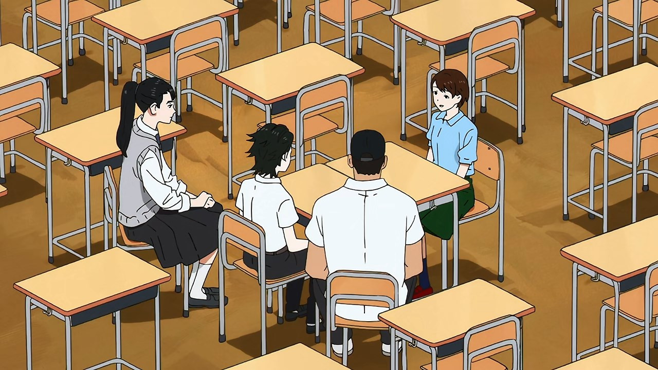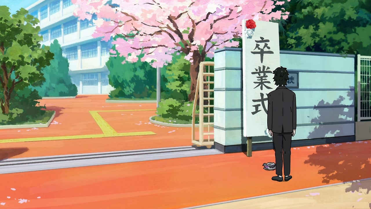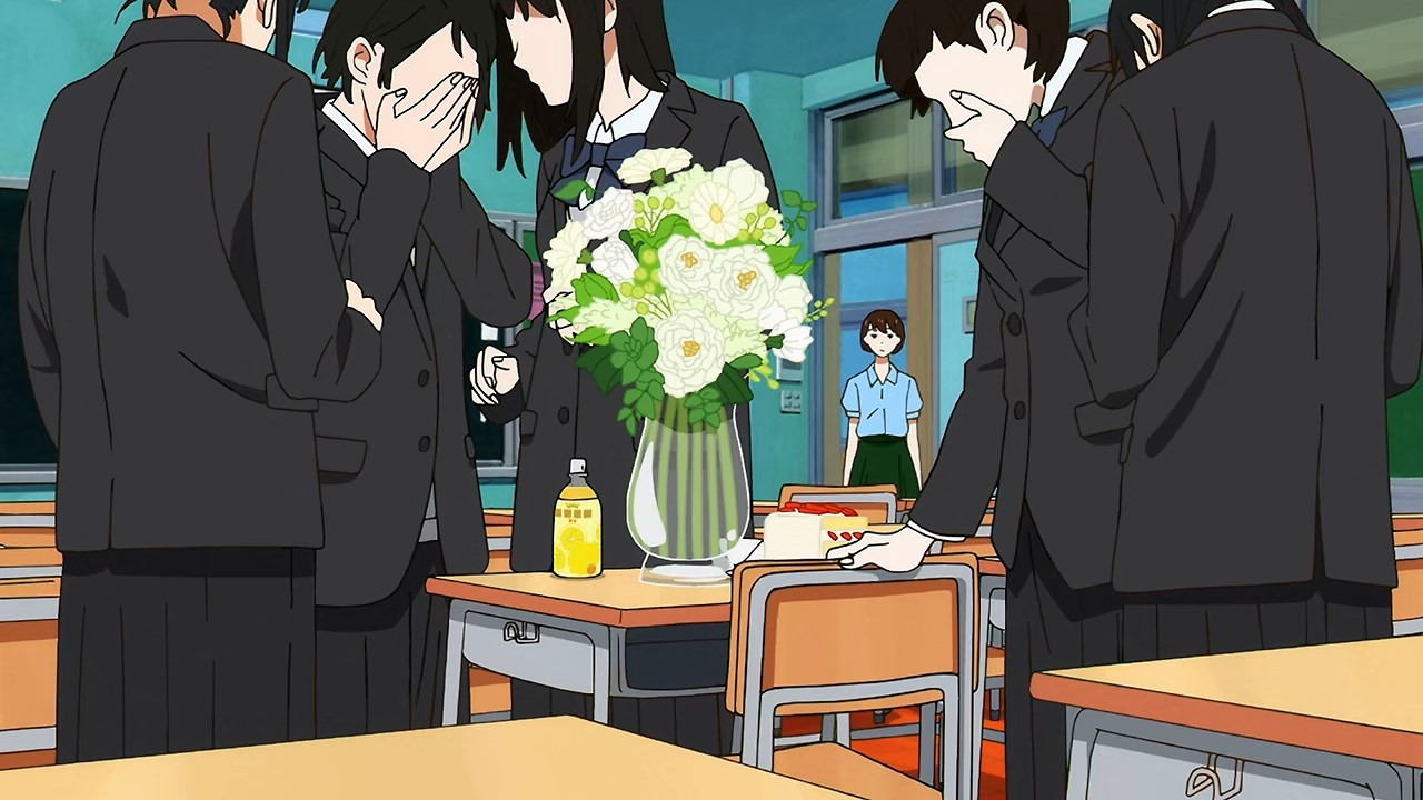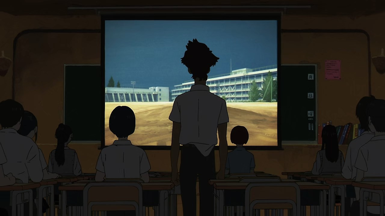 What this all builds up to is Raj and Nagara’s plan to try and splice everyone into the mildewed film of their middle school graduation that Nagara has restored by his magic touch. Hoshi reluctantly agrees to give this a shot and team up, despite his insistence that he knows what will happen. What happens is that everyone does wind up being transported to that place and time – except they can’t interact with anyone there. They’re copies, as Hoshi authoritatively declares – not the “chosen ones”. And what’s more, while the others see versions of themselves all Nozomi sees is her empty desk and a memorial in her name, which is creepy as hell.