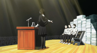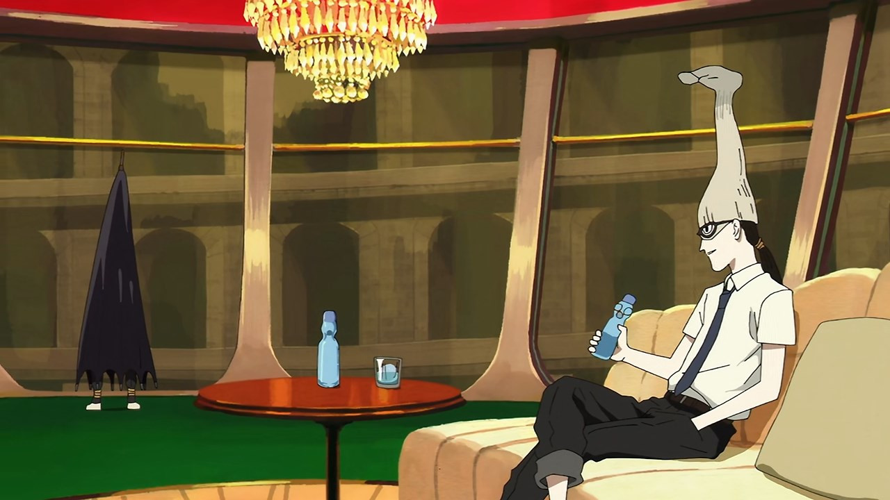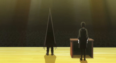 One other thing is that I found Boogiepop and Others tended – not always, but sometimes – to connect with me viscerally in a manner Sonny Boy has not. In a funny sort of way I think this series is the more alien of the two, right down to the behavior of the major characters. But if there is a change, maybe that will come from the splintering of the cast that appears to have taken place. As we join this week, Aki-sensei has apparently been found out as a fraud (as I and others suspected, actually a student). A group of supposed all-stars called Beatnik is trying to pin everything on Nagara to justice. And they send an enforcer called “Convictor” to pass sentence.