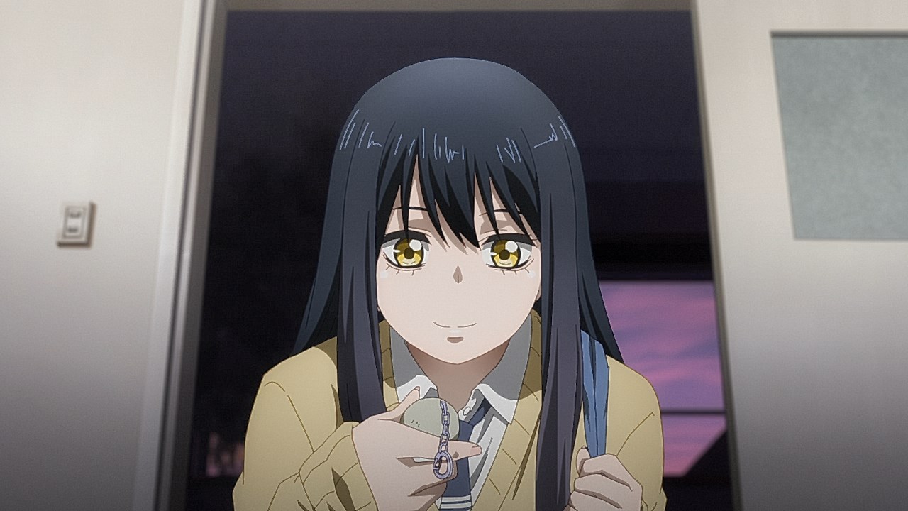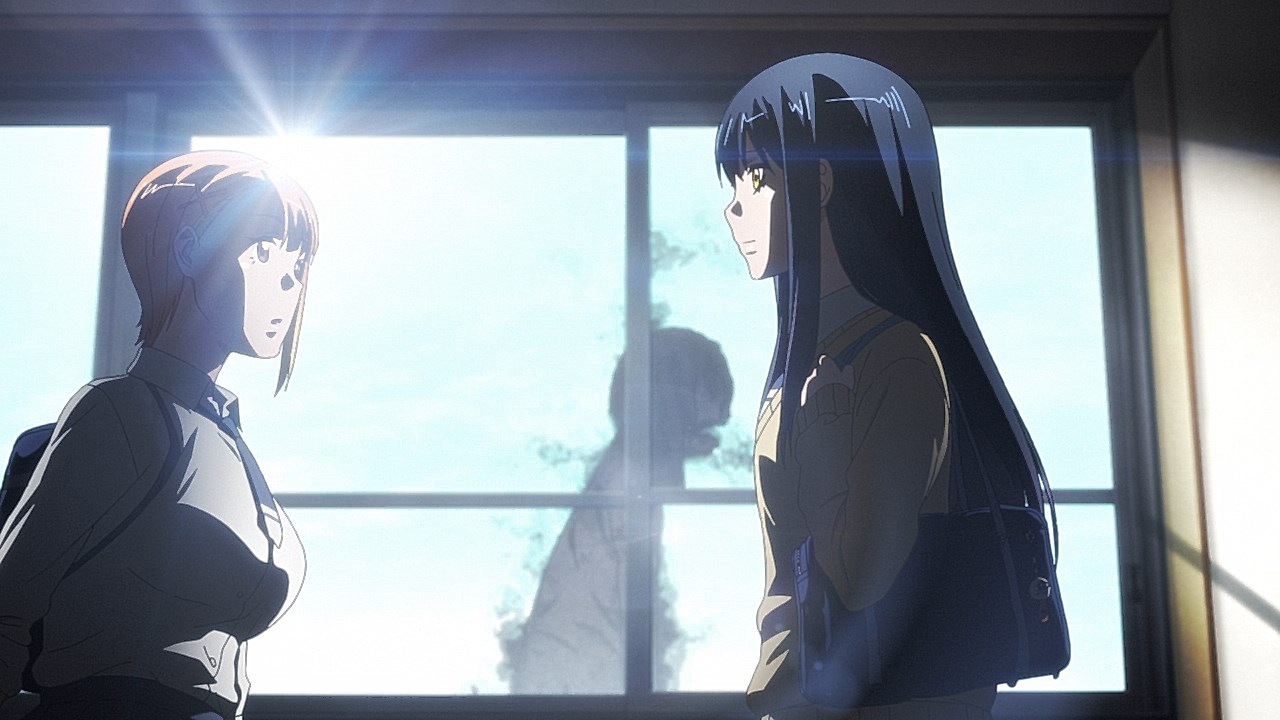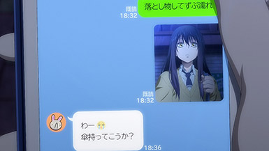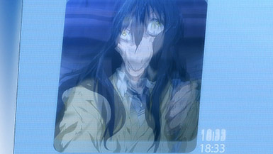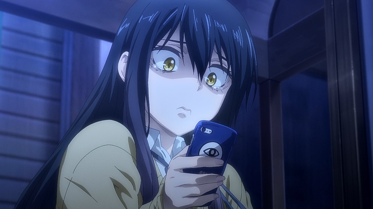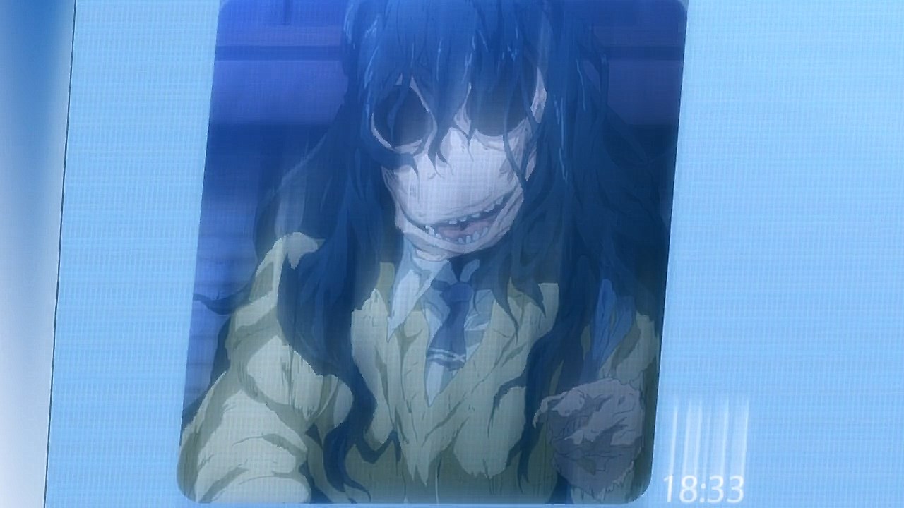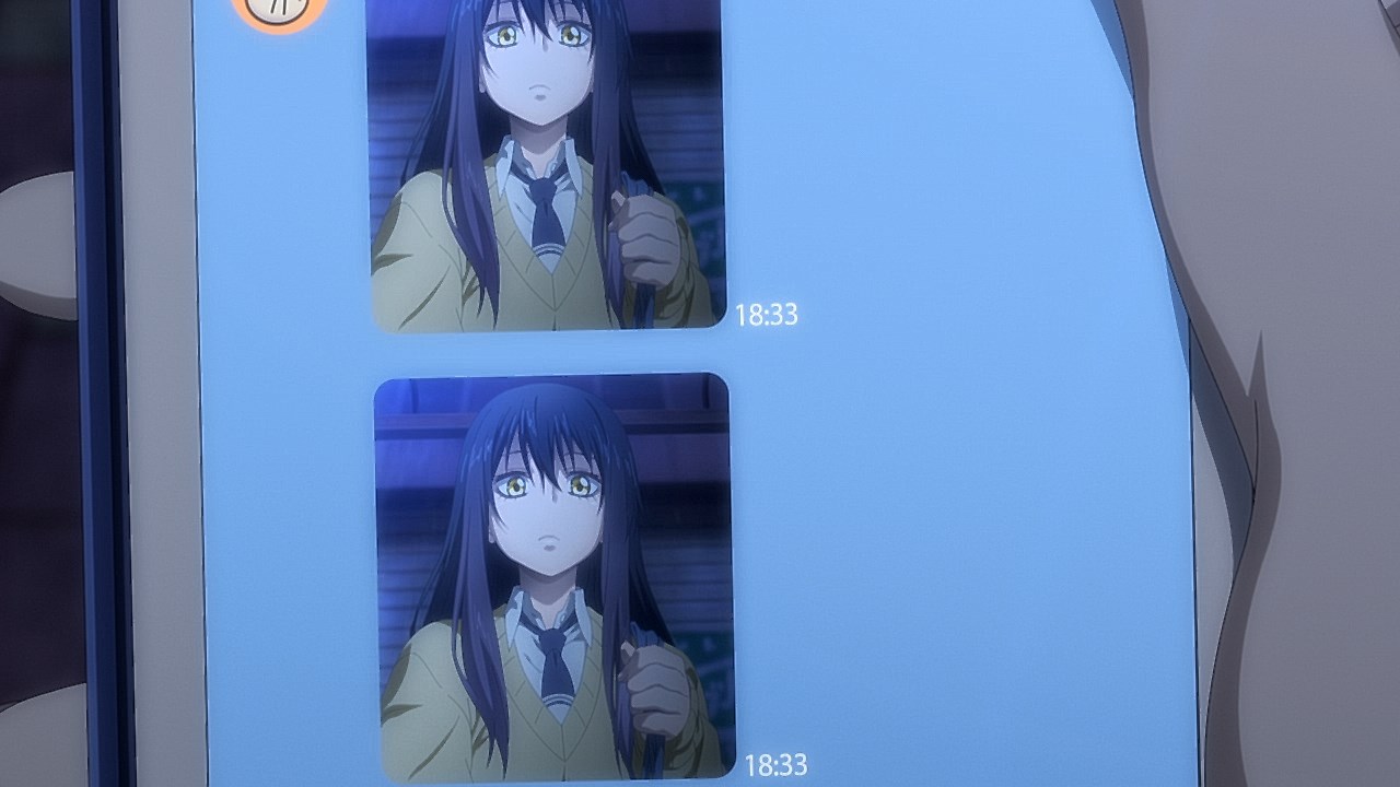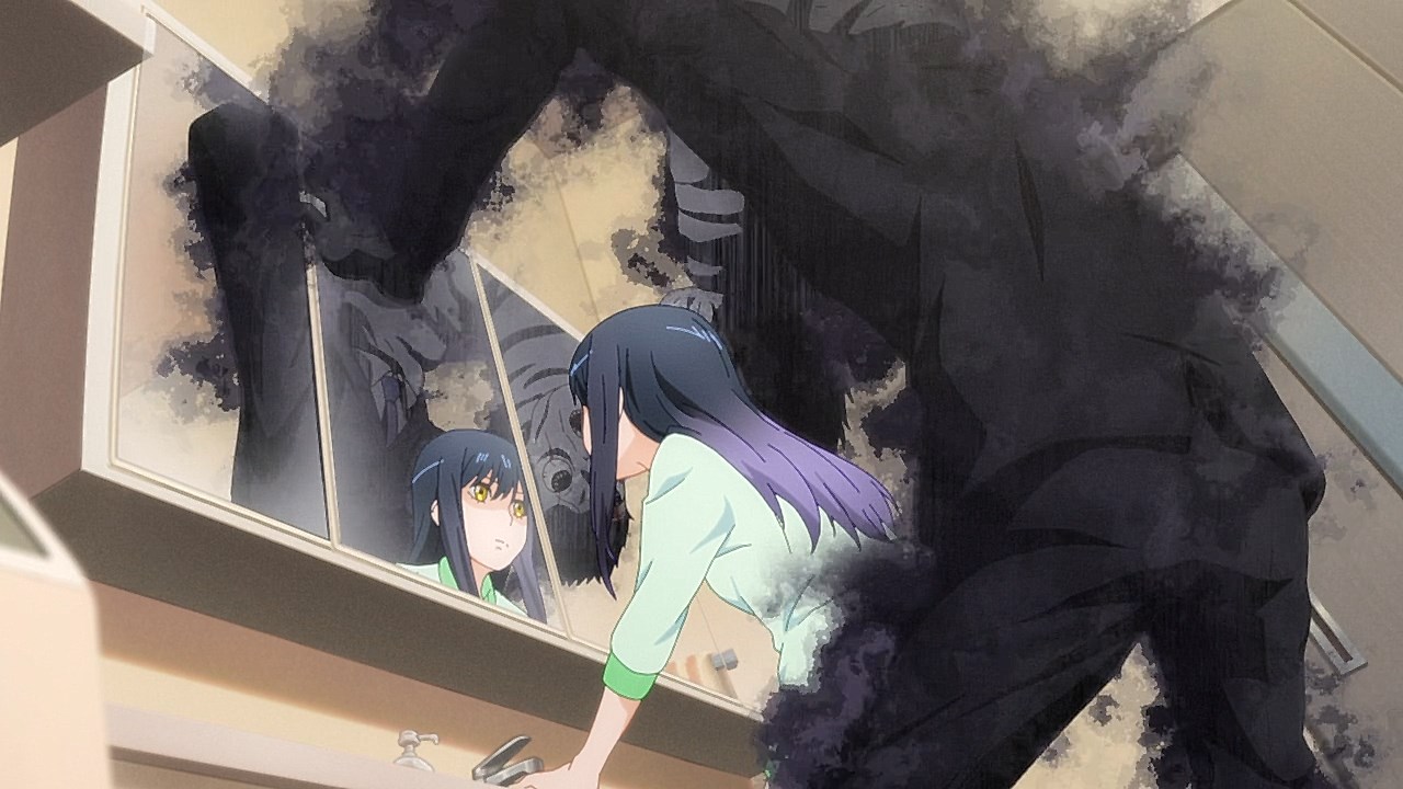Is it while Miko’s carefree, food-loving friend Hana is having a casual conversation about plushies? Not quite. Is it when Miko hears rustling in the bathroom? Not quite. Is it when Miko finds her charm in an empty classroom as the lights flicker? Close, but no cigar. But because of the gradual build-up, it makes it all the freakier when we see Miko’s SMS glitching out due to spiritual interference as the episode’s first ghost gets right up in the camera’s face.