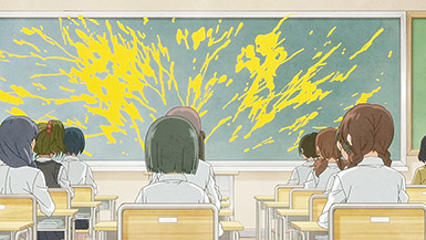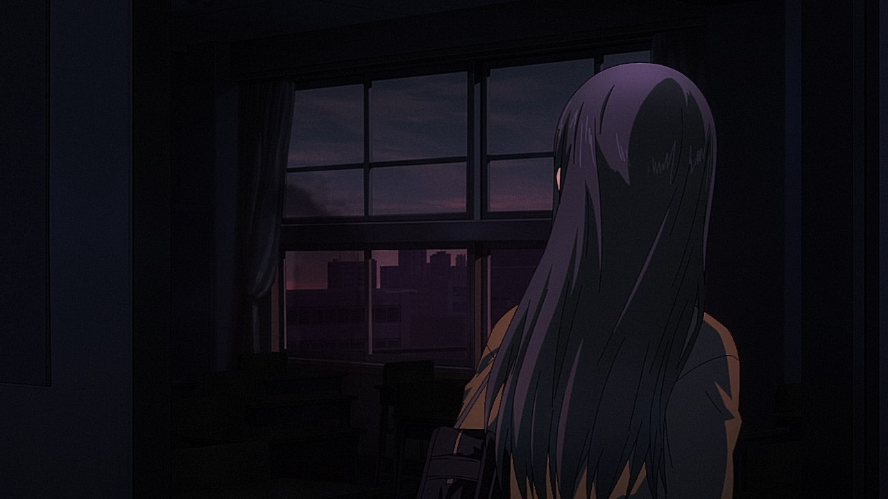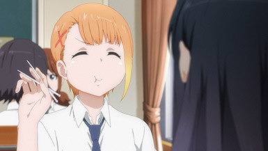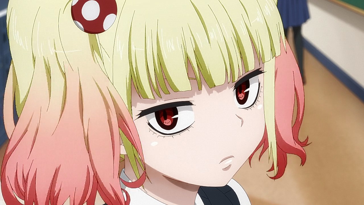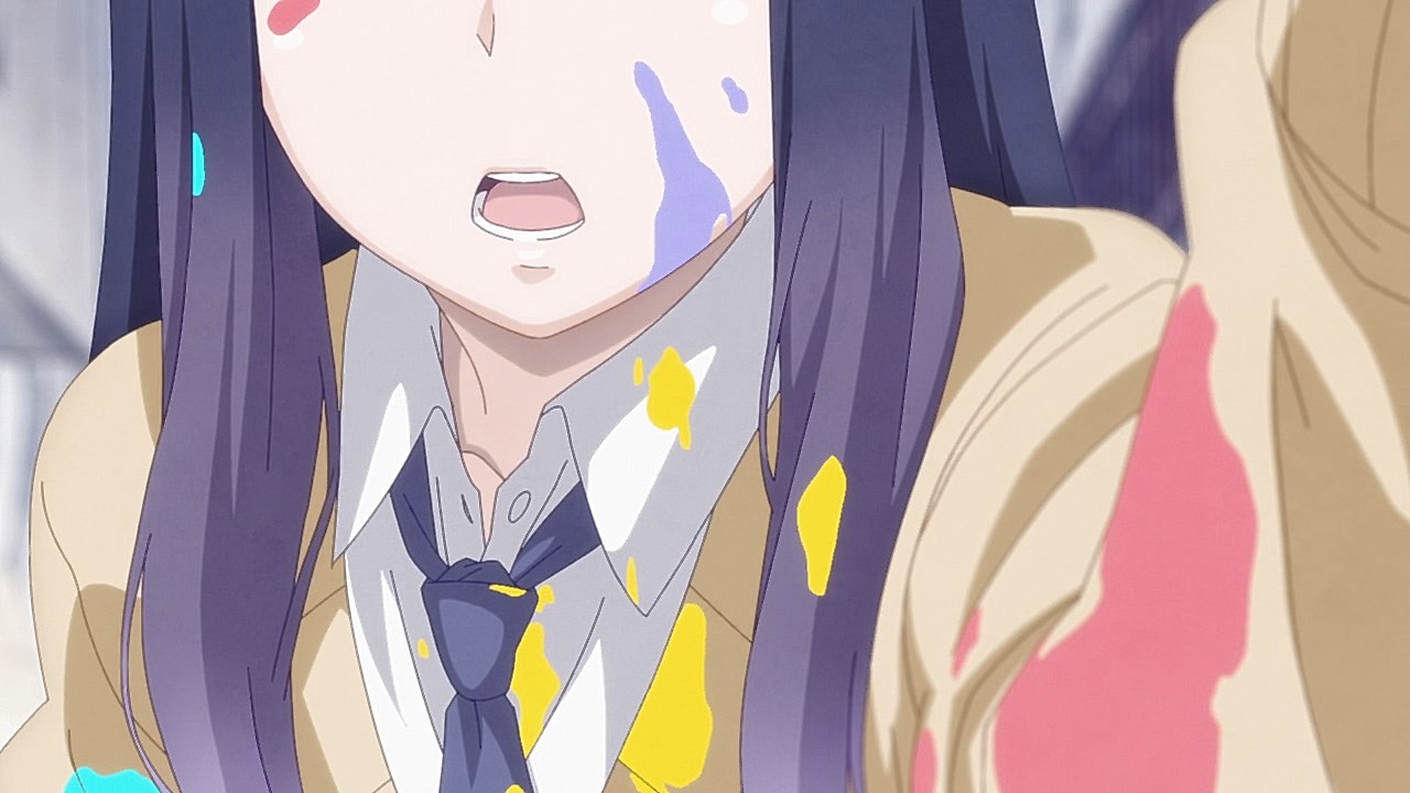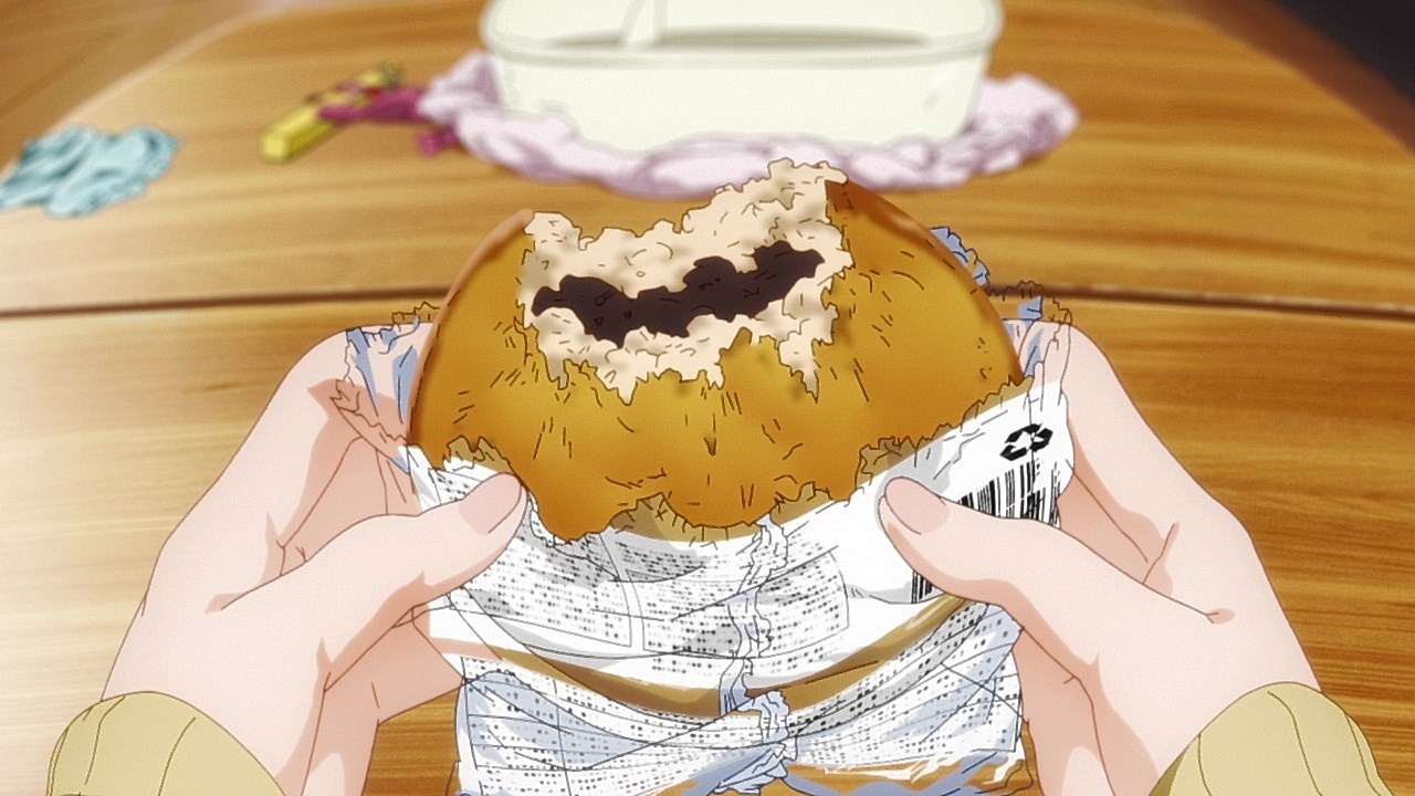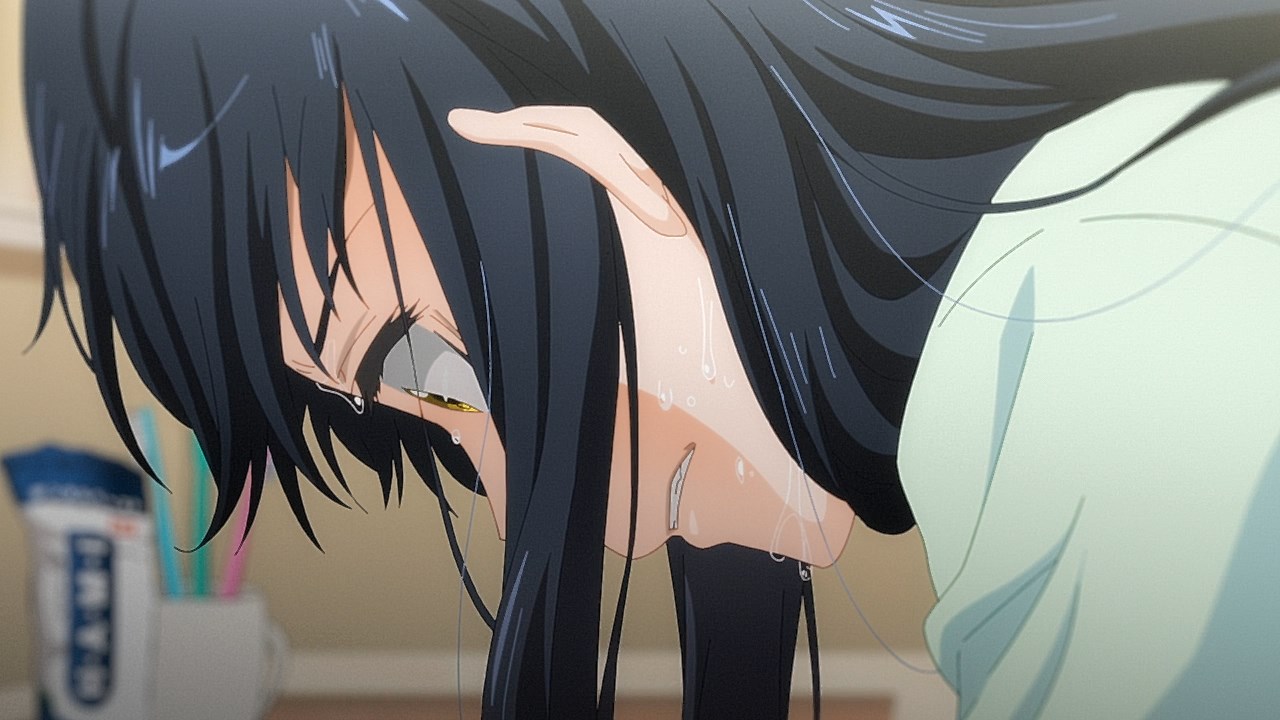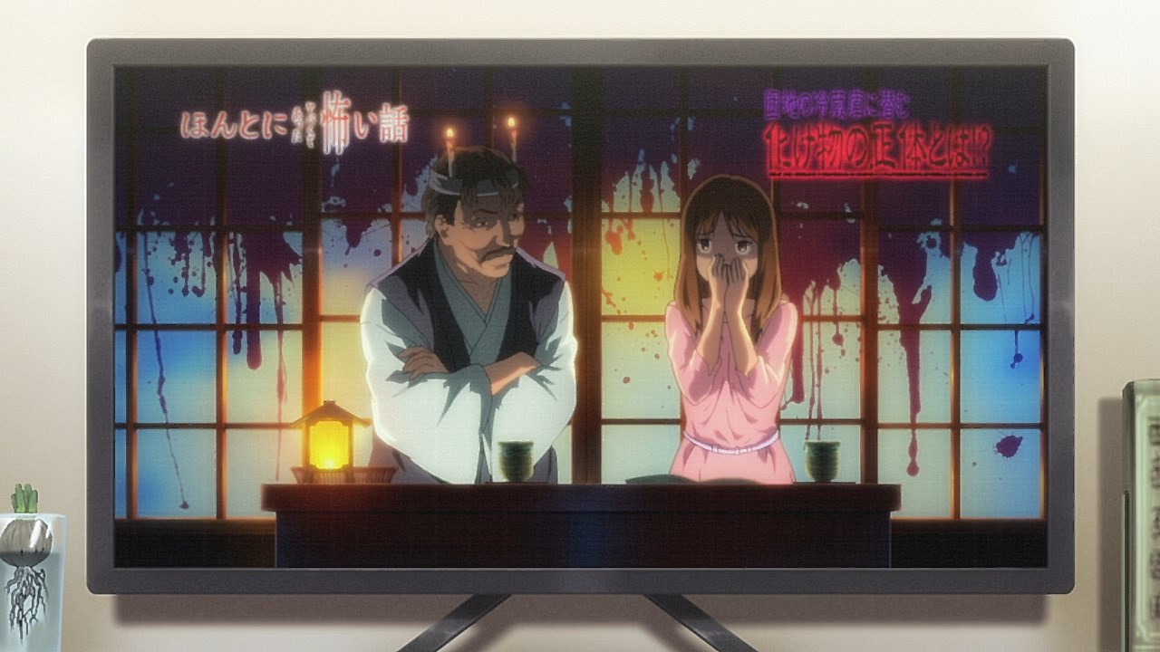 Is it while Miko’s carefree, food-loving friend Hana is having a casual conversation about plushies? Not quite. Is it when Miko hears rustling in the bathroom? Not quite. Is it when Miko finds her charm in an empty classroom as the lights flicker? Close, but no cigar. But because of the gradual build-up, it makes it all the freakier when we see Miko’s SMS glitching out due to spiritual interference as the episode’s first ghost gets right up in the camera’s face.